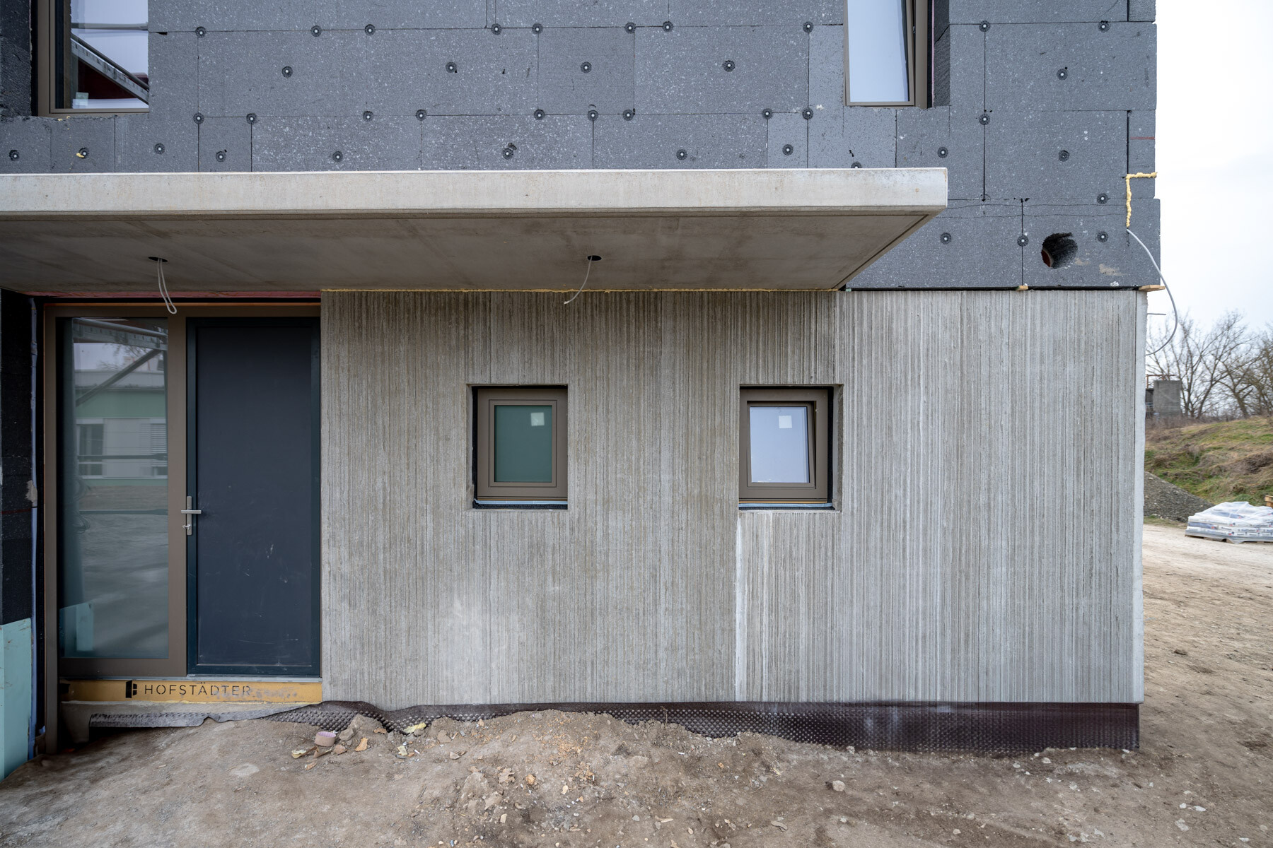 „A beton felhasználhatóságának sokféleségét – tette hozzá – nem mindennapi megoldásokkal próbáljuk bemutatni házunkon, mint például belső hőszigetelésű, strukturált felületű falszerkezet, a gépészeti rendszer részét képező hűtő-fűtő fal- és födémfelületek a látszóbeton beltéri és kültéri elemek.” Az elmúlt hónapokban a szerkezetépítést követően további Leier termékek kerültek az épületbe, így mára termékeik kiemelten széles skáláját mutathatja be az épület az érdeklődőknek. Ezek között is érdemes szót ejteni az ház körüli mintakertről, amely majd a Leier Kaiserstein díszburkolatelemeket mutatja be (térkő, térburkoló lap, kerítés), míg a Durisol zajvédőfalat, illetve Durisol magaságyást, amelyeket a végső homlokzati kialakítás után építenek be.
