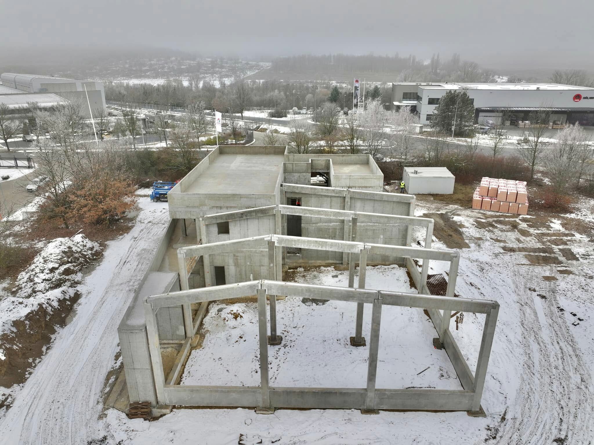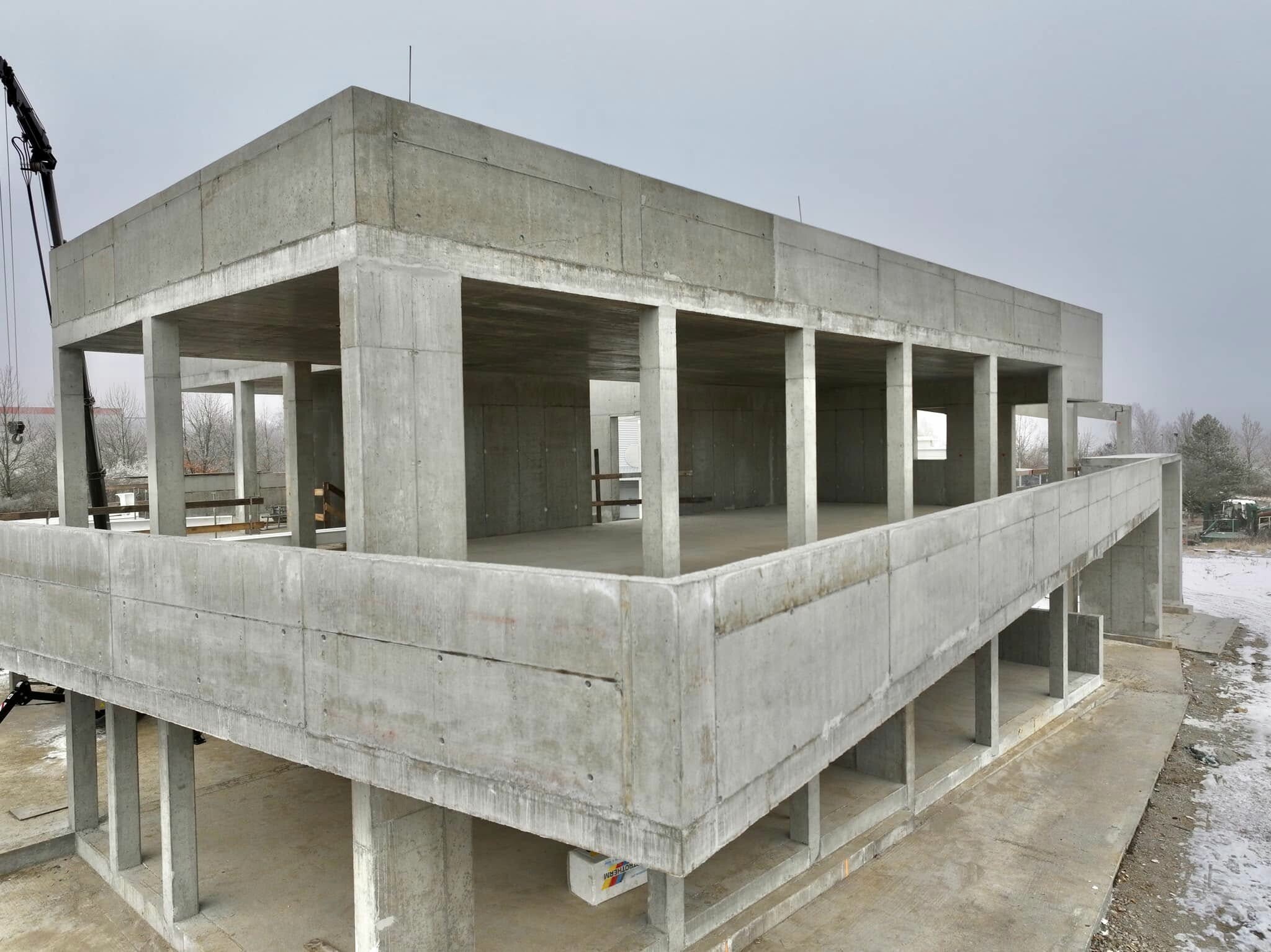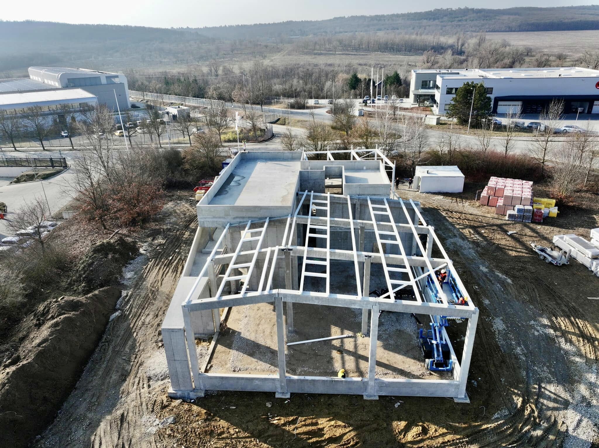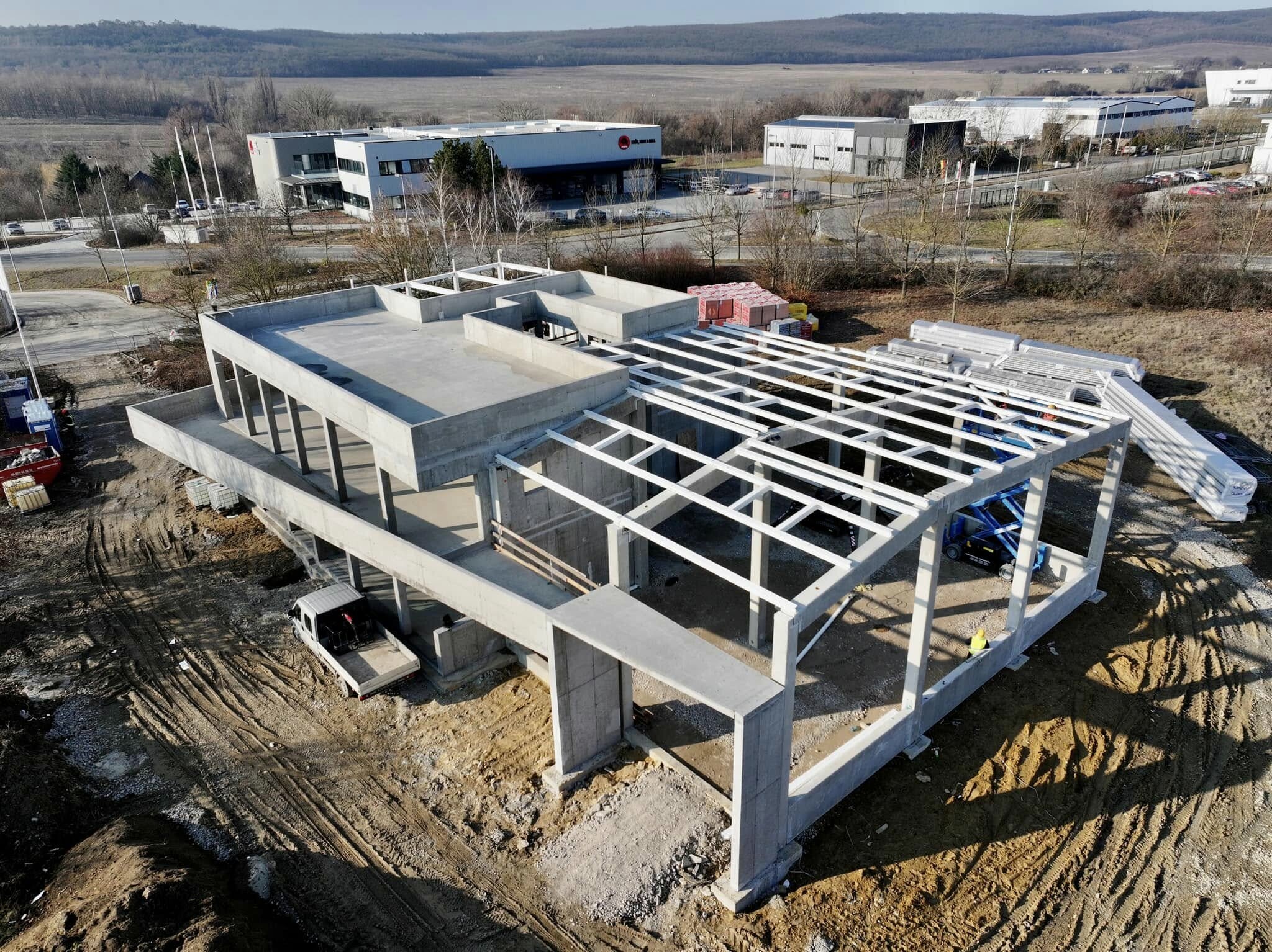 Beszámolójuk képeiből jól látszik: a 6532 m2-es telekre kerülő 700 m2-es épület vasbeton szerkezeteit, benne pedig a 400 m2-es kétszintes irodát és a 300 m2-es kapcsolódó raktárt eltérő szerkezettel hozzák létre.