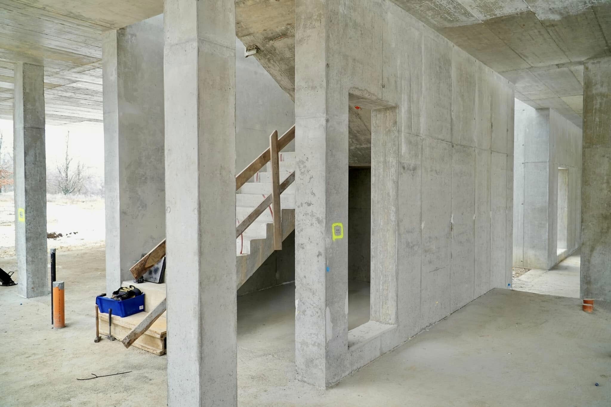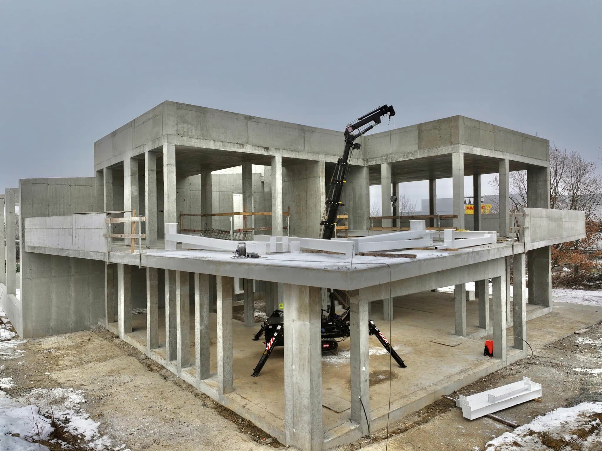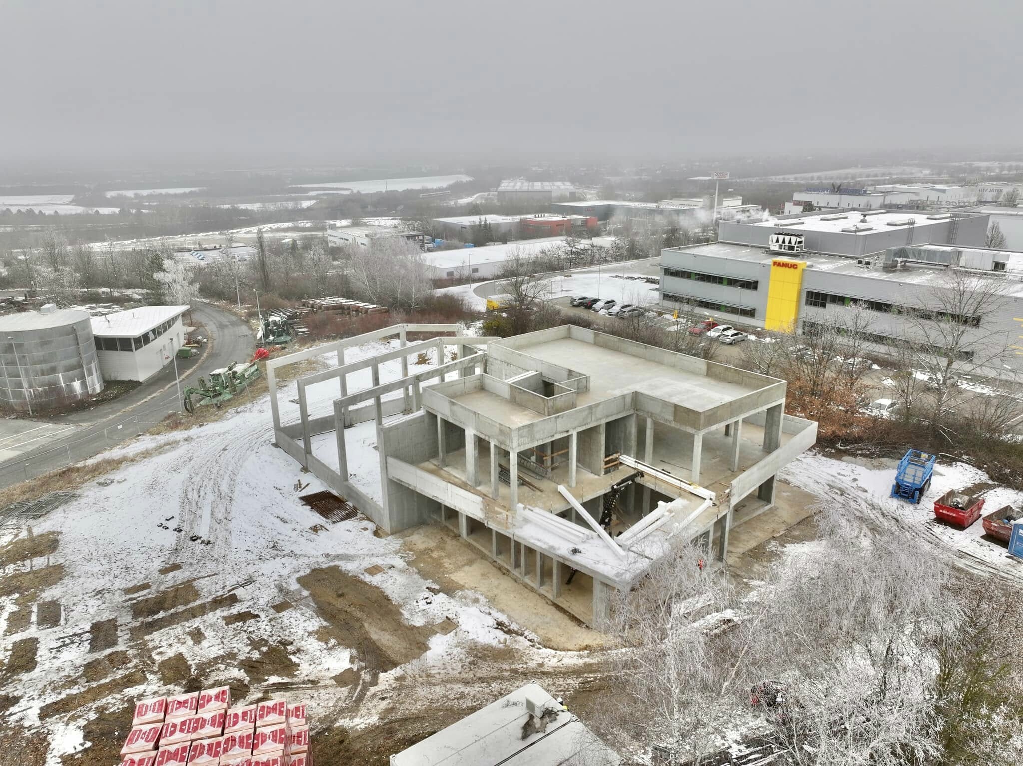 Beszámolójuk képeiből jól látszik: a 6532 m2-es telekre kerülő 700 m2-es épület vasbeton szerkezeteit, benne pedig a 400 m2-es kétszintes irodát és a 300 m2-es kapcsolódó raktárt eltérő szerkezettel hozzák létre.