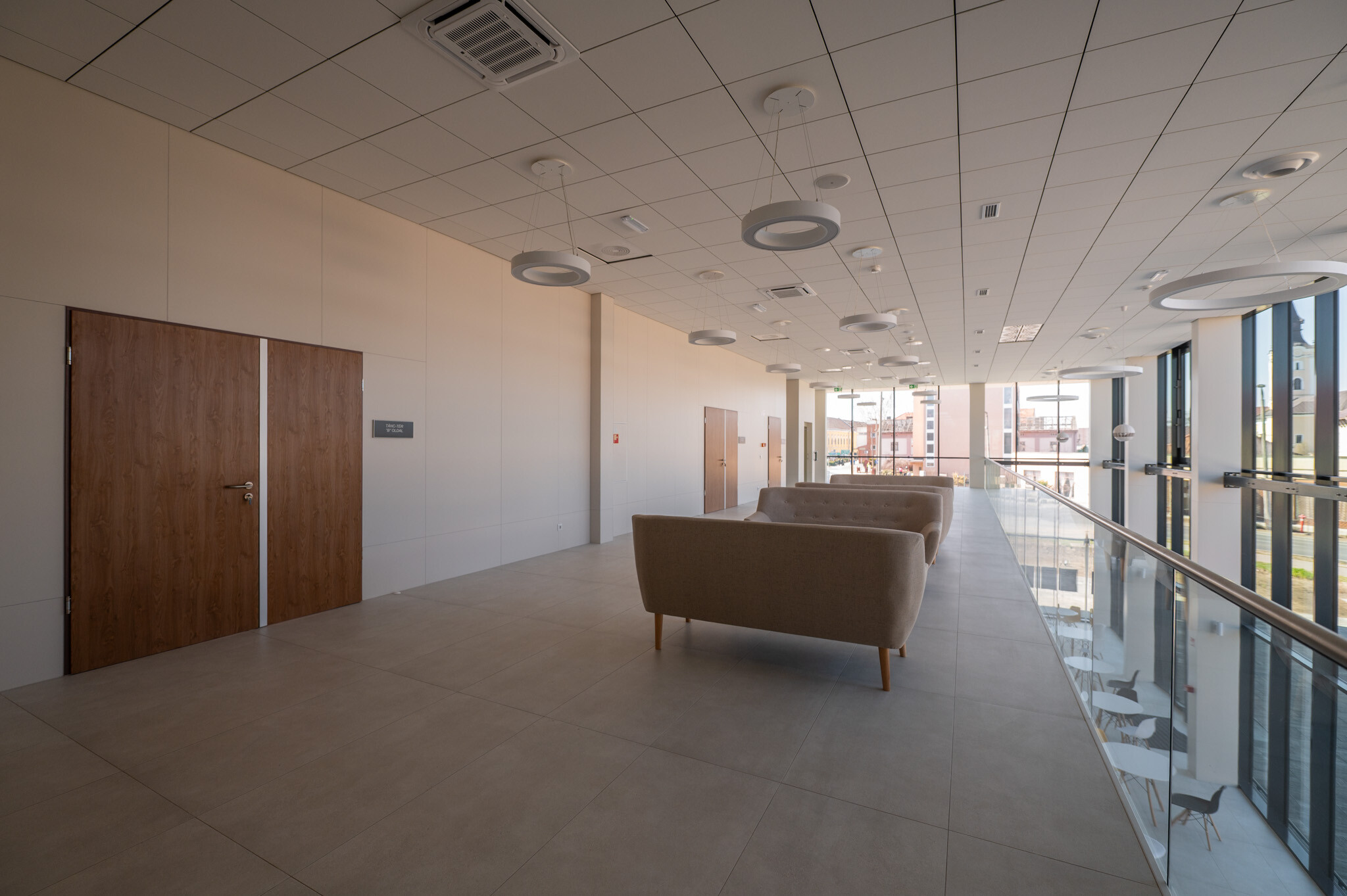 Nagykálló új konferenciaközpontjának emeleti részén 150 fő befogadására alkalmas rendezvényterem készült, amelyhez öltözők és raktárak kapcsolódnak. Az épületgépészeti berendezések szintén az emeleti részen kaptak helyet, a légtechnikai gépek és a hőszivattyú pedig a lapostetős épület tetőszerkezetére került csakúgy, mint a napelemek.