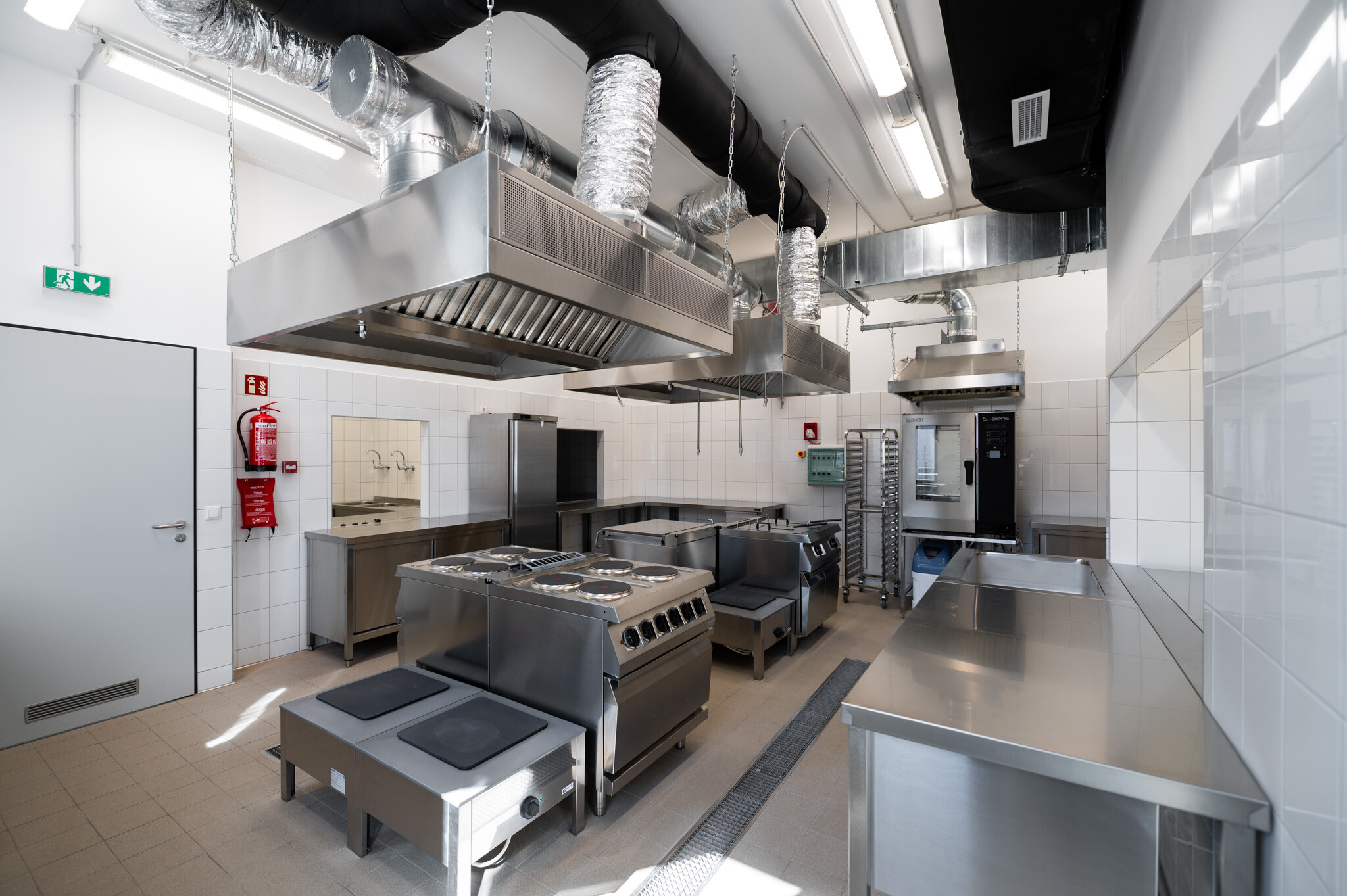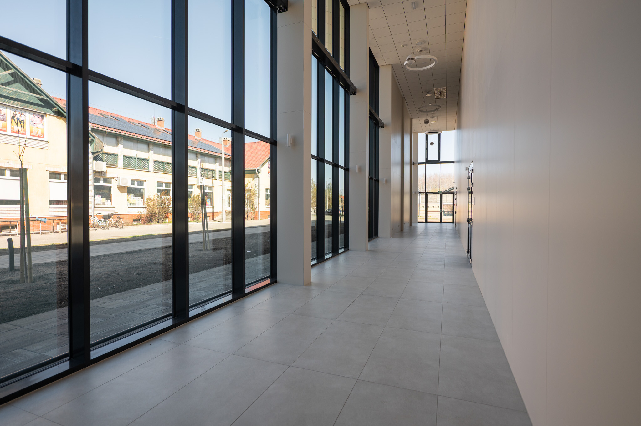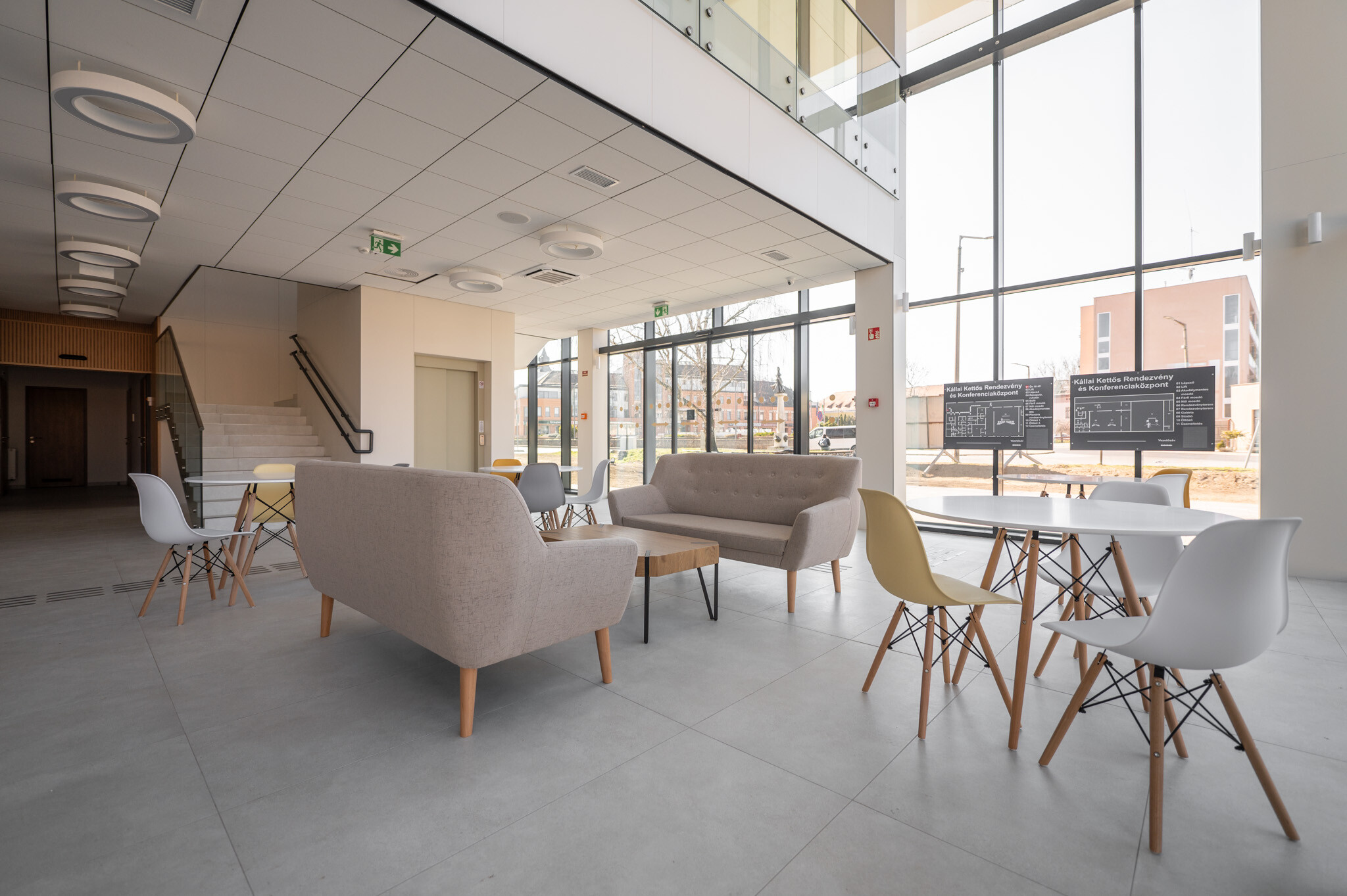 „Személyfelvonó biztosítja a szintek közötti akadálymentes közlekedést, ahol a kávézó előtti vendégtérben szerződésünk szerint elhelyeztük a székeket, asztalokat és kanapékat, de ugyanígy a földszinten kialakítottuk a rendezvények kiszolgálására alkalmas főzőkonyhát is” – részletezte Héver Gábor. A kétszintes épület földszintjén, a 300 fő befogadására alkalmas, plenáris rendezvényterem művészeti előadások, koncertek és városi rendezvények; a 252 fős mobil lelátórendszer összezárásával pedig akár bálok, zenés-táncos rendezvények lebonyolítására is alkalmas lesz.