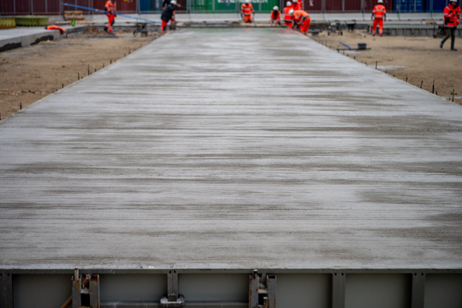 A munkaterületre keverőtelepről szállítják a betont, eddig 10 770 köbméter leszállítása és bedolgozása valósult meg.
