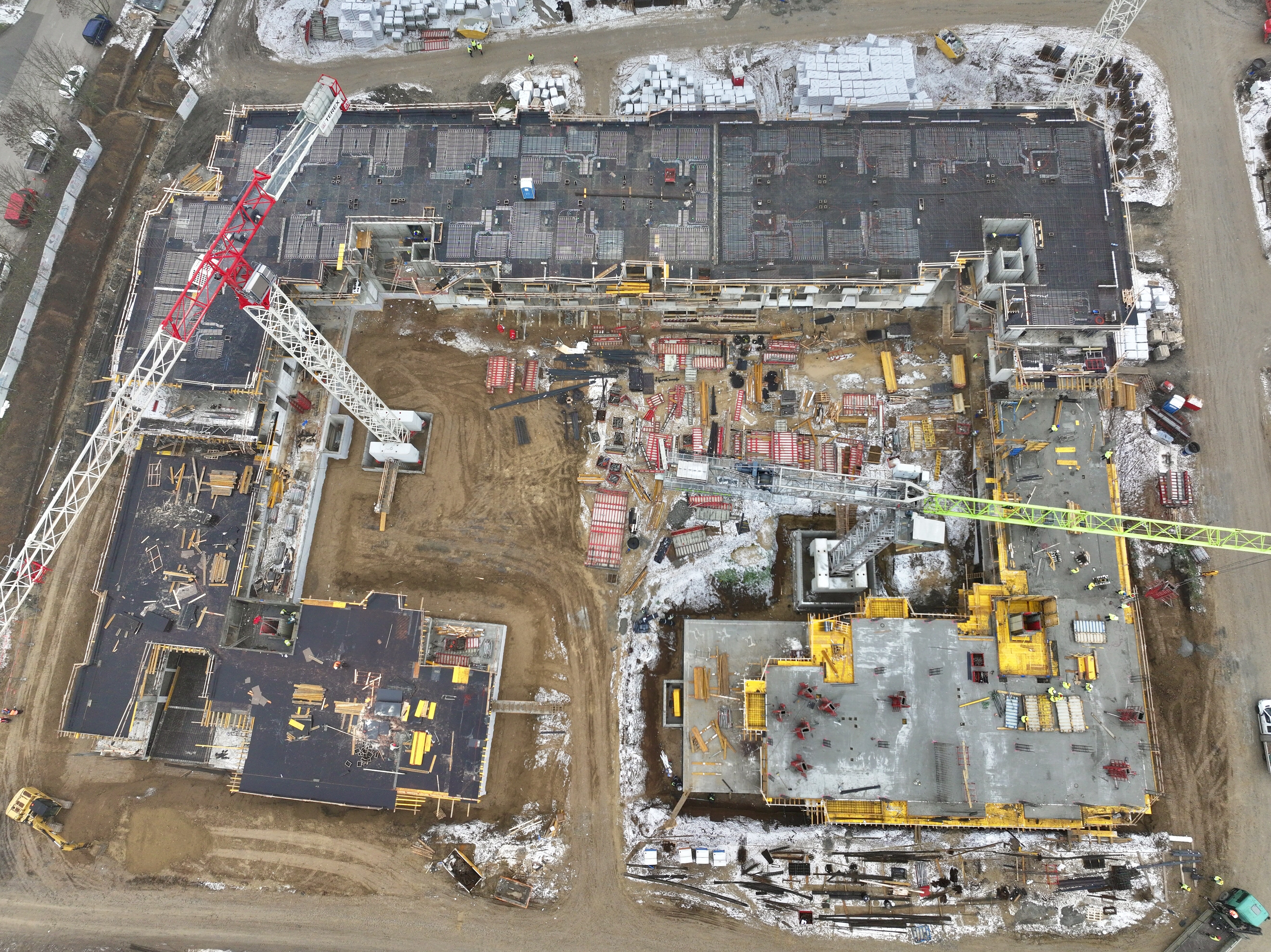 Ahogyan a február végén készült videófelvételen is látszik, mindhárom épület elkezdett kiemelkedni a földből, a projekt egyre látványosabban fest. Az építményeken különböző stádiumban tart a kivitelezés.