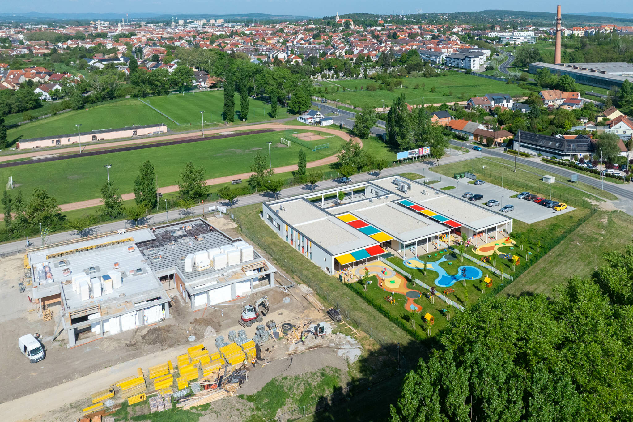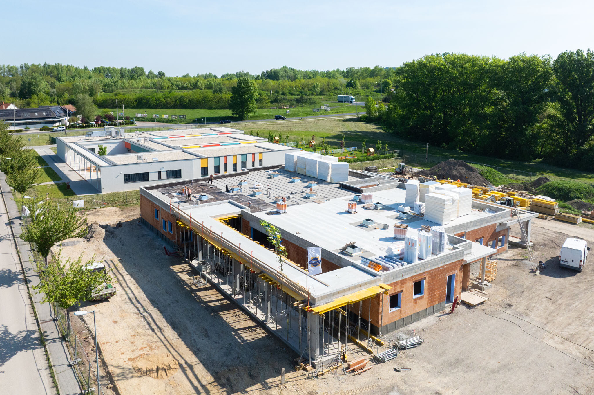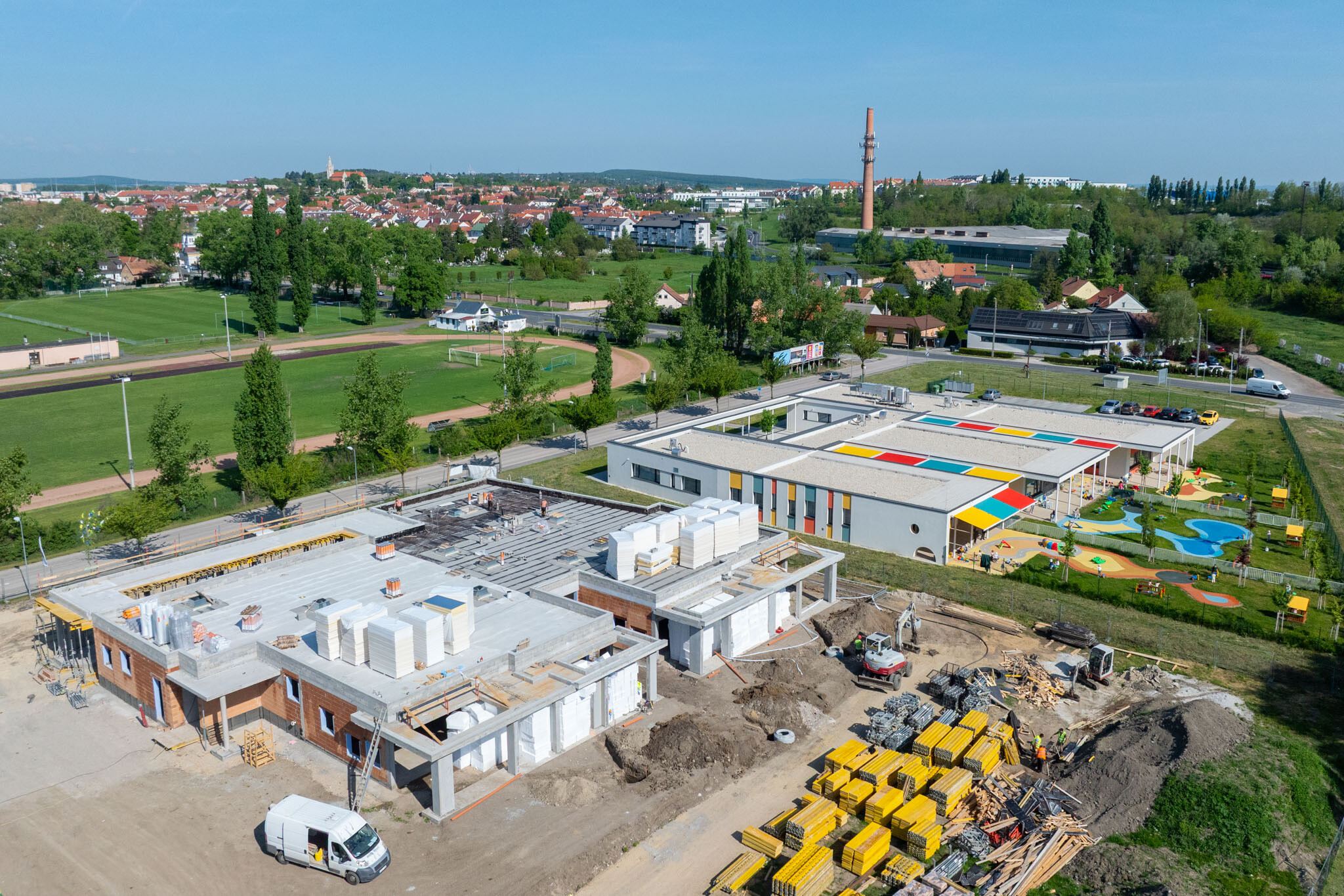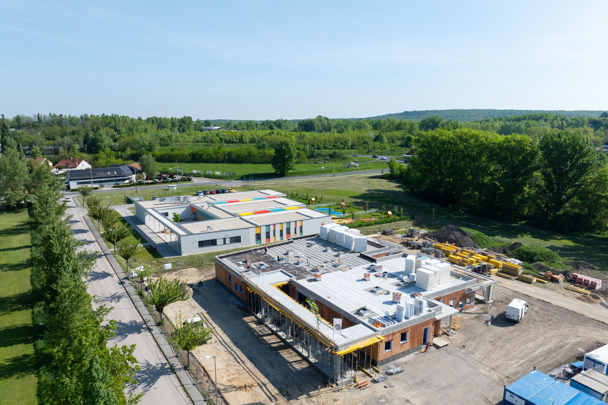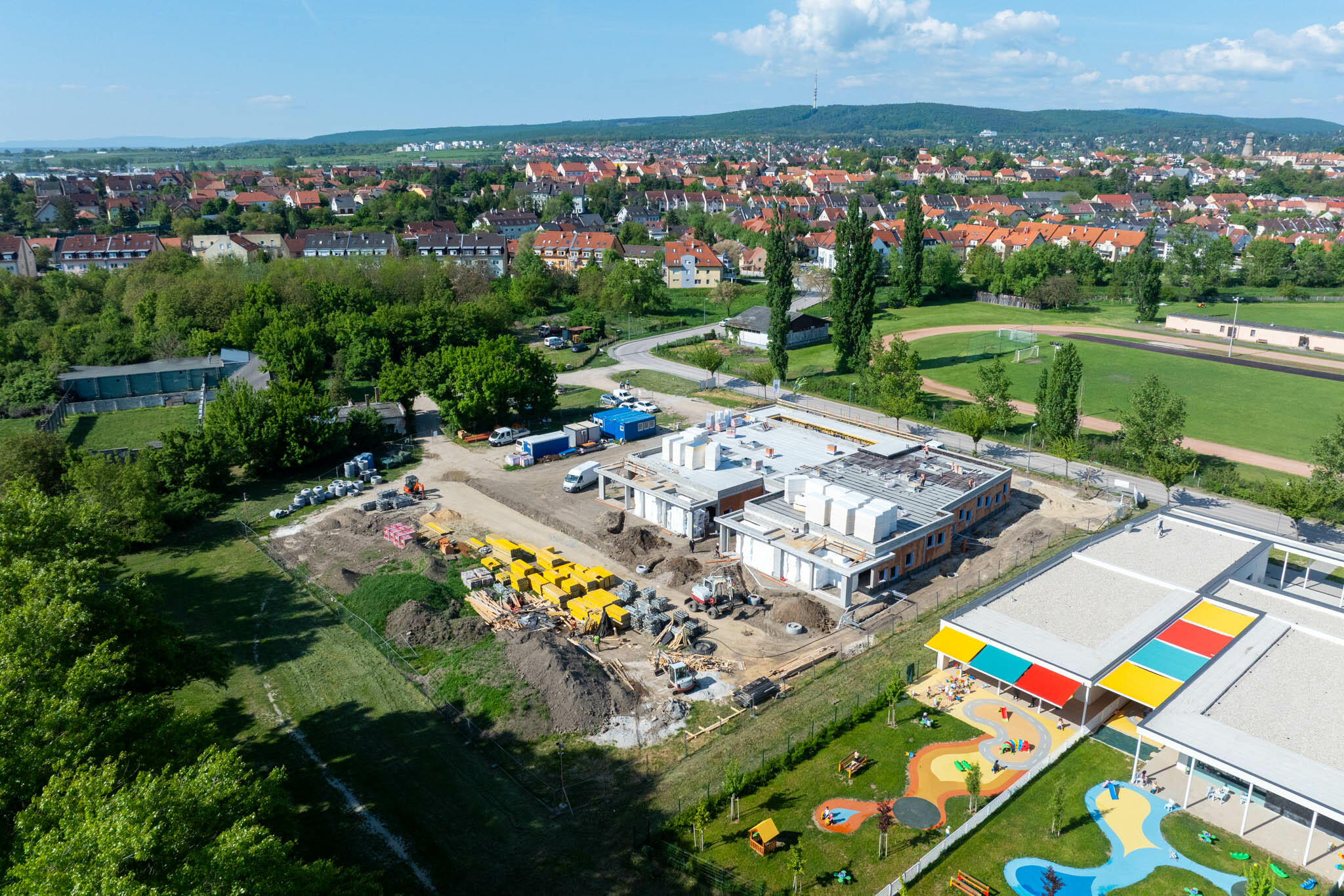 Sopron új óvodája mára szerkezetkész, elindultak a belső válaszfalazási munkák, a tetőszigetelés, sőt, a gépészeti és villamos alapszerelések is a közműépítéssel együtt – tudtuk meg a projektvezetőtől. A kivitelezés a szakipari munkákkal folytatódik, emellett májusban az a cél, hogy az ablakbeépítések, a tetőszigetelések és az árnyékolók beépítése is megtörténjen, ezzel együtt pedig az elsődleges feladat a beázásmentesség elérése. Ezután elindulhatnak a belsőépítészeti munkák is.
