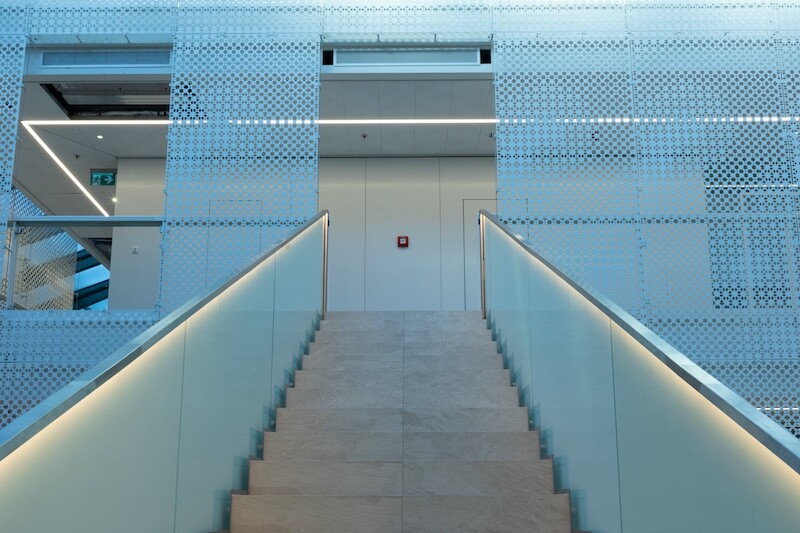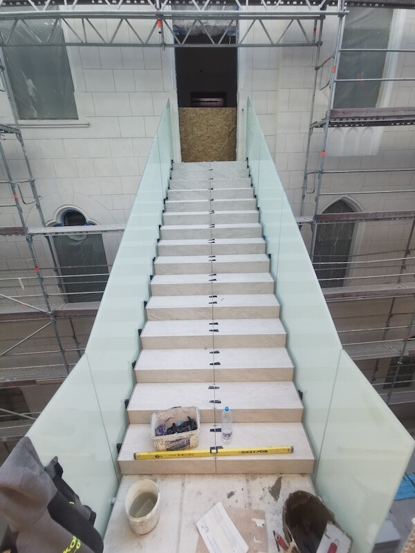 A feladat változatos volt, a gyakran alkalmazott 60x60 cm-es lapokon túl 60x120 és 120x120 cm-es nagylapok fektetésére is sor került, de az igazi kihívást a lebegő lépcsők kialakítása jelentette a szakkivitelezők számára. A 10-20 méter magasan, kétoldalról megtámasztott, de a közepén „lebegő” lépcsőket üzemben előregyártott, gérbevágott, műgyantával ragasztott elemekből kellett elkészíteni, ezt kellett leburkolni és kétoldalt rozsdamentes e-profillal lezárni, ehhez milliméter pontos konszignációra volt szükség.