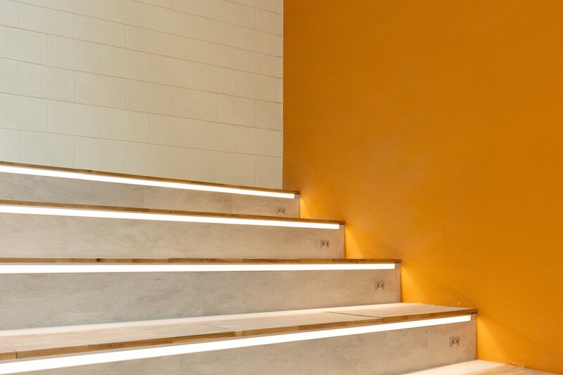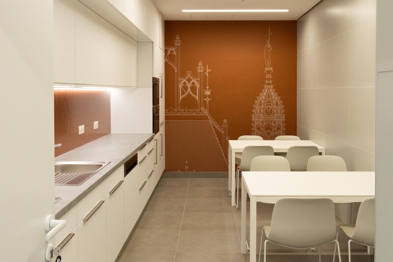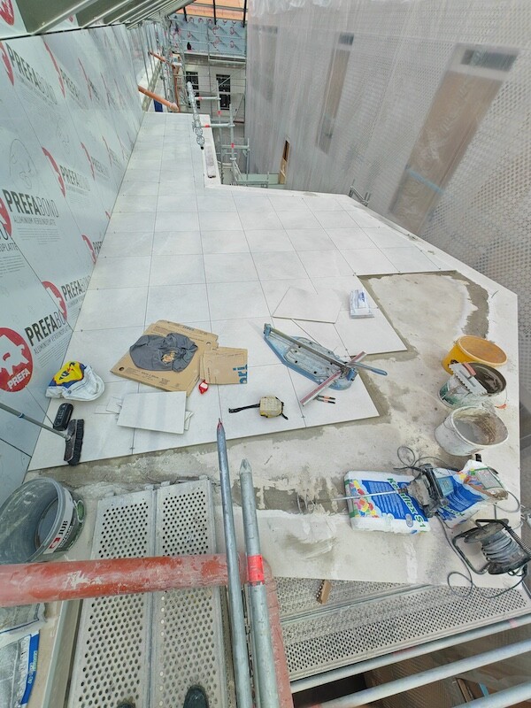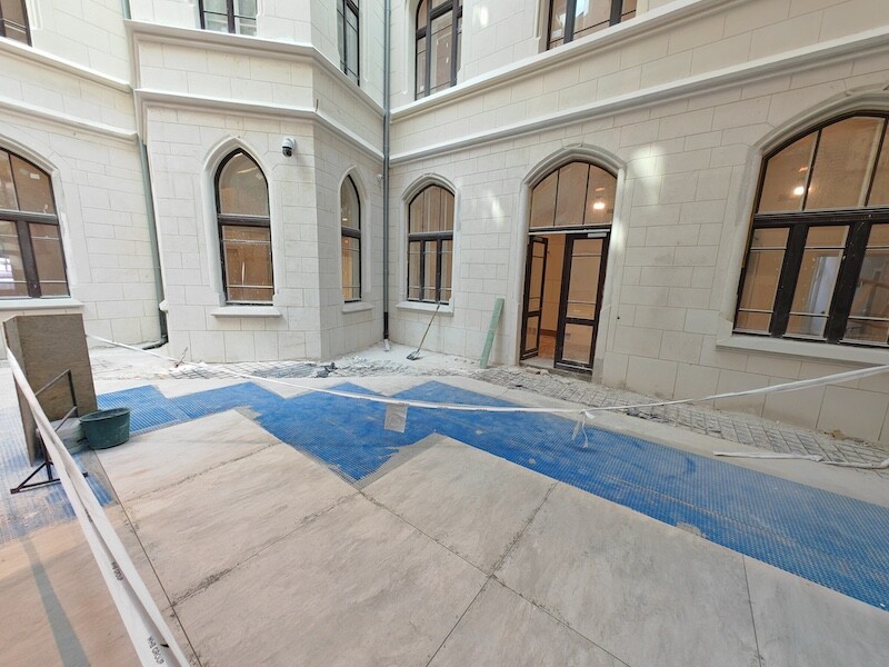 Az épületben a Szerva-Bár Kft. szakkivitelező két területen is végzett melegburkolási munkákat a Mapei termékeit használva: