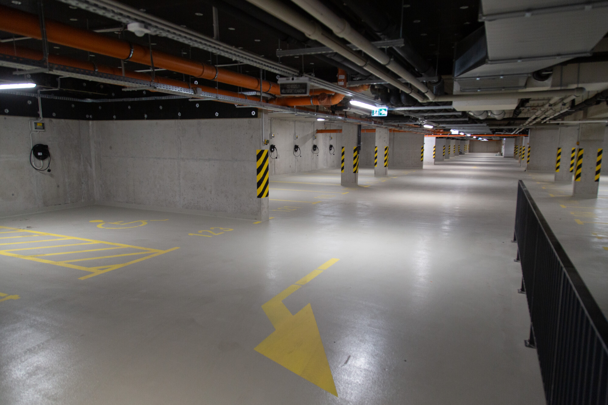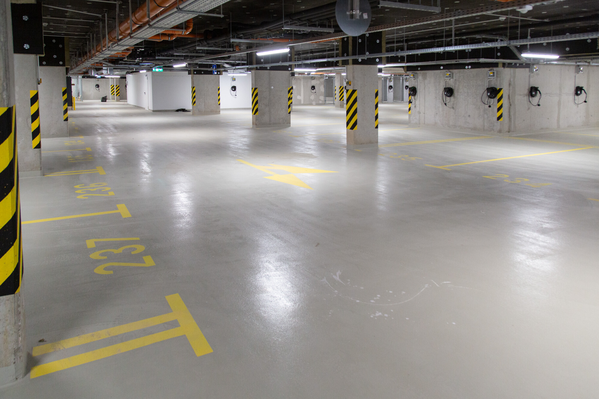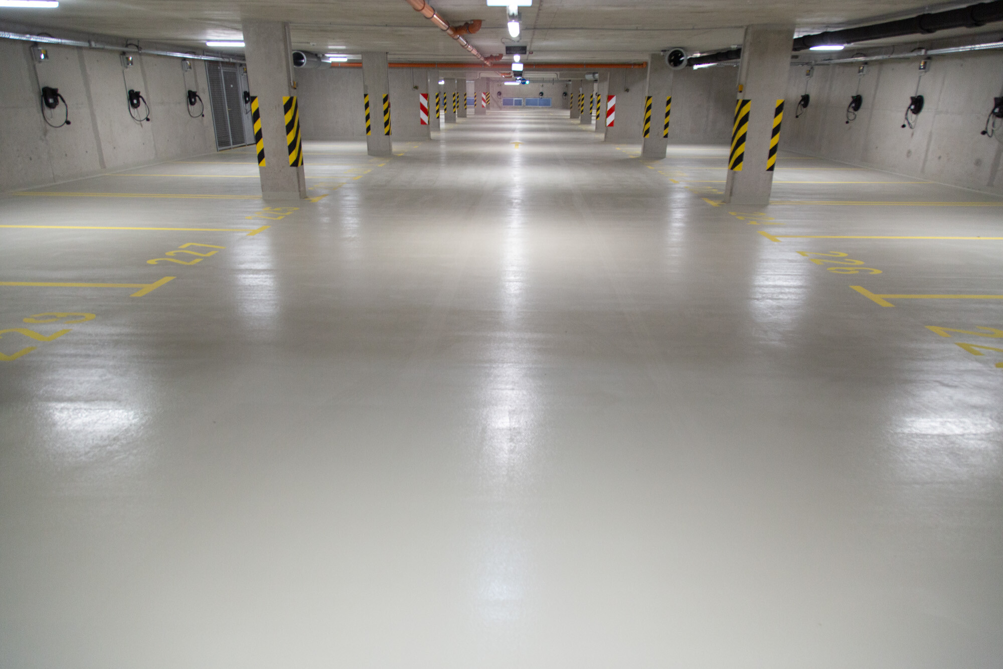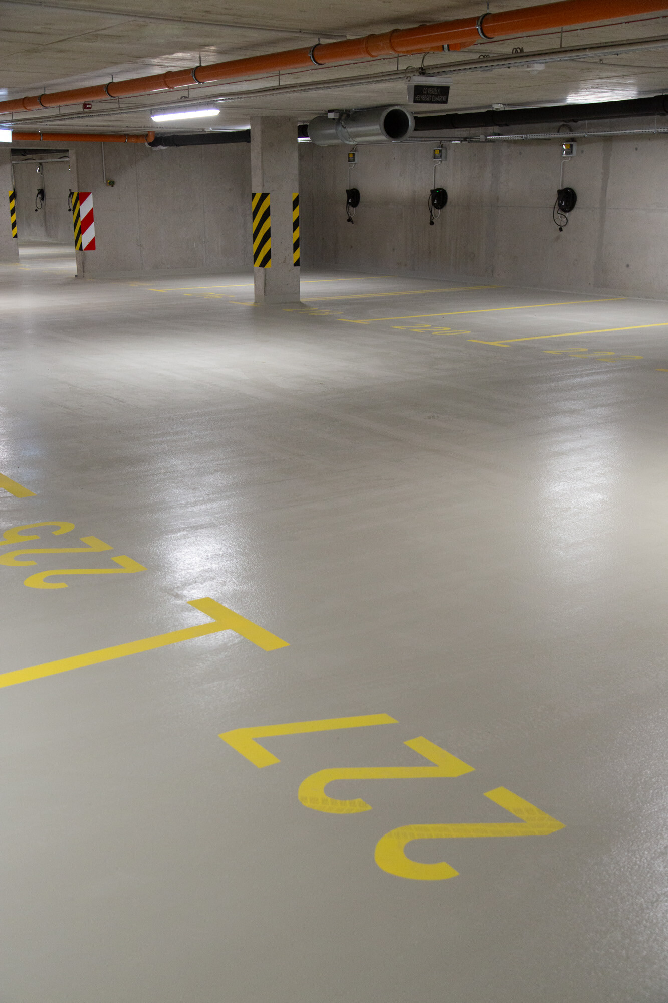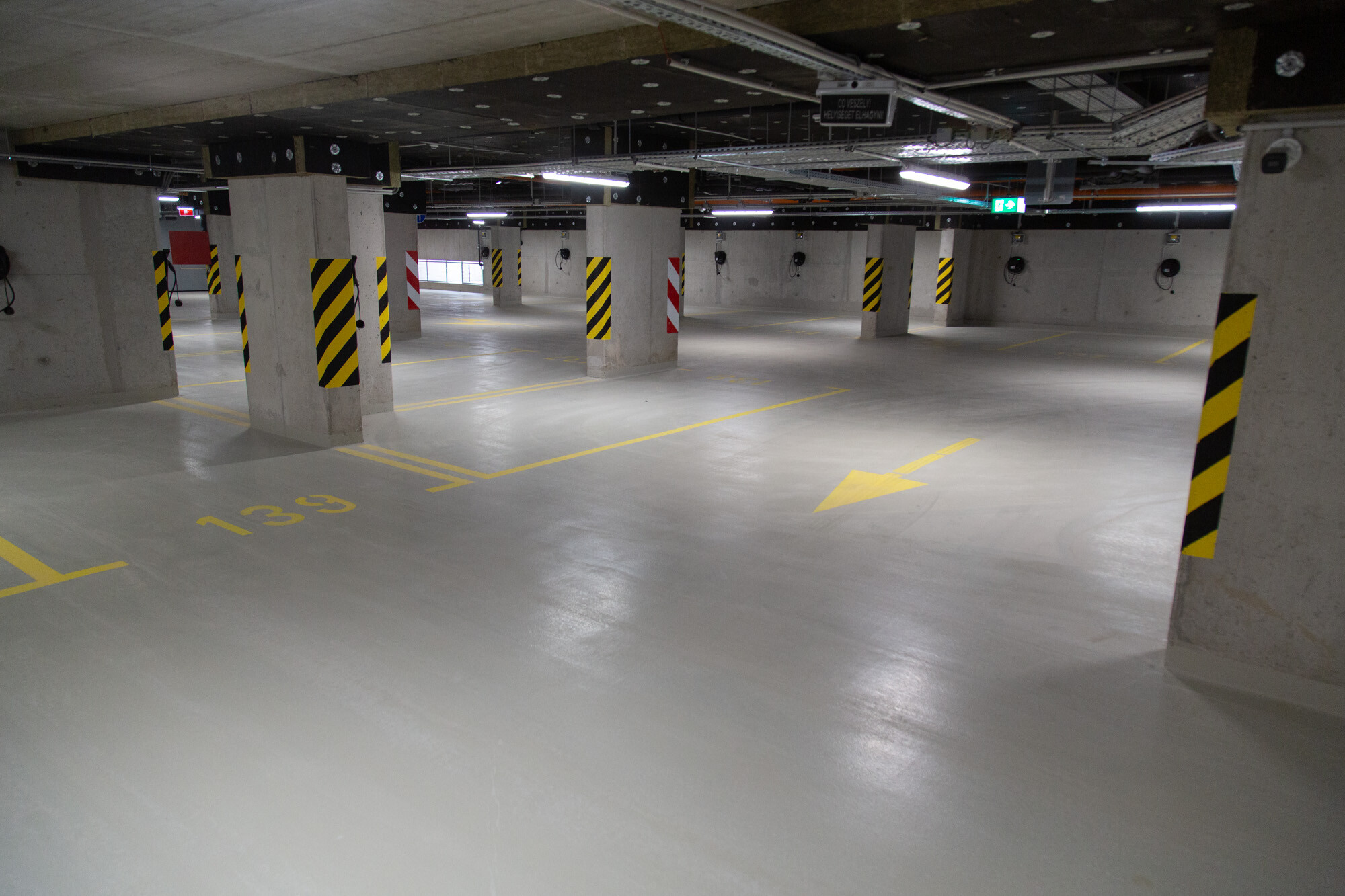 A mélygarázsban, a mechanikusan erősen igénybe vett, járműközlekedéssel leginkább terhelt részeken a MAPEFLOOR PARKING SYSTEM RHT felhasználásával többrétegű, epoxi felületi bevonatrendszert alakítottak ki. A többrétegű, fugamentes, csúszásmentes epoxi rendszer teljesíti az OS 8-as osztály követelményeit (MSZ EN 1504-2) az útfelületek bevonatára nagy terhelésű forgalomnak kitett autóparkolók felületének bevonására.