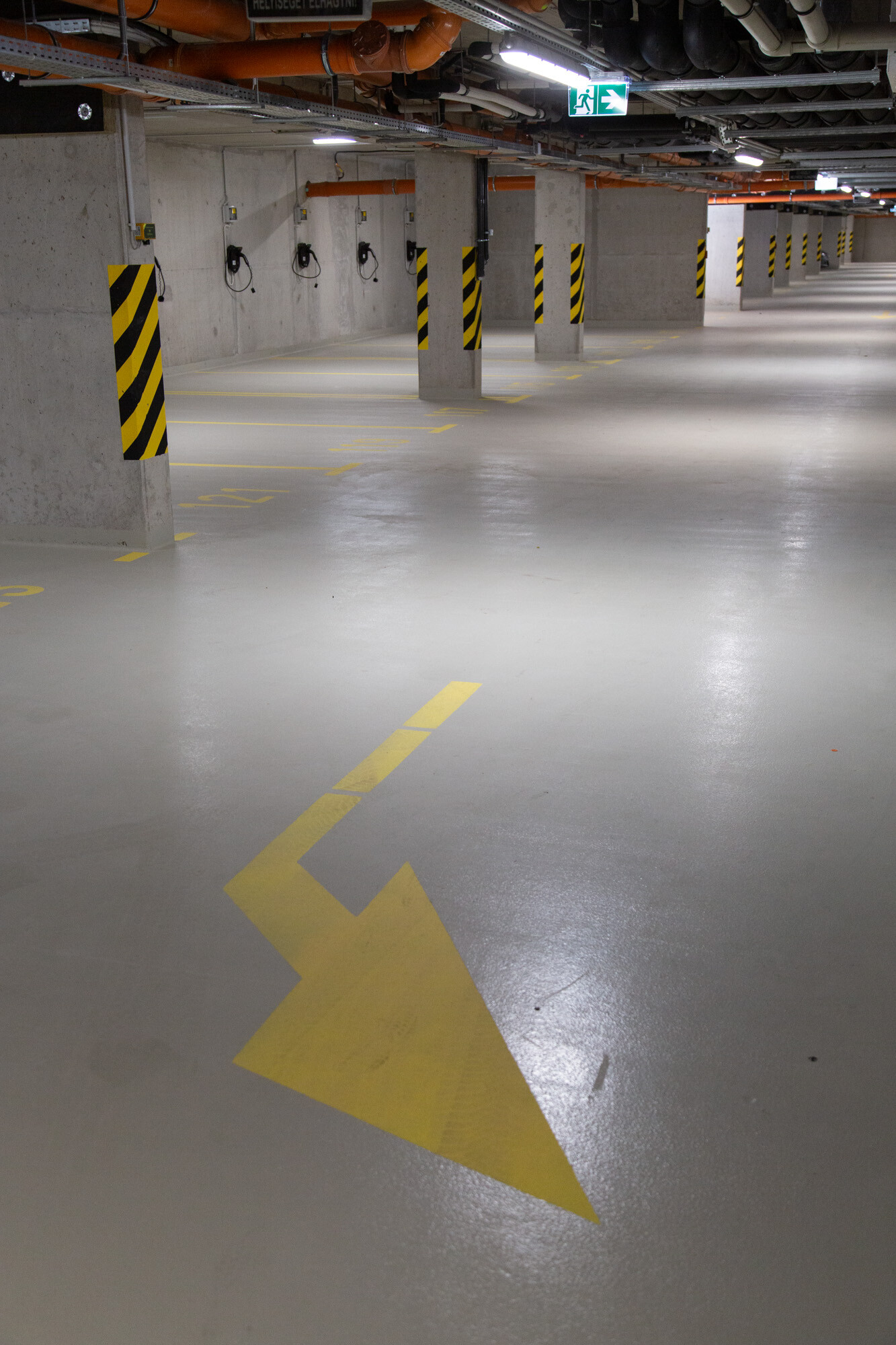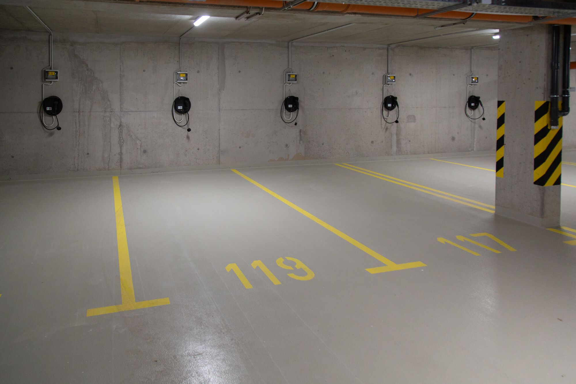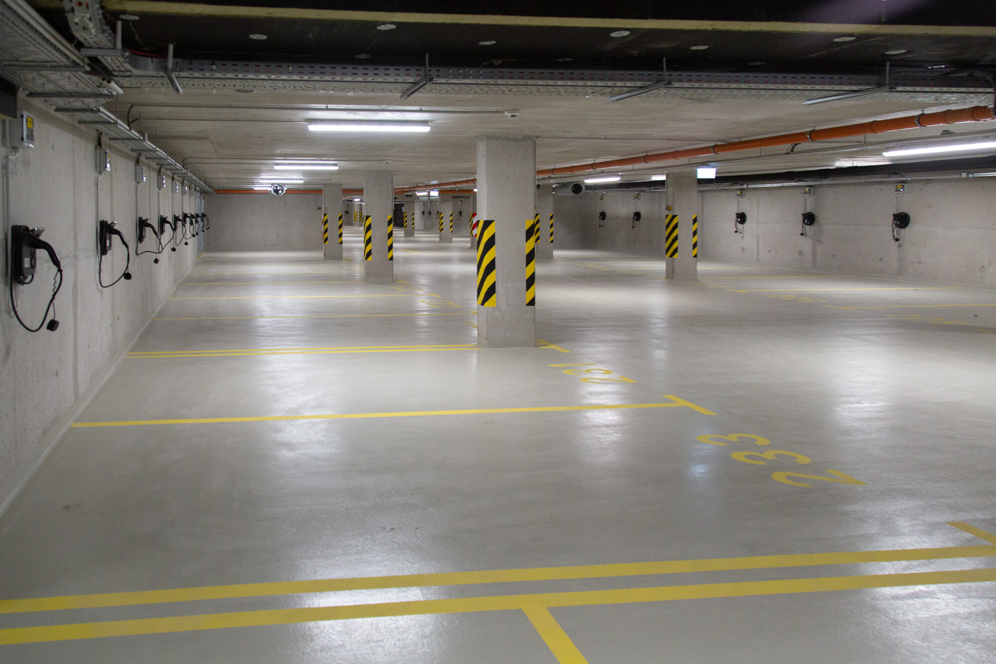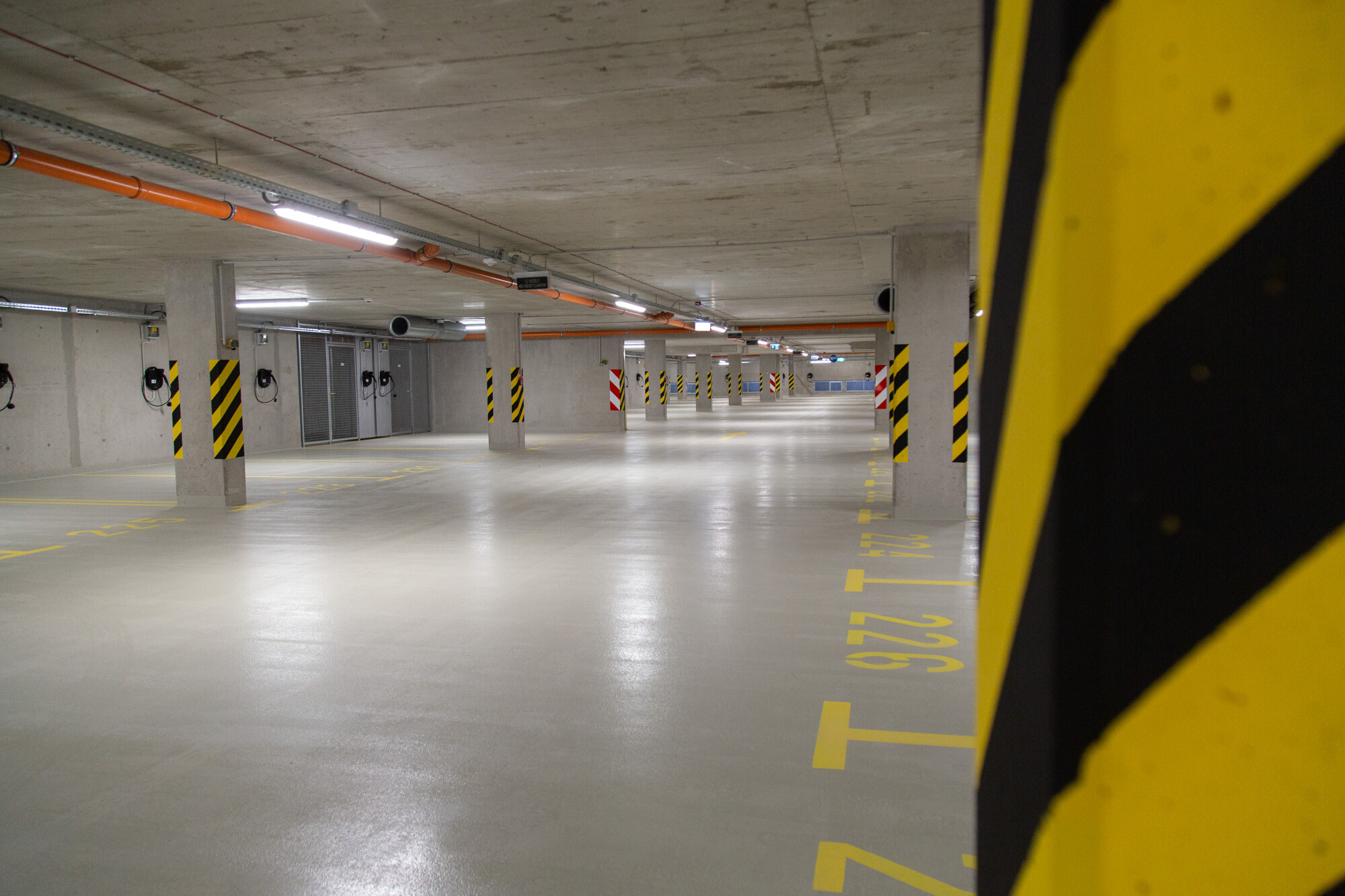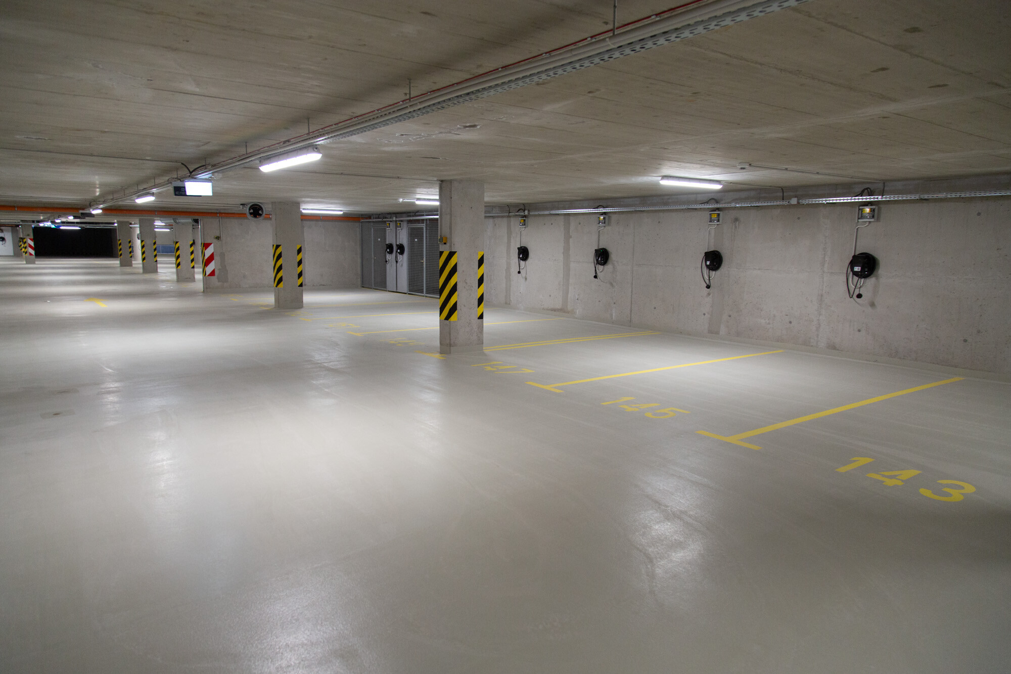 A mélygarázsban, a mechanikusan erősen igénybe vett, járműközlekedéssel leginkább terhelt részeken a MAPEFLOOR PARKING SYSTEM RHT felhasználásával többrétegű, epoxi felületi bevonatrendszert alakítottak ki. A többrétegű, fugamentes, csúszásmentes epoxi rendszer teljesíti az OS 8-as osztály követelményeit (MSZ EN 1504-2) az útfelületek bevonatára nagy terhelésű forgalomnak kitett autóparkolók felületének bevonására.