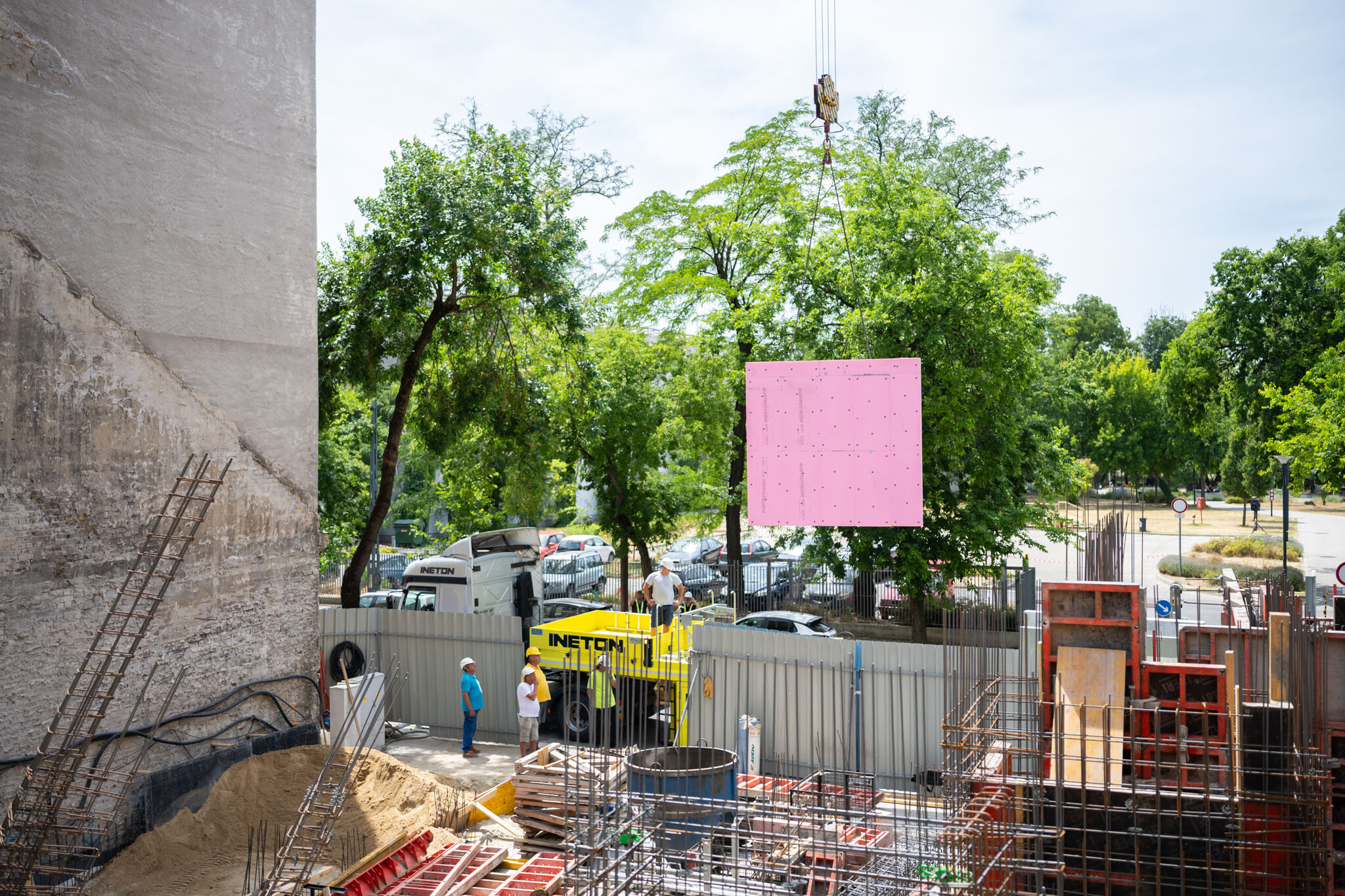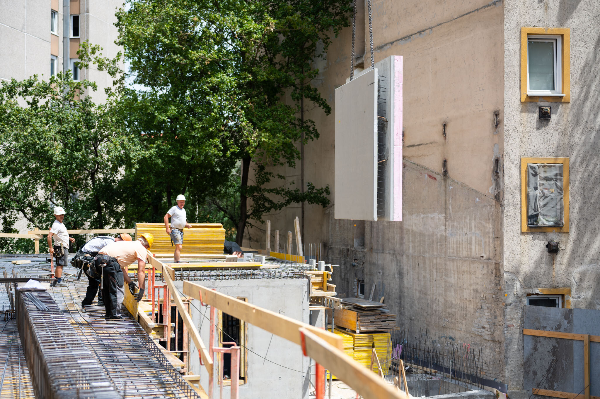 A helyszínre szállított elemek között szerepel mintegy 1500 négyzetméternyi külső hőszigeteléssel ellátott kéregfal, valamint 18 darab előregyártott lépcsőkar is. Ezek beemelése lesz az építkezés egyik leglátványosabb mozzanata, hiszen a nagyméretű elemek precíz beillesztése speciális technológiát és jól összehangolt csapatmunkát igényel.