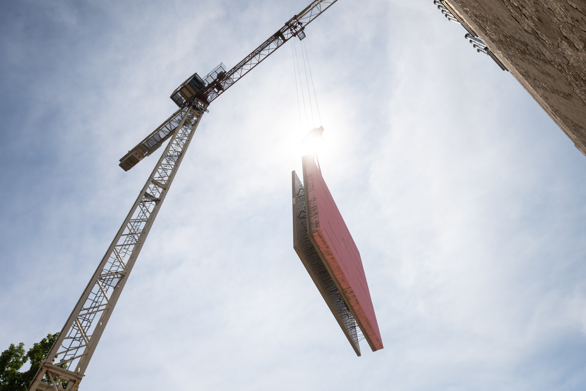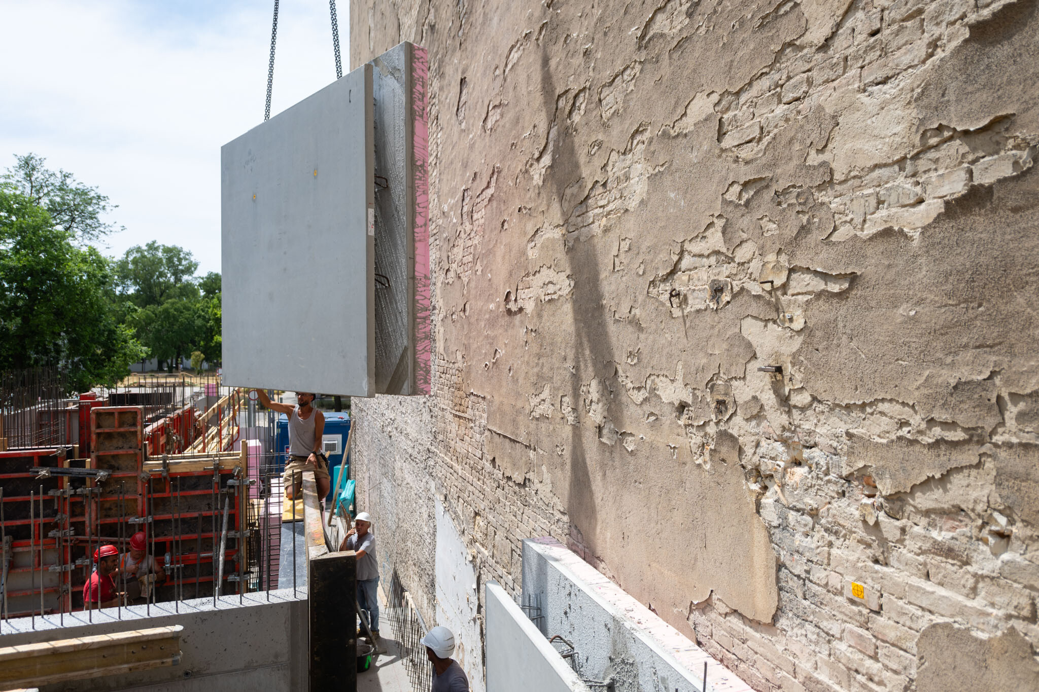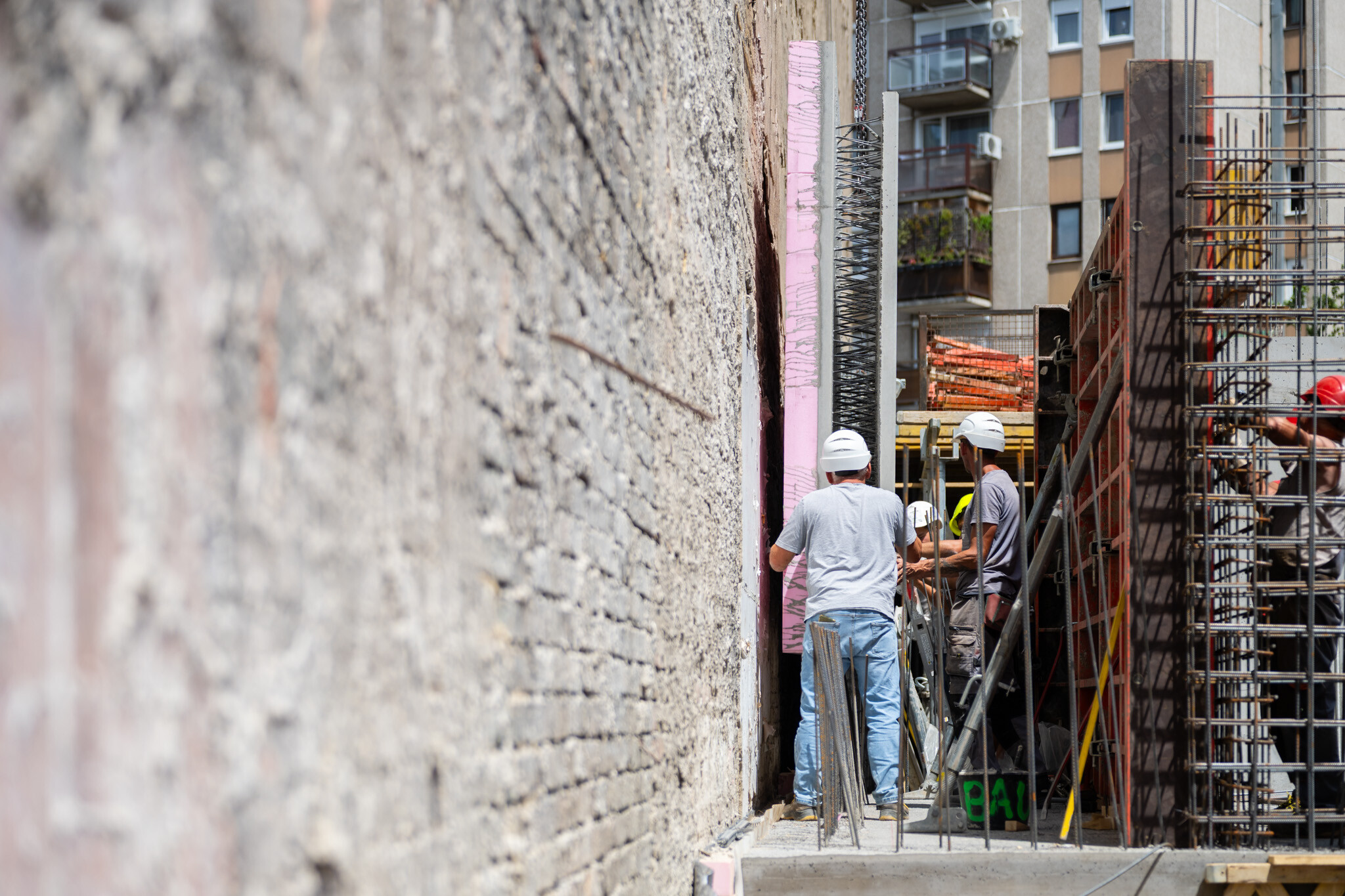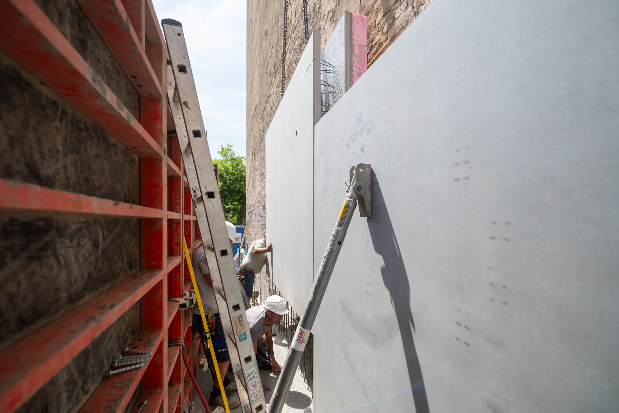 Az építkezés egy foghíjtelken zajlik, ahol a szűk hely adottságai miatt nem volt lehetőség hagyományos módon, helyszíni zsaluzással kialakítani a teherhordó szerkezeteket. A kivitelezés során előre látható szerelési nehézségek is felmerültek volna, ezért a projektcsapat az eredeti terveket átdolgozva az előregyártott megoldások mellett döntött.