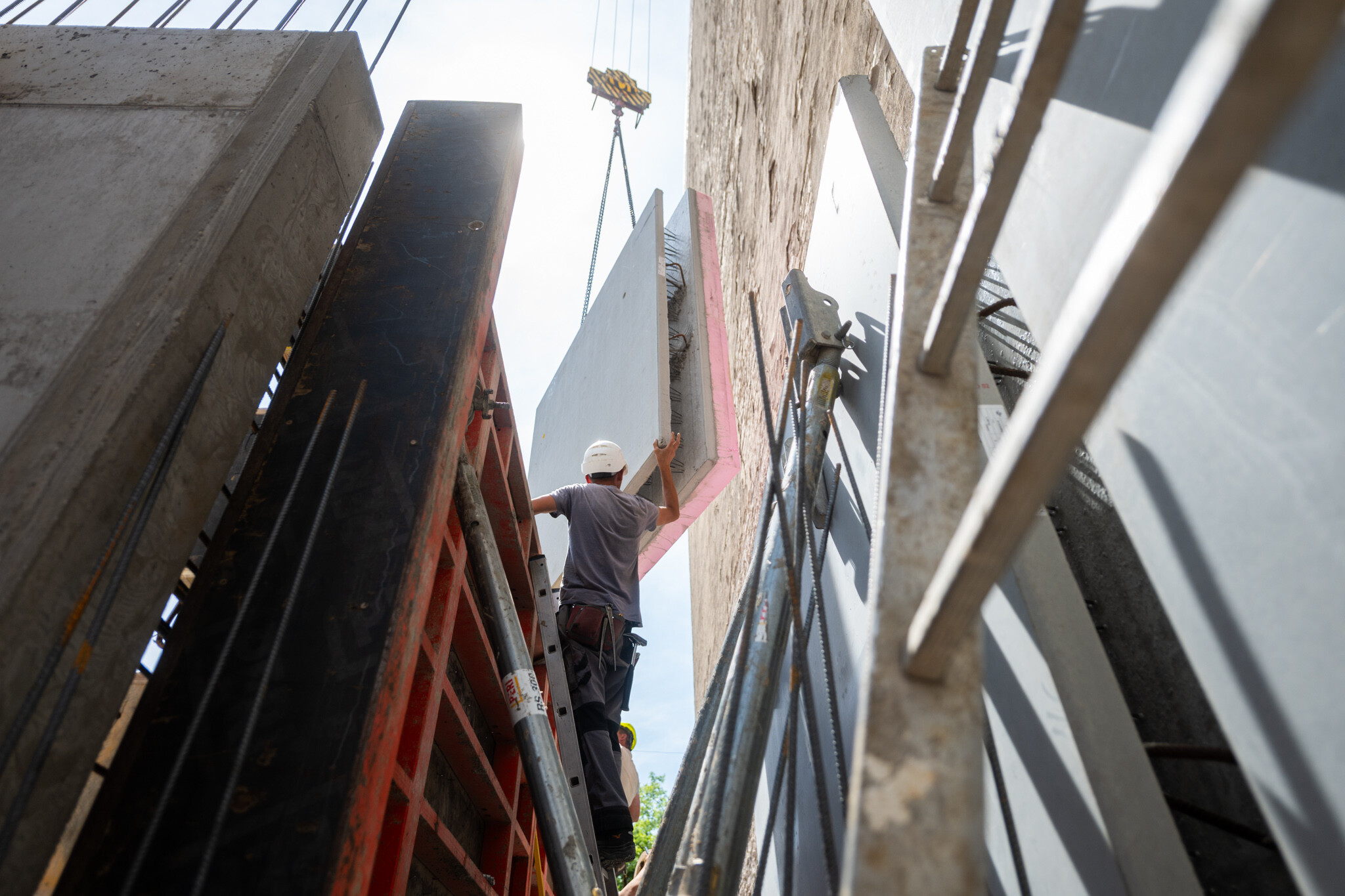 Ez a megoldás jelentős előnyöket kínál: nem szükséges a helyszínen zsaluzni, betonacélt hajlítani vagy hőszigetelést elhelyezni, mivel a gyárban elkészült elemek már tartalmazzák ezeket az összetevőket, emellett a helyszíni élőmunkaigény is minimalizálható, a szállítás pedig költséghatékony. Az egyik oldalán hőszigetelt, a másik oldalán közel látszóbeton minőségű felületű falakat csupán a fogadószerkezetre kell beemelni, így az építkezés gyorsabbá és hatékonyabbá válik.