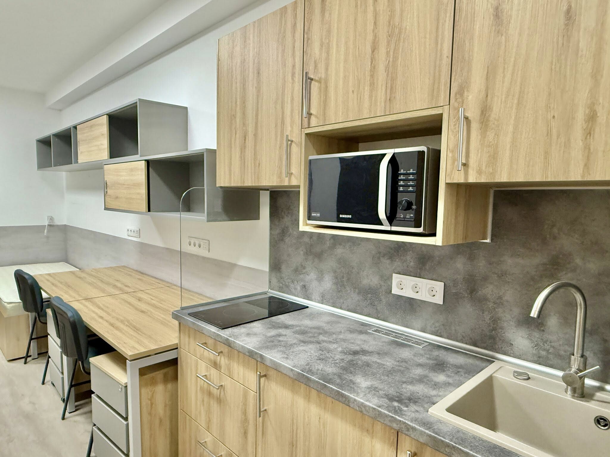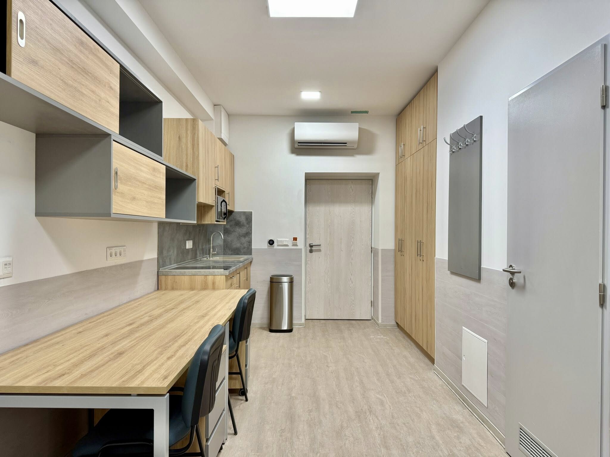 klimatizált szobák, minikonyhás, saját fürdőszobás apartmanok; ezek mellett pedig mosó- és főzőkonyha, közösségi tér is várja majd a hallgatókat.