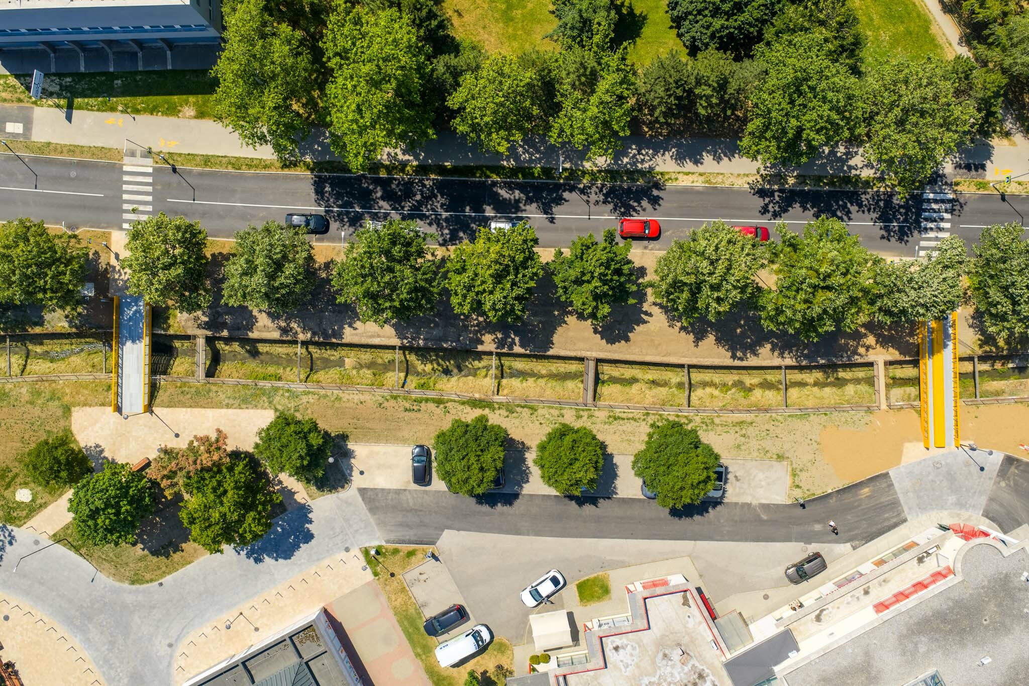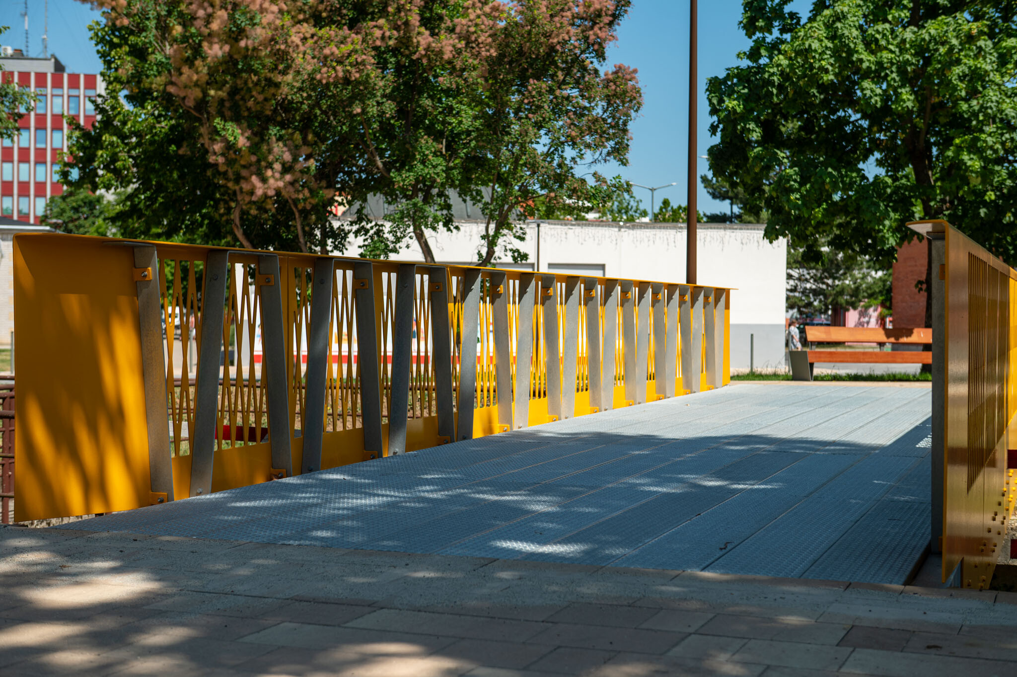 A rendőrség közelében lévő új acélhíd 12 méter hosszú és 3,7 méteres széles. A távhő átkelőhöz hasonlóan, ez is mintegy 5 tonna tömegű. A két híd acélszerkezetének korrózióvédelme duplex bevonattal készült, a tűzihorganyzás után, többrétegű festék került a hidak felületeire.