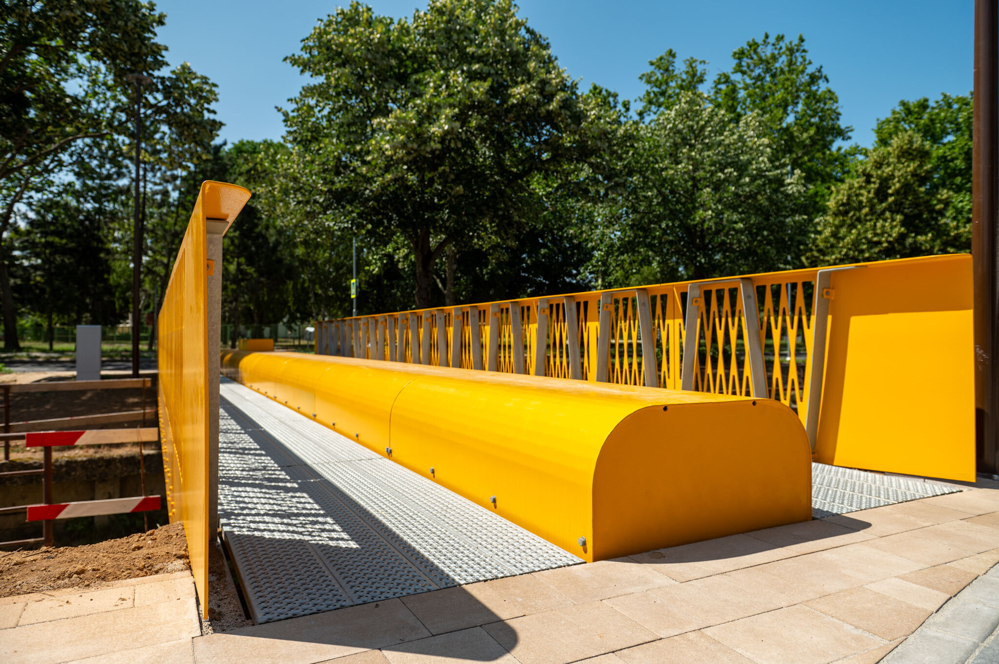 A hídkorlátok előregyártott beton elemekből és üvegpanelekből készültek. A LED-világítással ellátott közbenső korlátelemek nemcsak dizájnelemként funkcionálnak, hanem a sötétedés utáni gyalogosforgalmat is biztonságosabbá teszik.