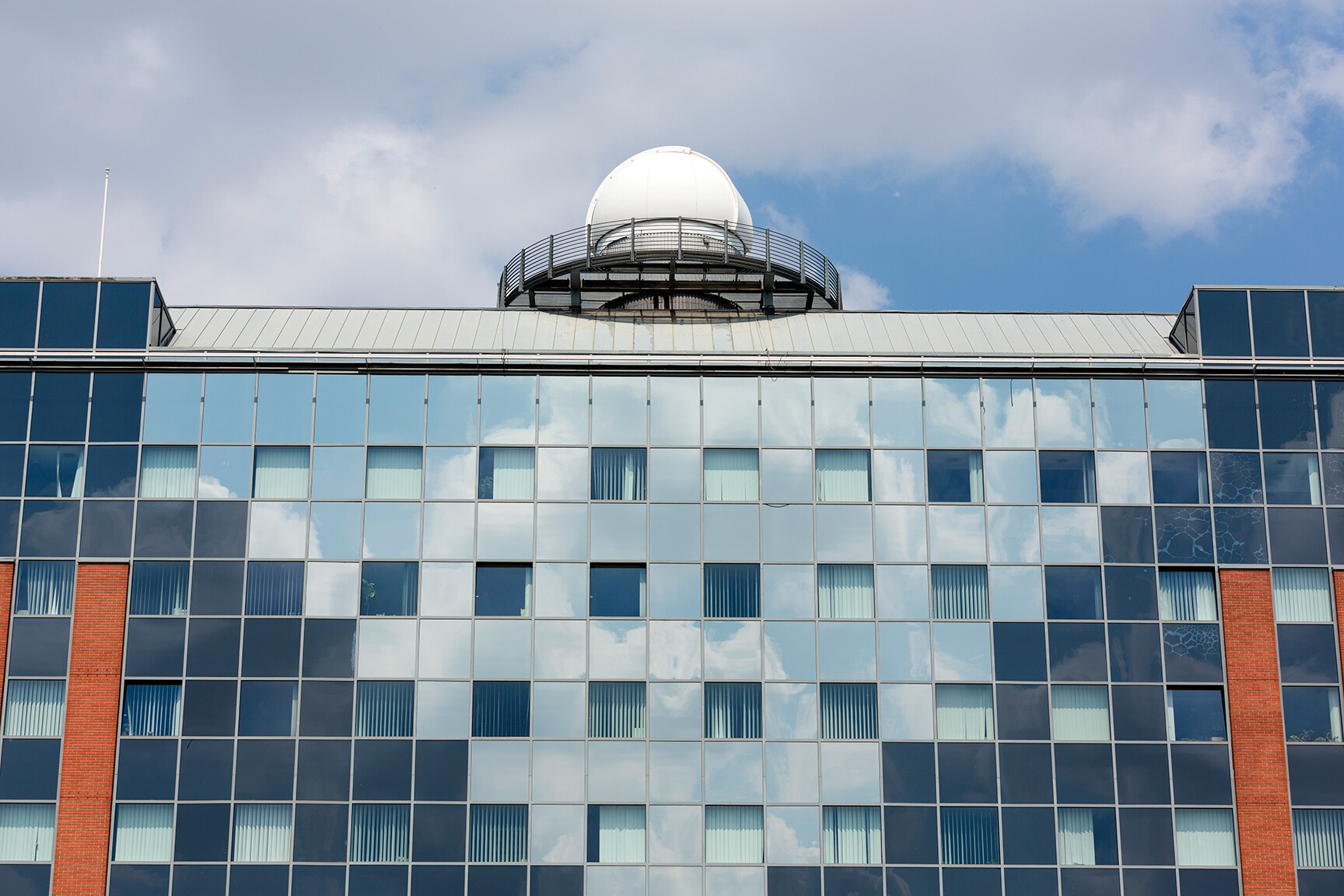A beruházással érintett épület fő tömege pince, földszint + 8 szintes, 8-as alaprajzú, amelynek nyugati oldalához a nagyobb befogadóképességű előadókat, irodákat tartalmazó kétszintes épületszárny (lepény) csatlakozik. Az épület külső megjelenésének sajátosságát a hálós rendszerű, kék burkolattal képzett ablakkiosztás és a kubusokat körülölelő architekturális elemek téglaburkolata adja.