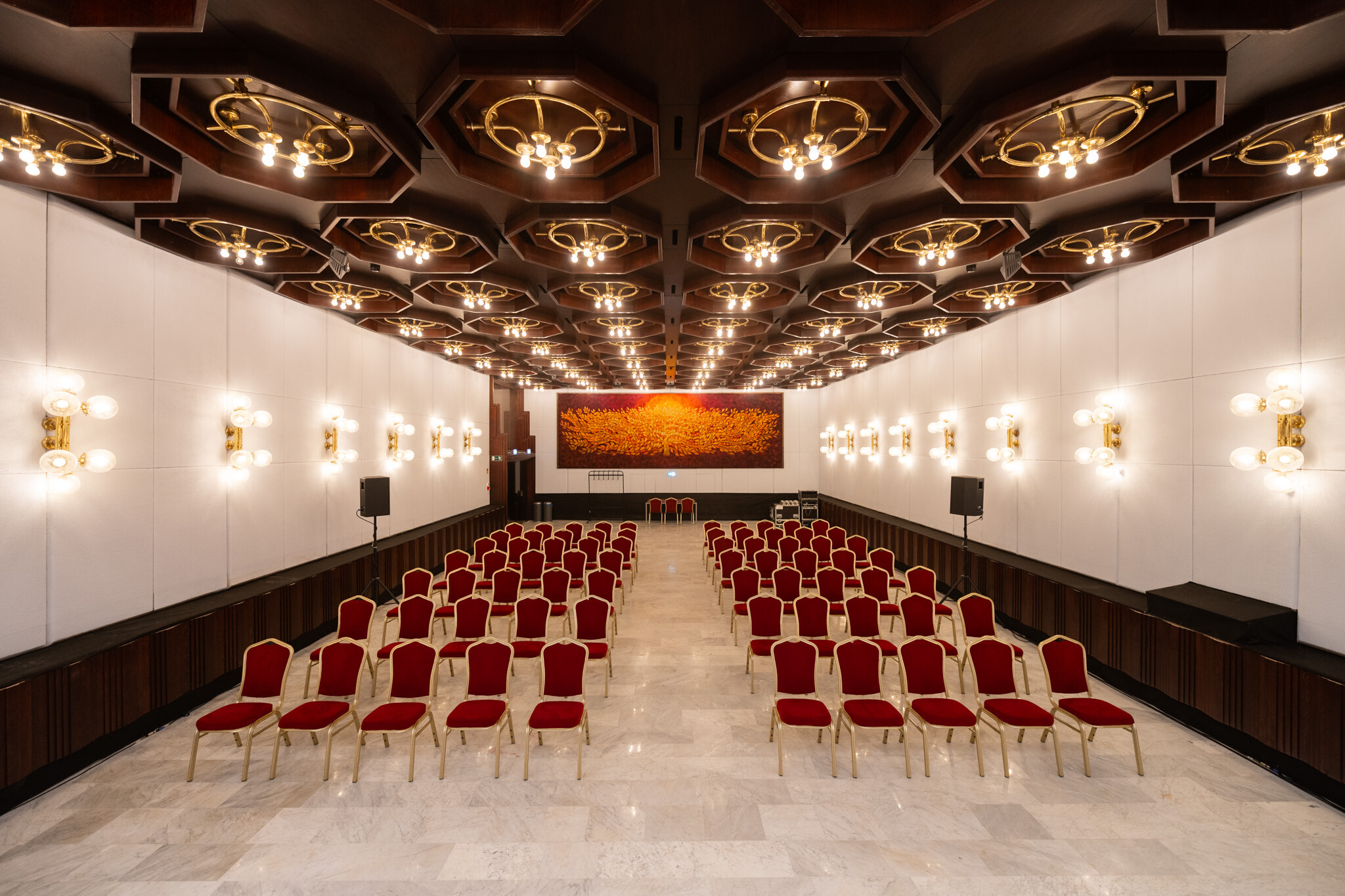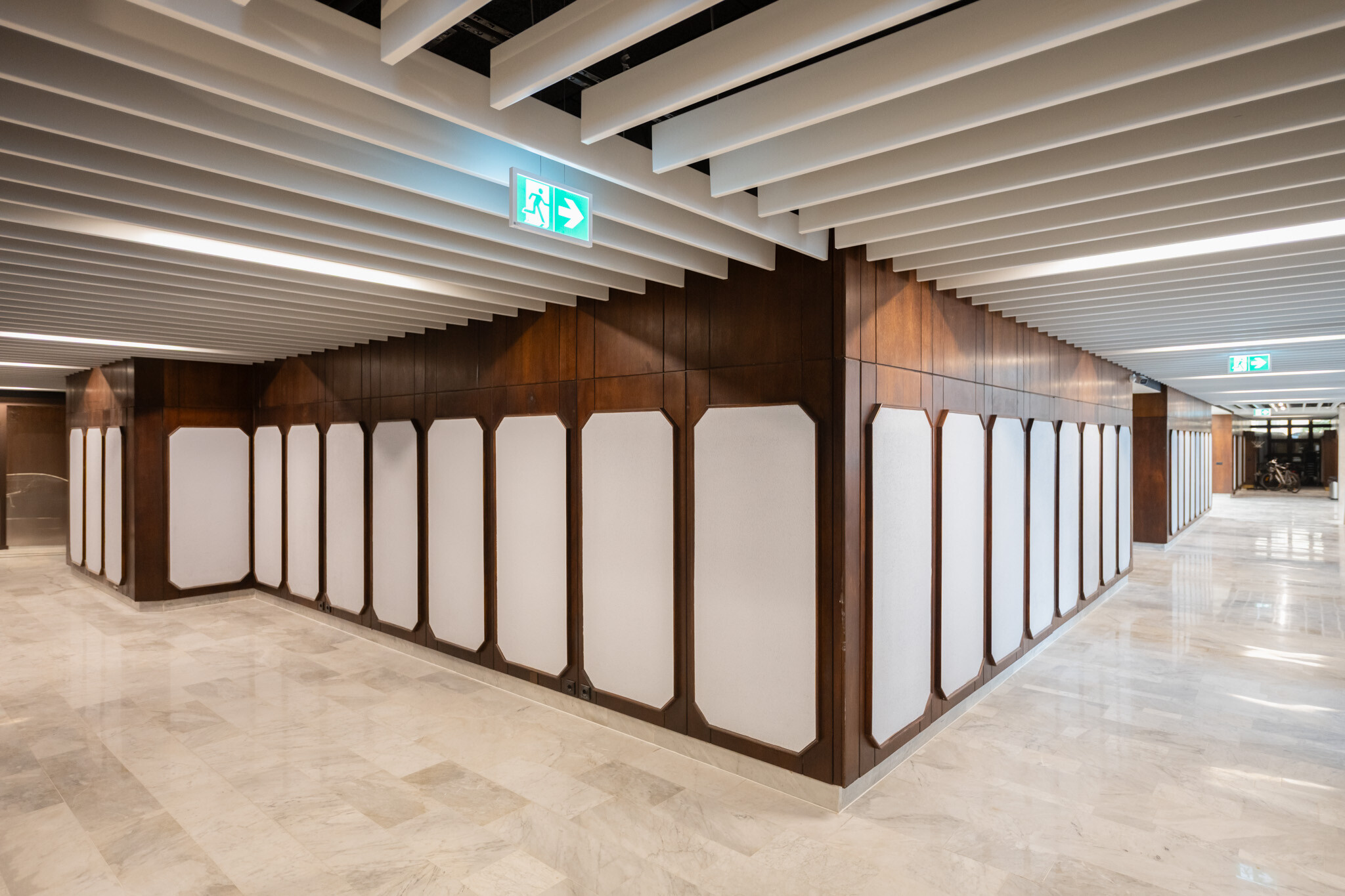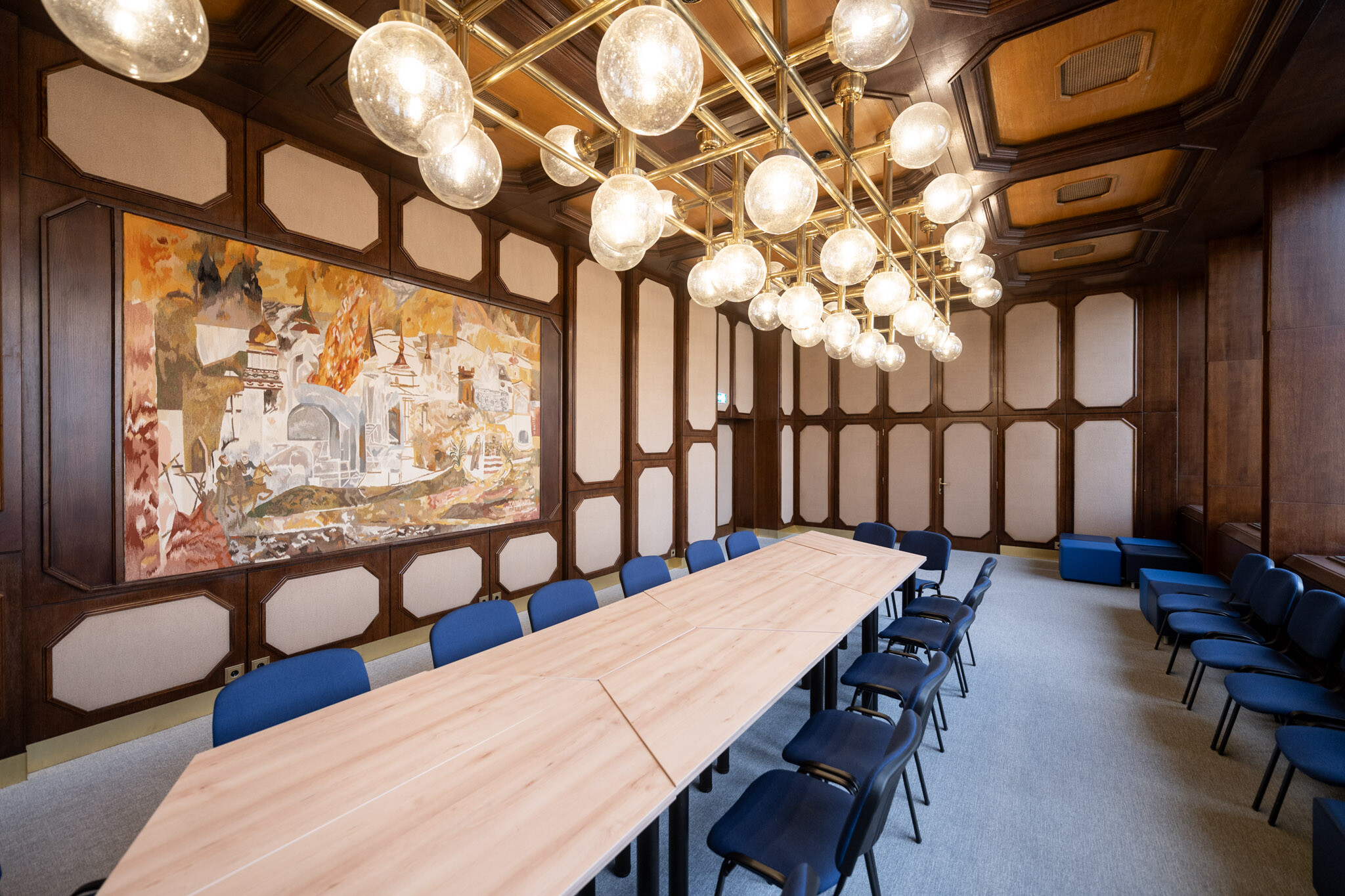 A felújítás egyik legnagyobb szakmai kihívása az volt, hogy a korszerű gépészeti és elektromos rendszerek elhelyezése ne bontsa meg az épület eredeti építészeti és belsőépítészeti karakterét. A fakazettás álmennyezet, a carrarai márványburkolatok és a fa parapetburkolatok mögött rejtetten futnak az új hálózatok.