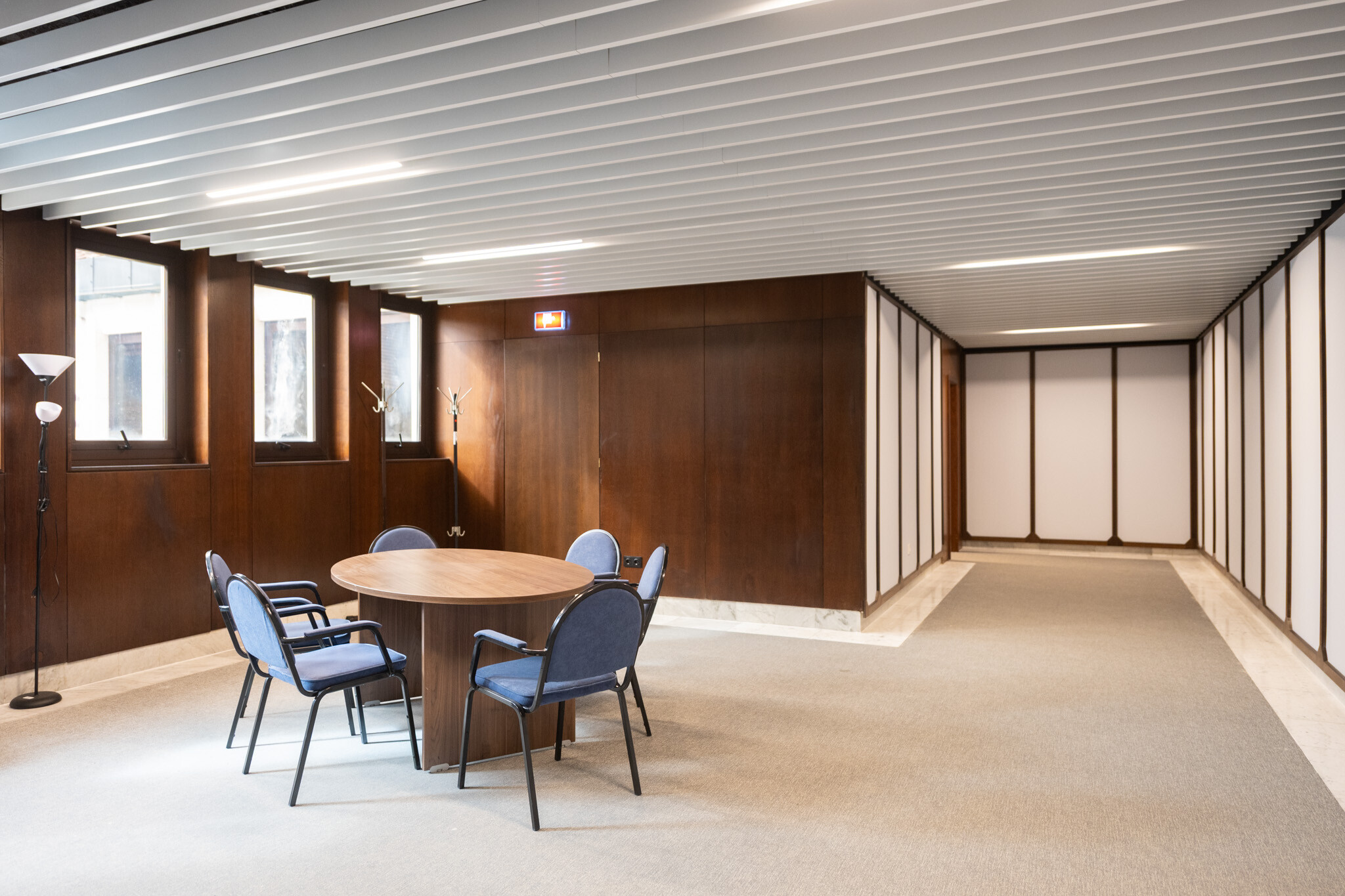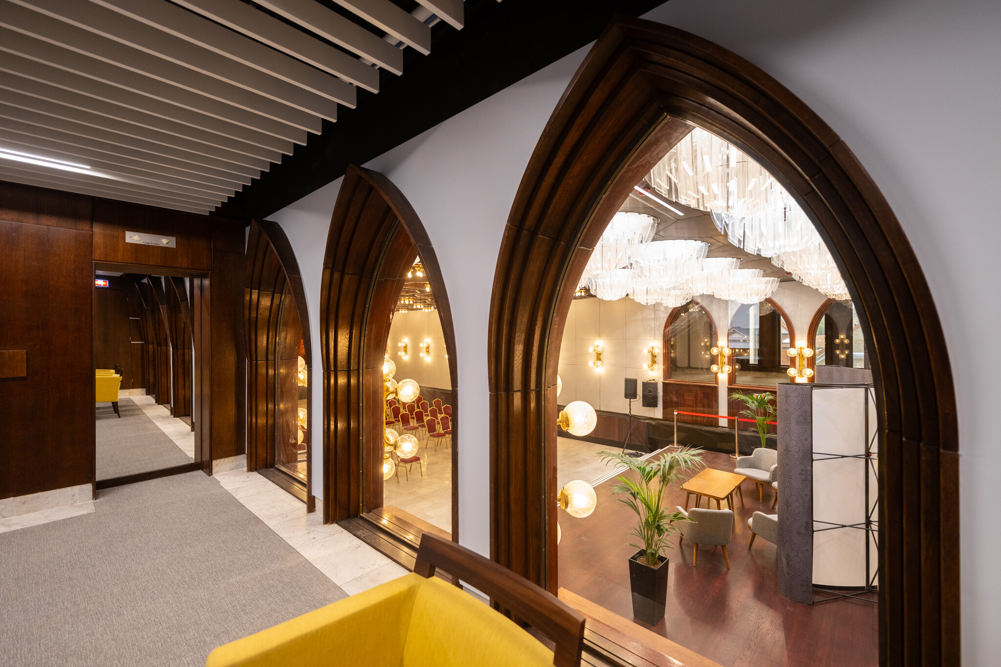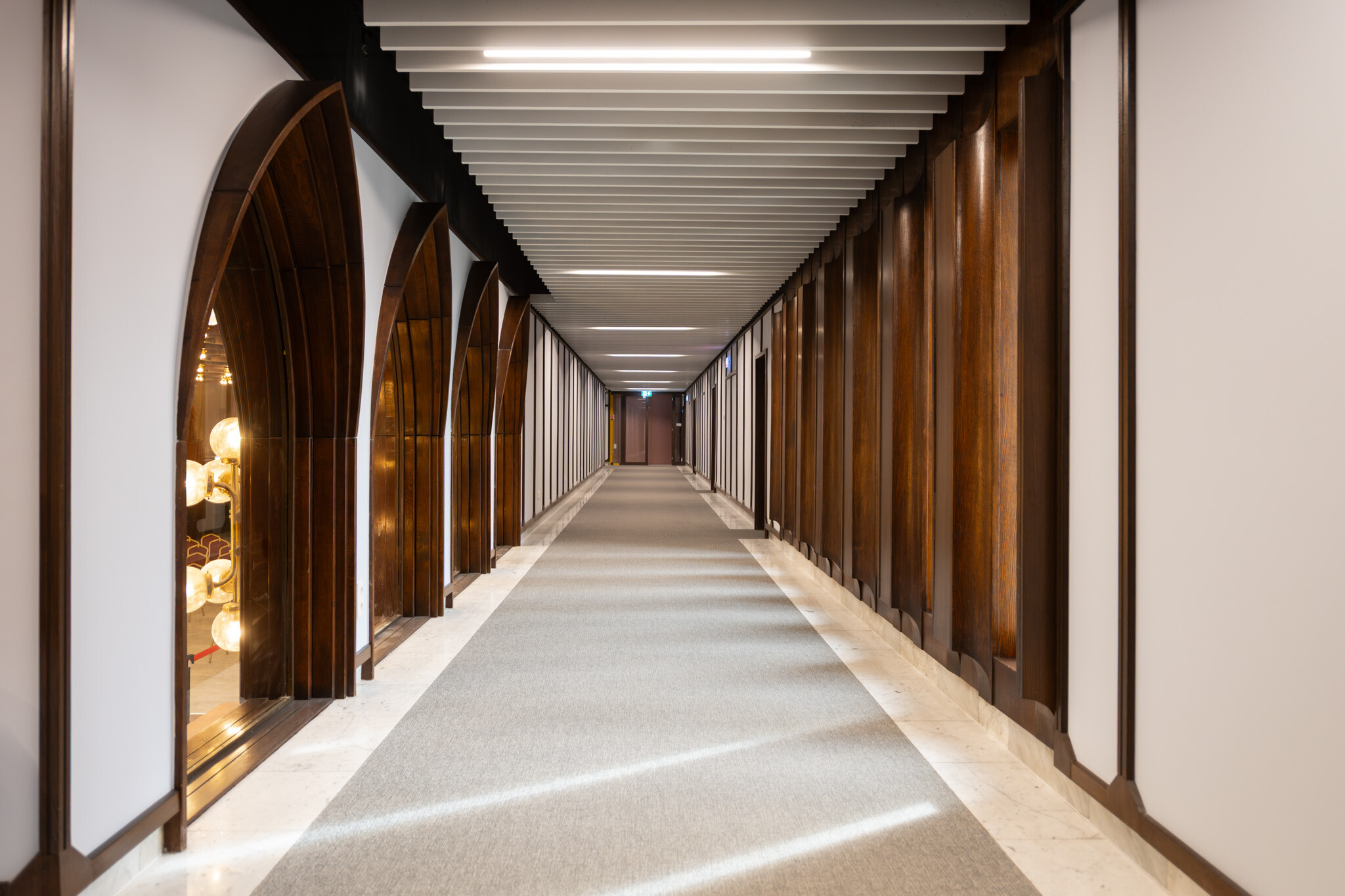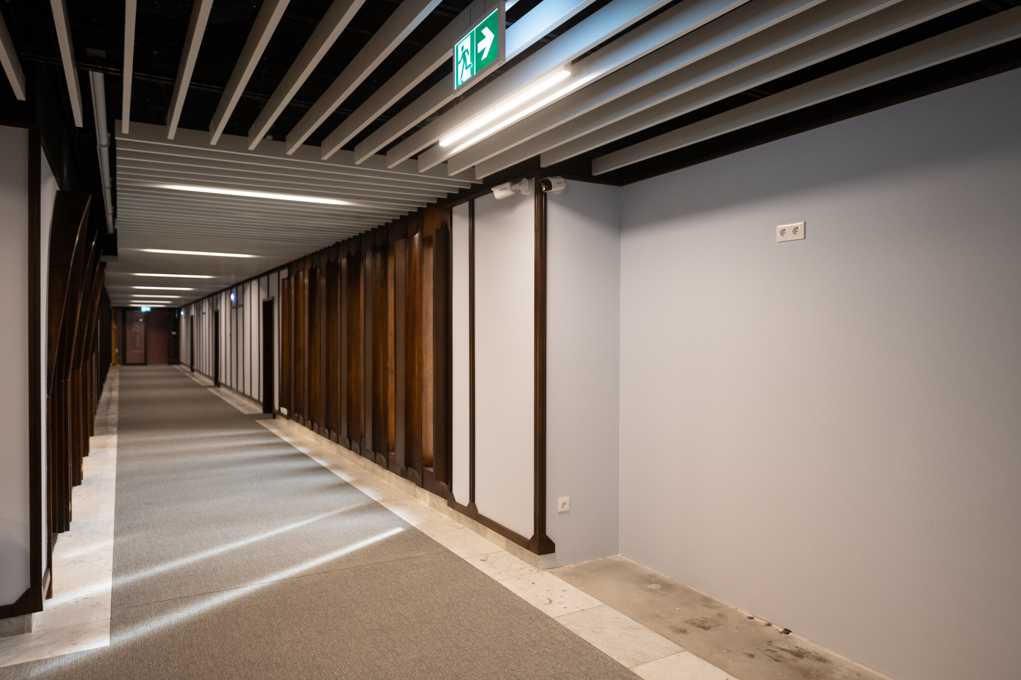 A felújítás egyik legnagyobb szakmai kihívása az volt, hogy a korszerű gépészeti és elektromos rendszerek elhelyezése ne bontsa meg az épület eredeti építészeti és belsőépítészeti karakterét. A fakazettás álmennyezet, a carrarai márványburkolatok és a fa parapetburkolatok mögött rejtetten futnak az új hálózatok.