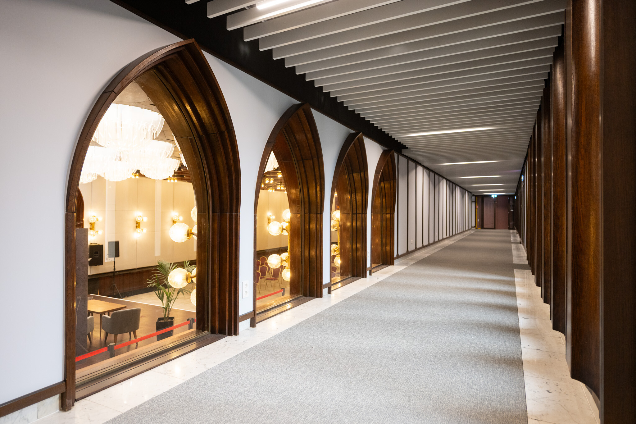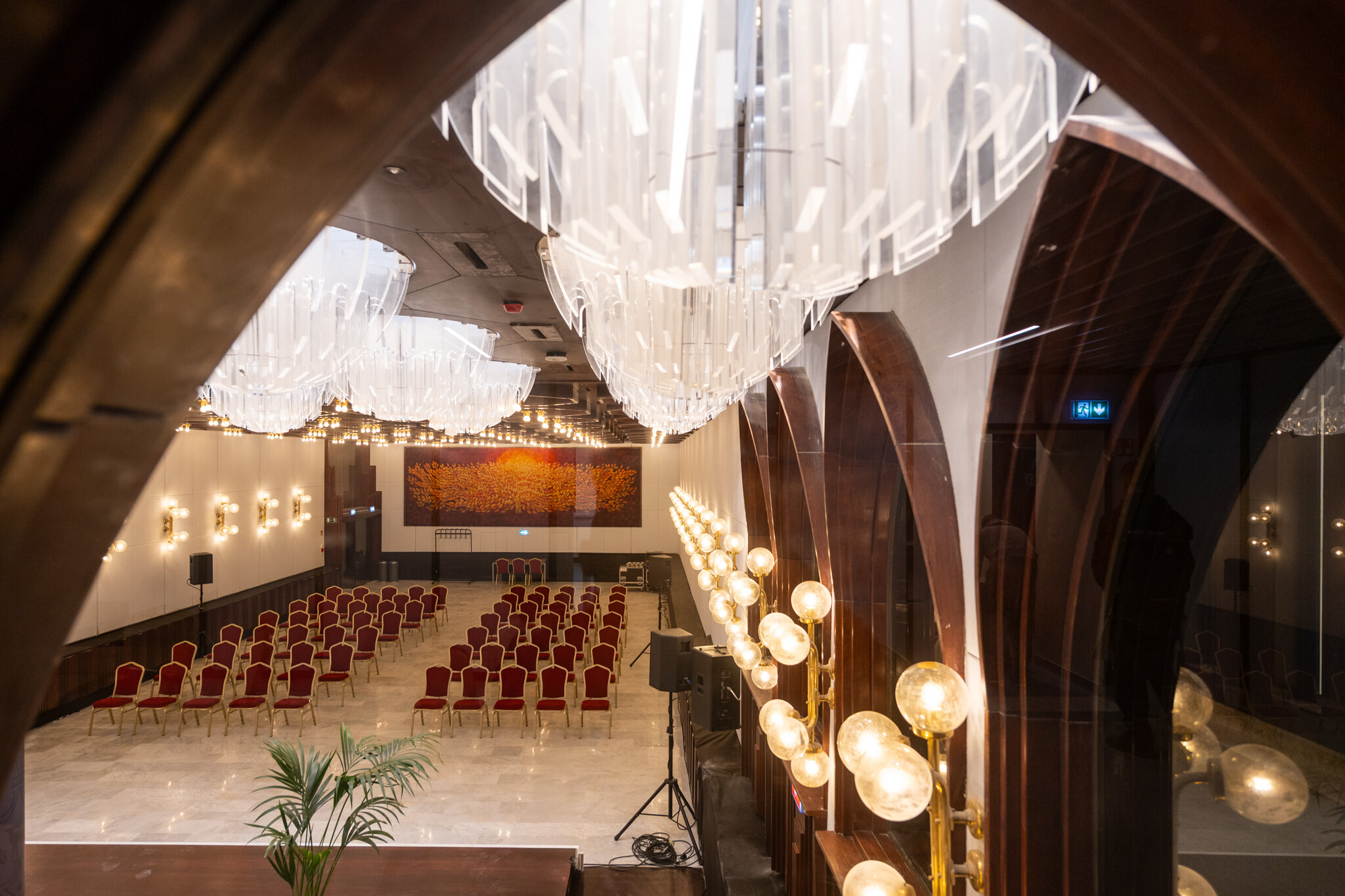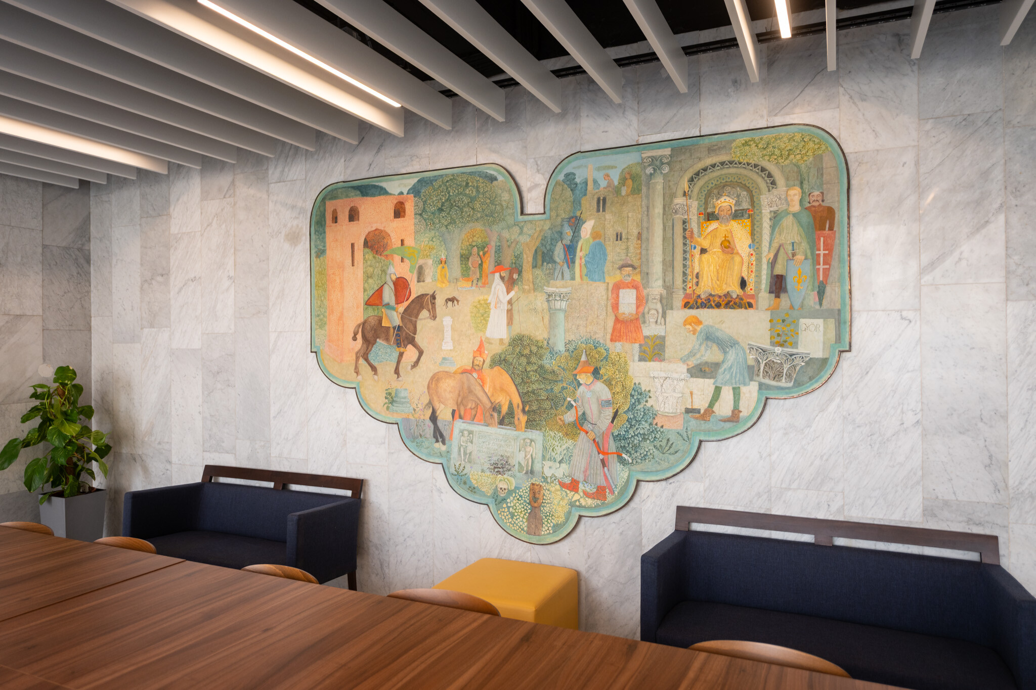 A belsőépítészeti értékek helyreállítása során pótolták a márványburkolatokat, restaurálták a fali képzőművészeti alkotásokat, és korszerű árnyékolástechnikai megoldásokat építettek be. A cél minden esetben az volt, hogy a korszakos értékeket megőrizzék, ugyanakkor a 21. századi használati igényeket kielégítő technológia és komfort is helyet kapjon az épületben.