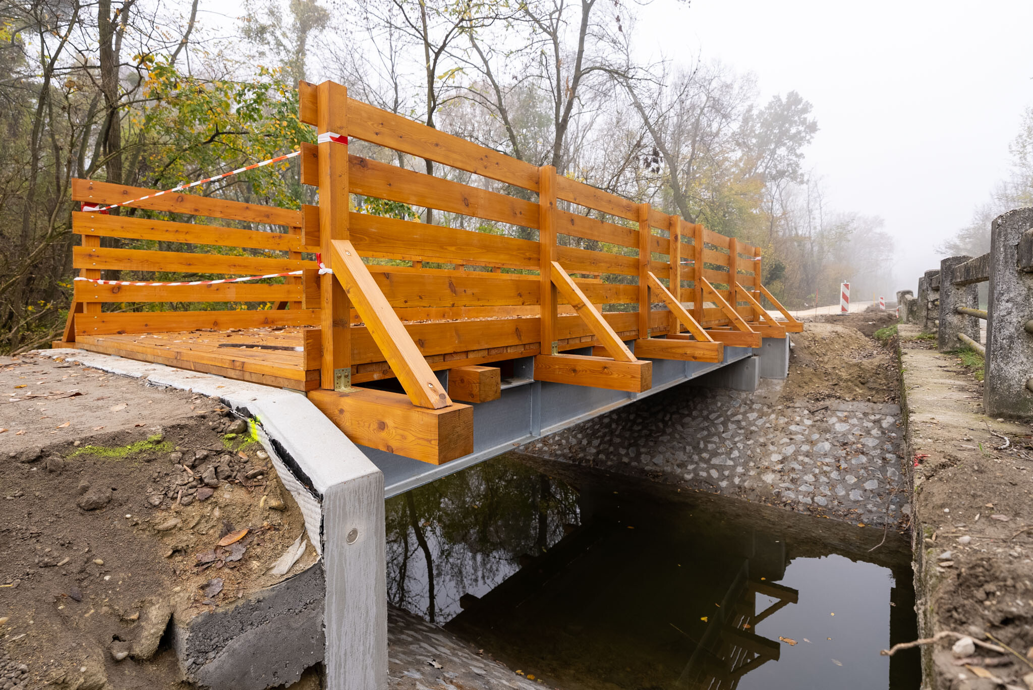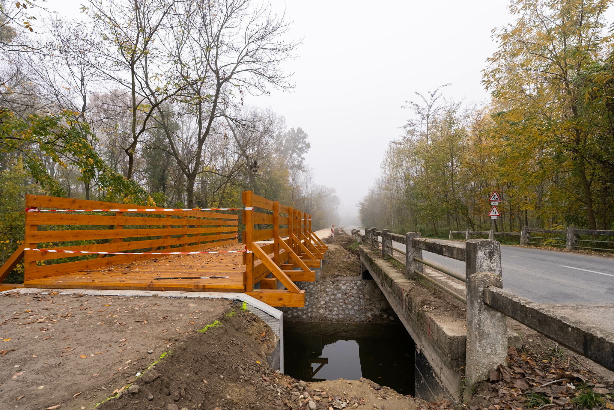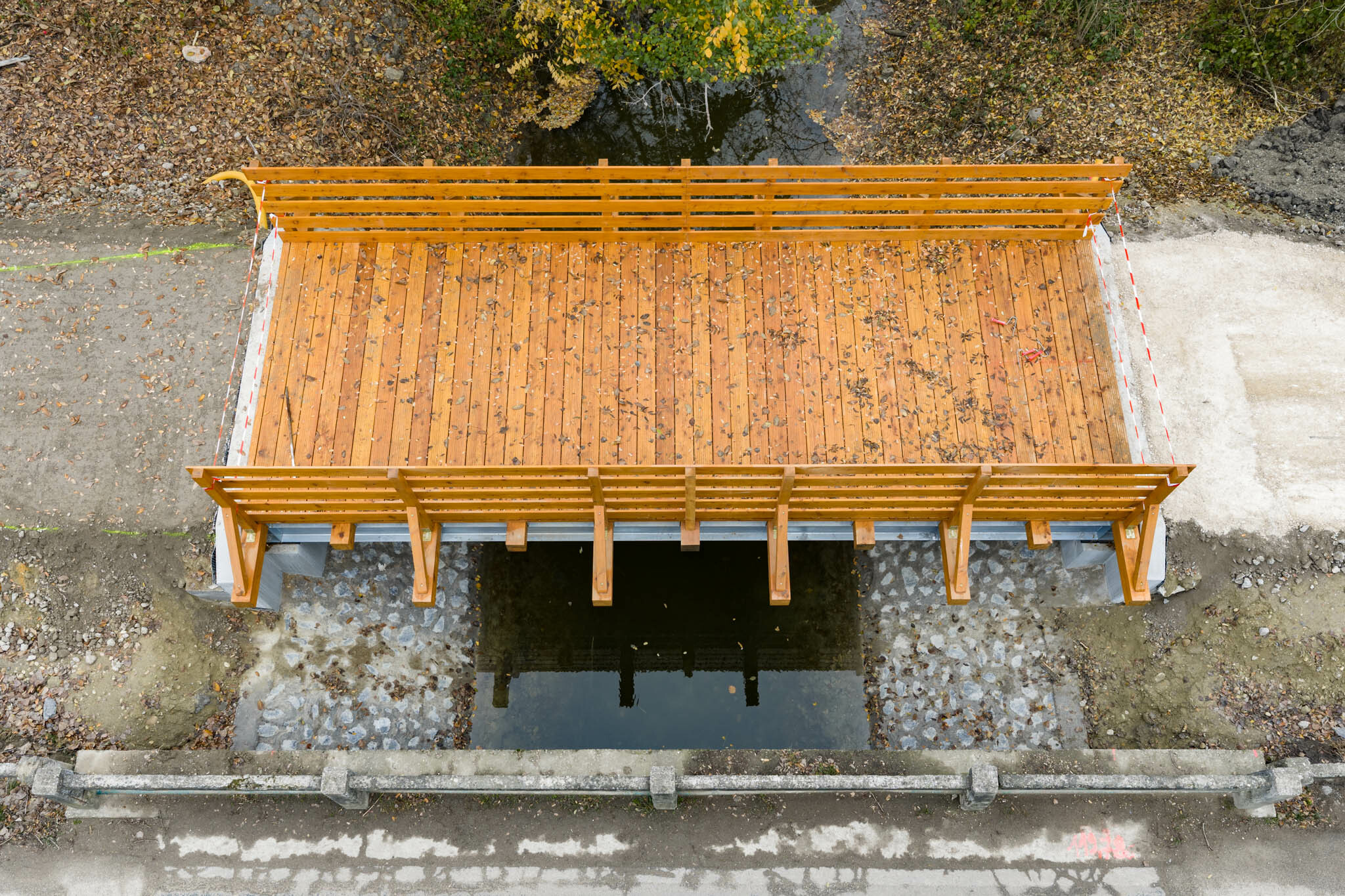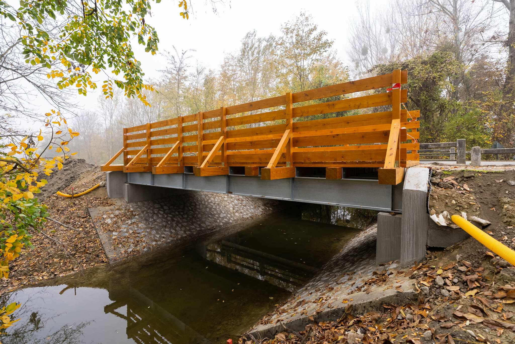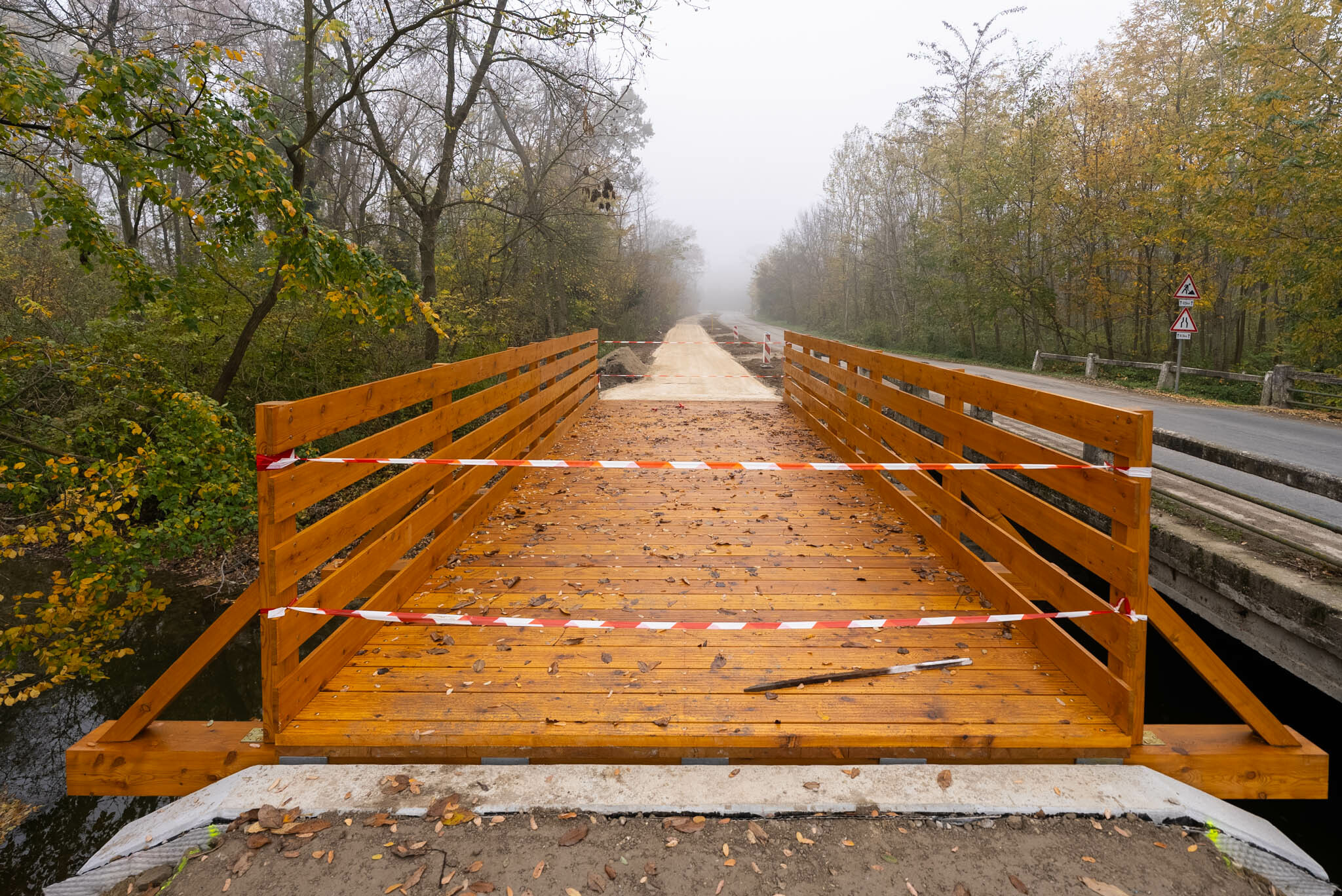 A fejlesztés egyik kiemelt műszaki eleme a Holt-Duna-ágat átszelő új kerékpáros híd, amely a 0+569-es szelvényben, az 1406-os út 5+765 kilométerszelvényénél épült meg. A híd egynyílású, 9 méteres szabadnyílású szerkezettel rendelkezik, amelynek acél főtartói előregyártott elemekként érkeztek a helyszínre. A fapallós burkolat és a mázolt fakorlát illeszkedik a környezet természetközeli karakteréhez, míg a hídfők monolit vasbetonból készültek.