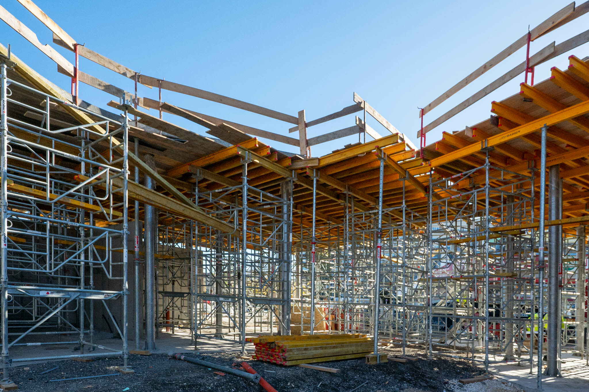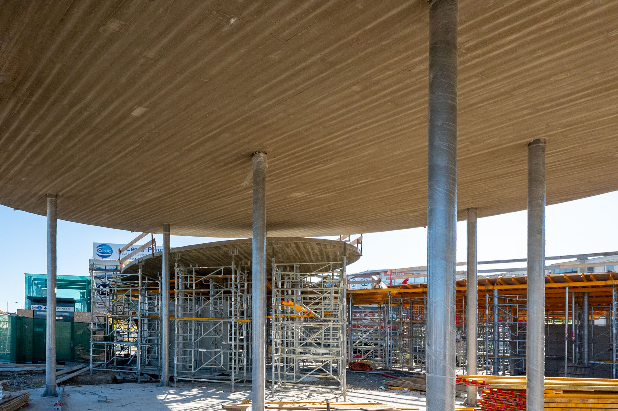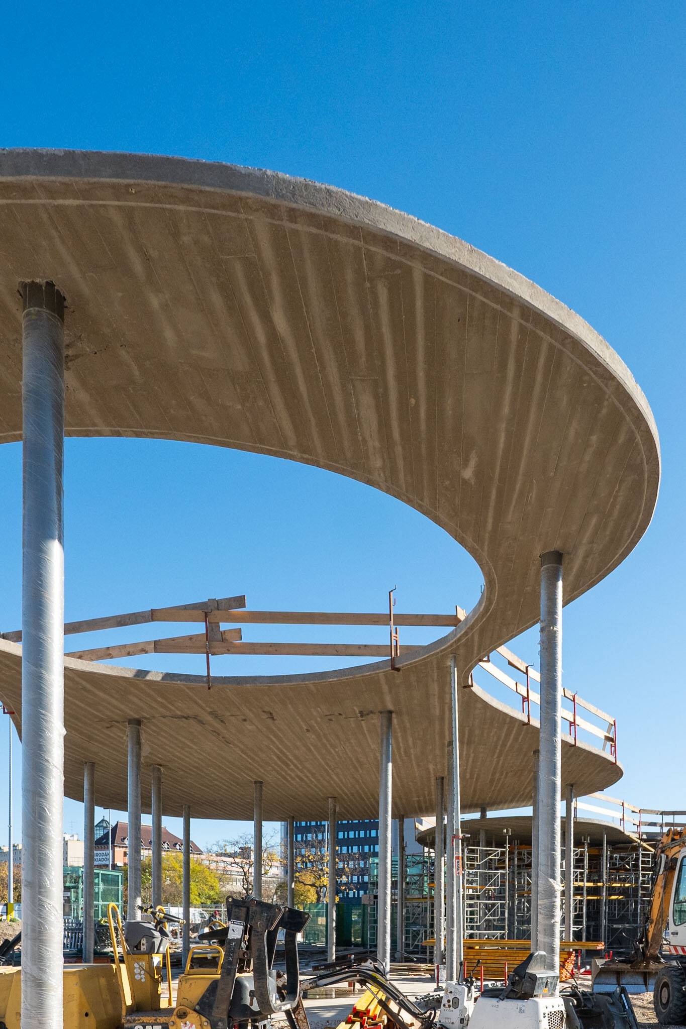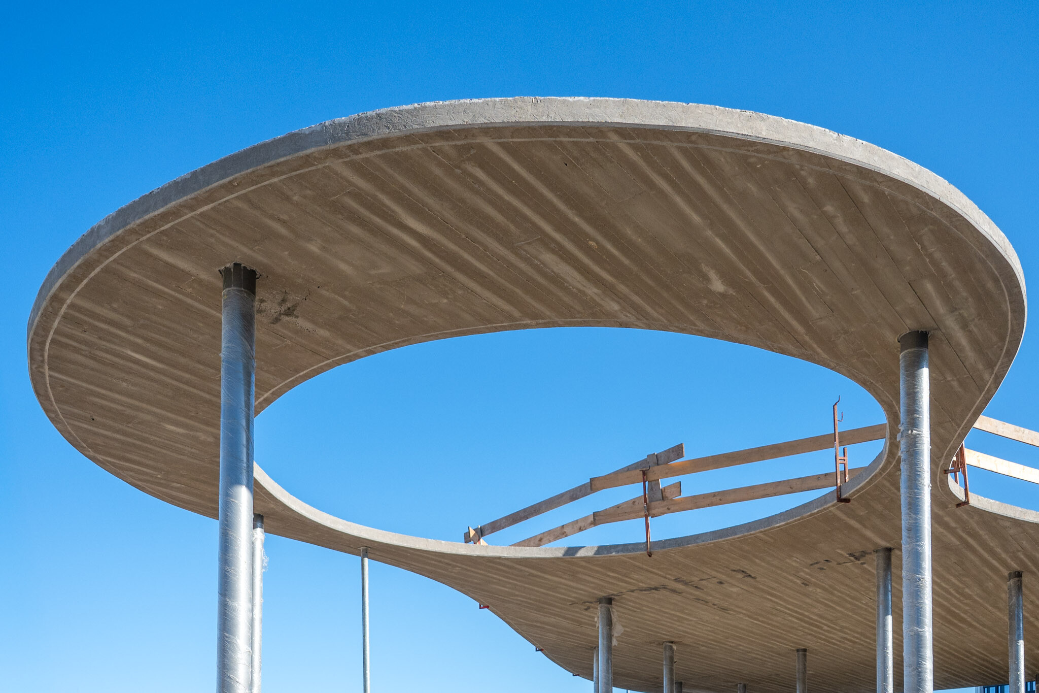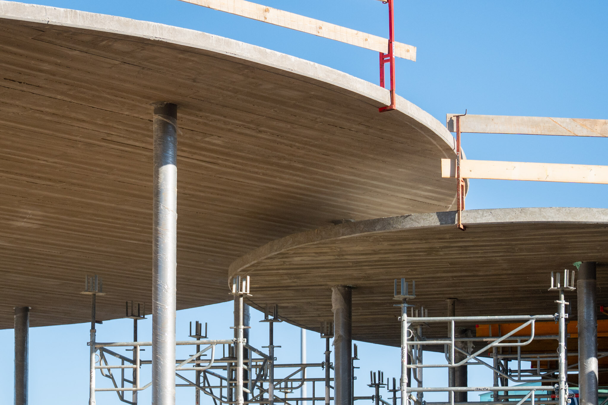 Emellett a vese formájú alaprajzi forma és a különböző födémmagasságok is fokozott precizitást igényeltek az alátámasztási és zsaluzási munkáknál.