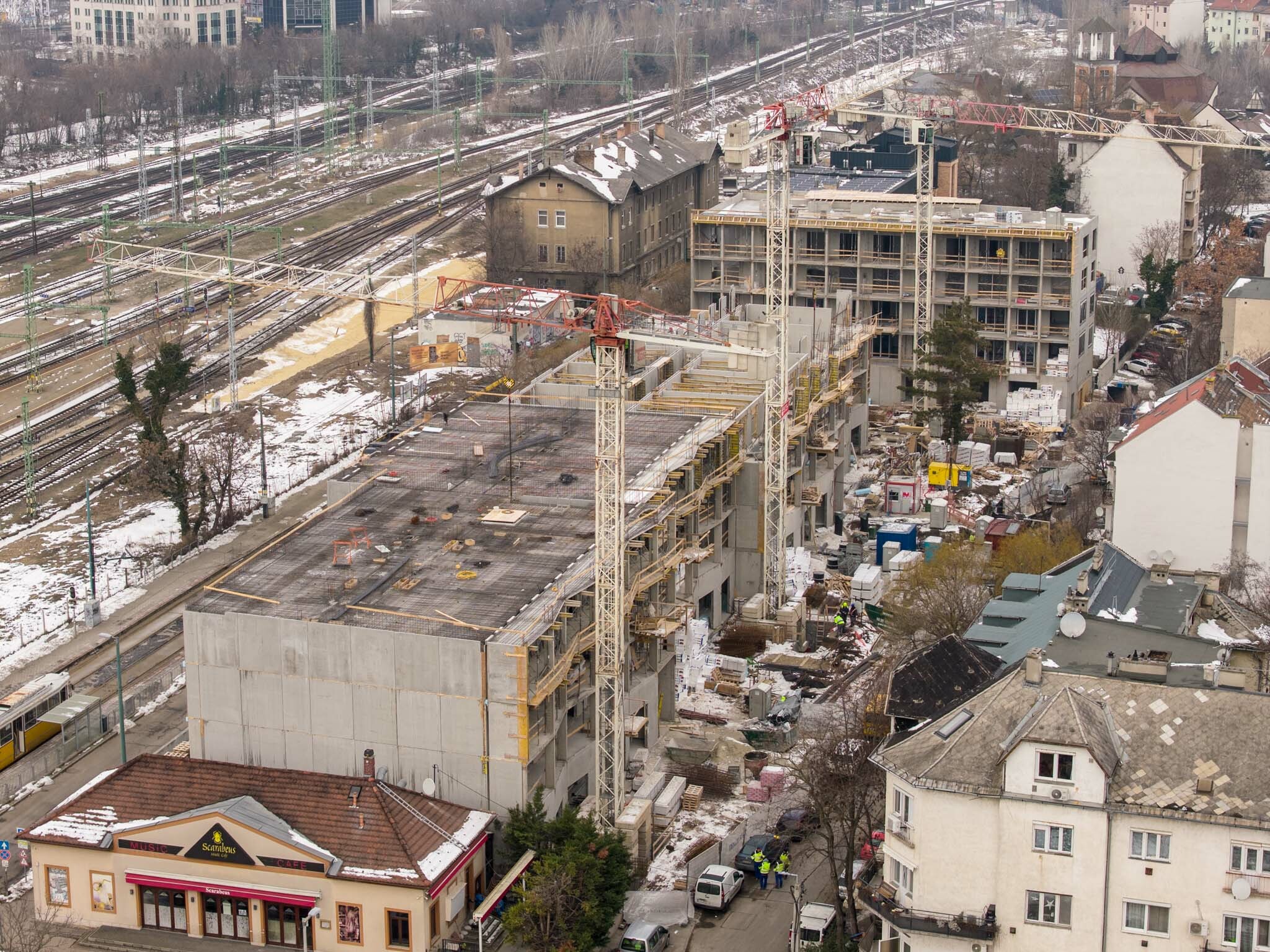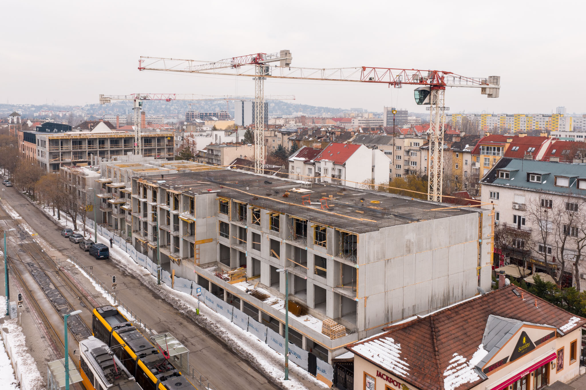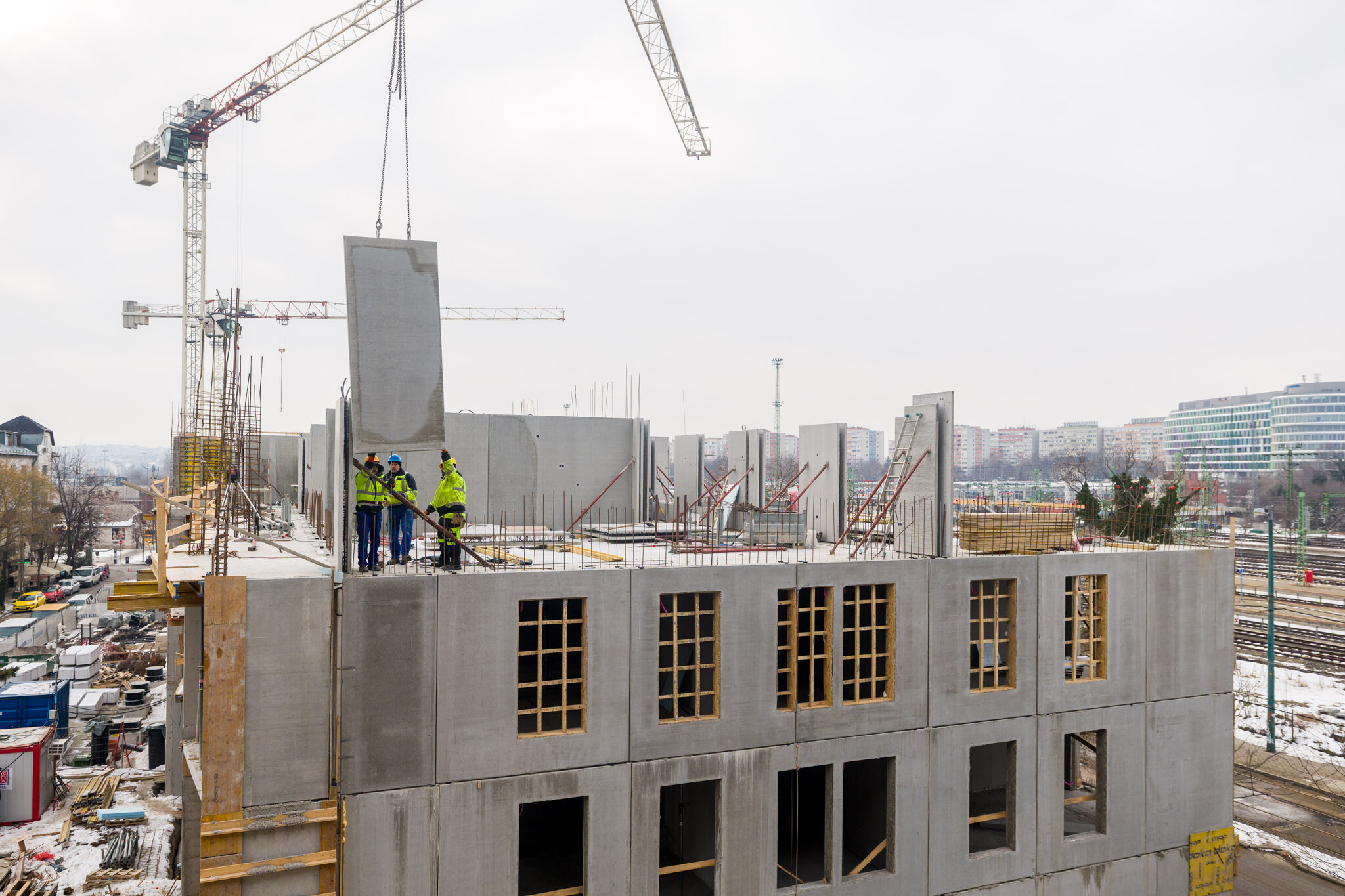 „A 144 lakásos társasházhoz összesen mintegy 13.000 m² fal- és 13.000 m² födémelem gyártása és beszállítása tartozik a feladataink közé. A kéregfalakat már a pinceszinten is alkalmazták, de elsősorban a lakáselválasztó és homlokzati főfalak készülnek ezzel a technológiával”