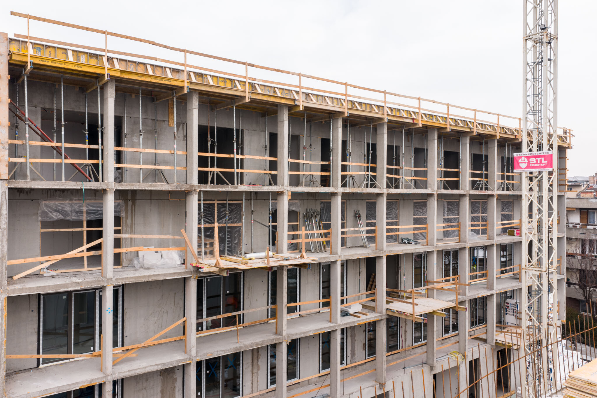 A kivitelezés 2025 januárjában indult az alapozási munkákkal. A pinceszinti előregyártott kéregfalak szállítása június elején kezdődött meg. A projekt jelenleg szerkezetkész közeli állapotban jár: az öt lépcsőház közül az egyiknél már lezárultak az előregyártott elemek szállításai a 4. emeleti zárófödémmel együtt, a fennmaradó négy lépcsőháznál pedig már csak a legfelső szintek kivitelezése van hátra.