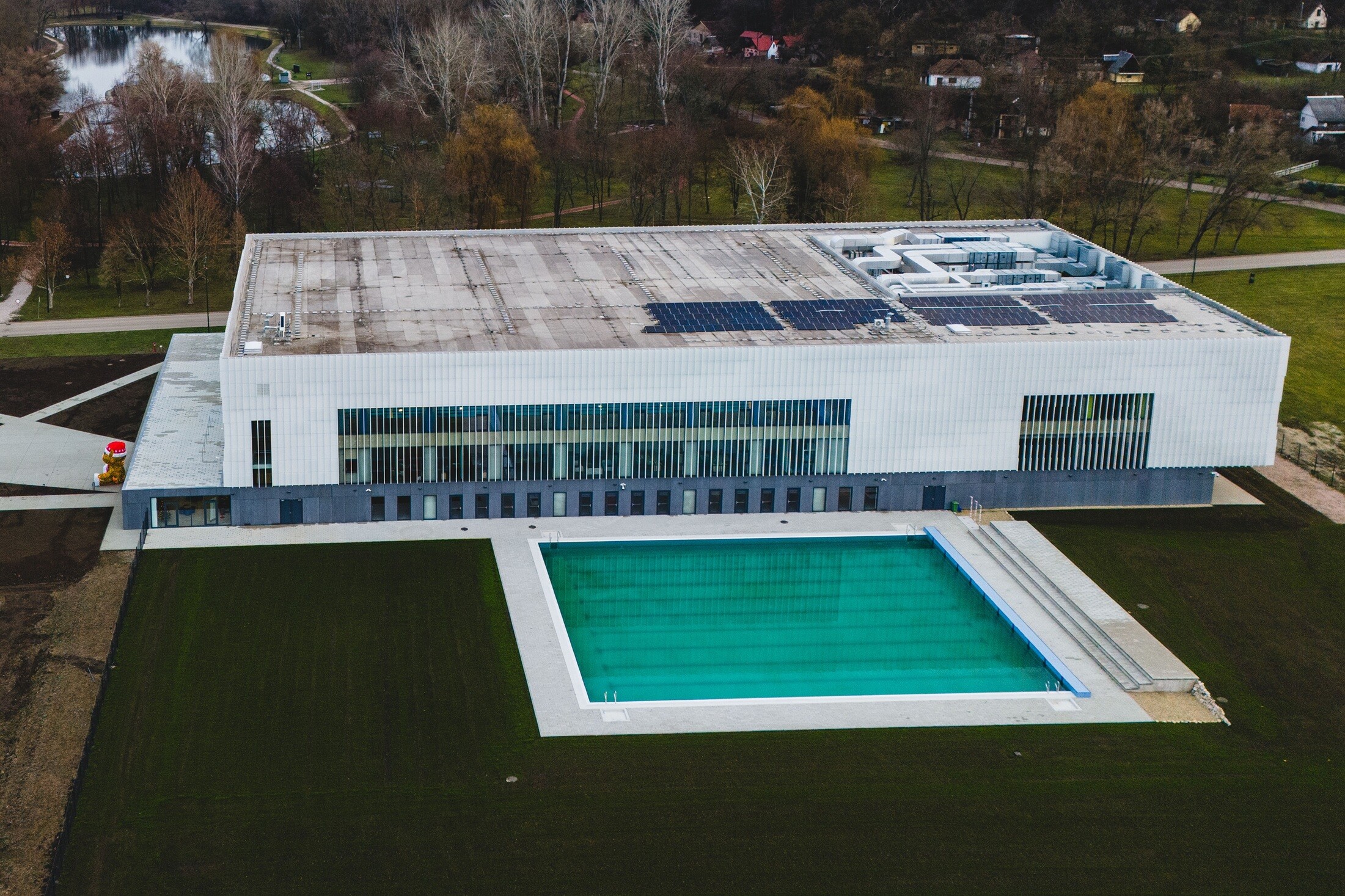 A komplexum egyik leglátványosabb eleme a FINA-szabályok szerint épült, 50 méteres versenymedence, amelyhez jelentős méretű lelátó is tartozik, így alkalmas nagyobb rendezvények, akár nemzetközi versenyek lebonyolítására is. Emellett kültéri úszómedence, két tanmedence, wellnessrészleg finn és infraszaunákkal, gőzkabinnal, pezsgő- és merülőmedencékkel, valamint modern konditerem várja a sportolókat és a pihenni vágyókat. A nyári melegben – a később épülő strand ízelítőjeként – kültéri medence is várja az úszni és kikapcsolódni vágyókat.