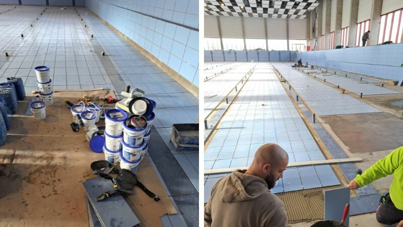 A medencék esetében a medencetest víztartási próbája után kezdődött meg a burkolás. Fontos volt, hogy az esetlegesen kilátszó betonacélokat a fémtisztára takarítást követően Mapefer 1K Zero korróziógátló-szerrel kezeljék, majd Mapegrout T40 betonjavító habarccsal betonvas takarást készítsenek. Ha ez nem történik meg, fent áll annak a veszélye, hogy a később elkészült epoxy fugán is átüt a rozsda. A következő lépésben az aljzat kiegyenlítése történt meg, ehhez Planitop Fast 330 anyagot alkalmaztak 3-30 mm vastagságban.