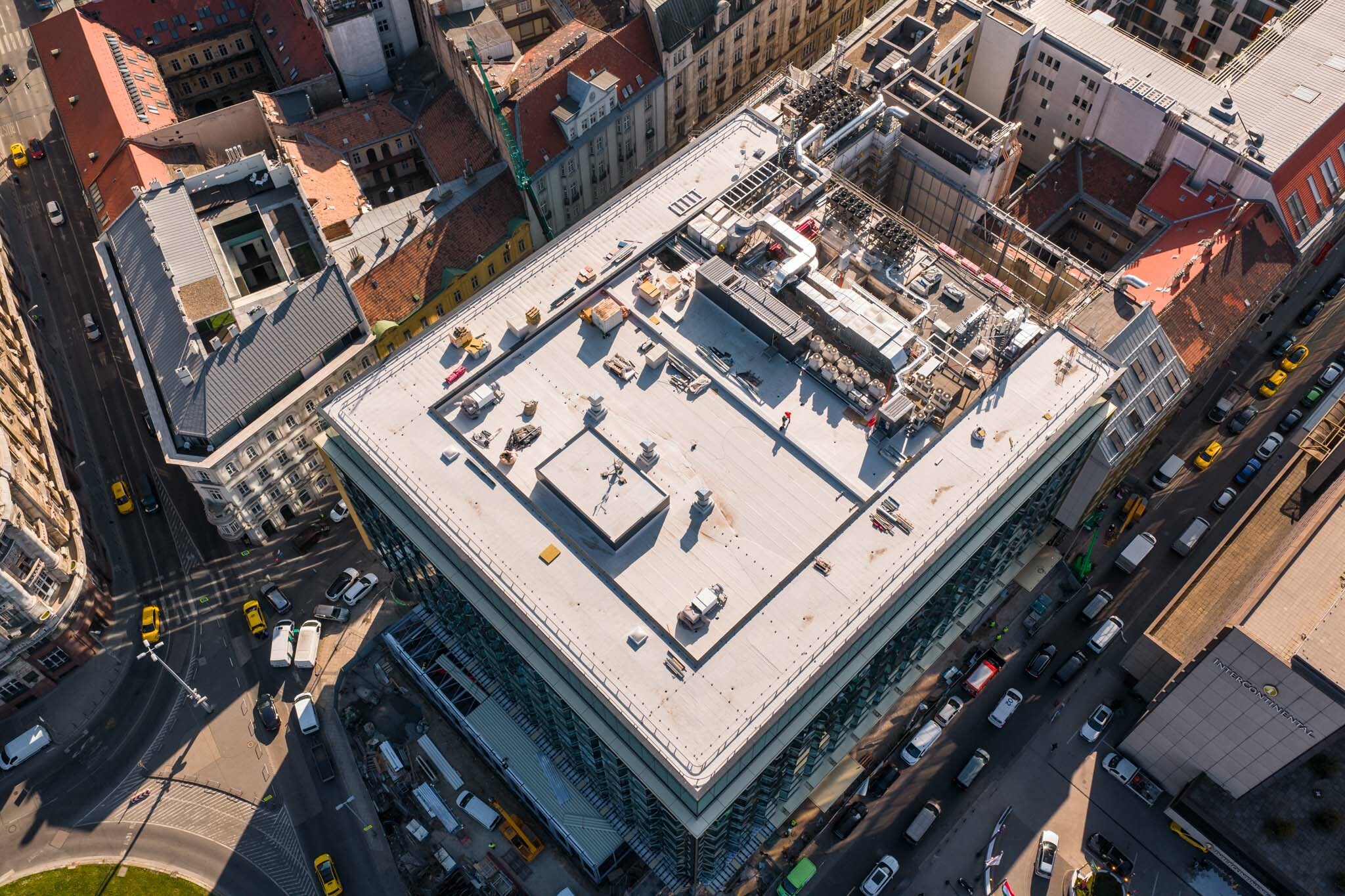 Az elmúlt közel egy évben jelentős előrehaladás történt a munkaterületen. A tetőszigetelés mintegy 90 százalékban elkészült, miközben az annex homlokzatok burkolása jelenleg is zajlik. Az épületben párhuzamosan haladnak a gépészeti és elektromos alapszerelések, a gépházak és az elosztók jelentős részét már telepítették.