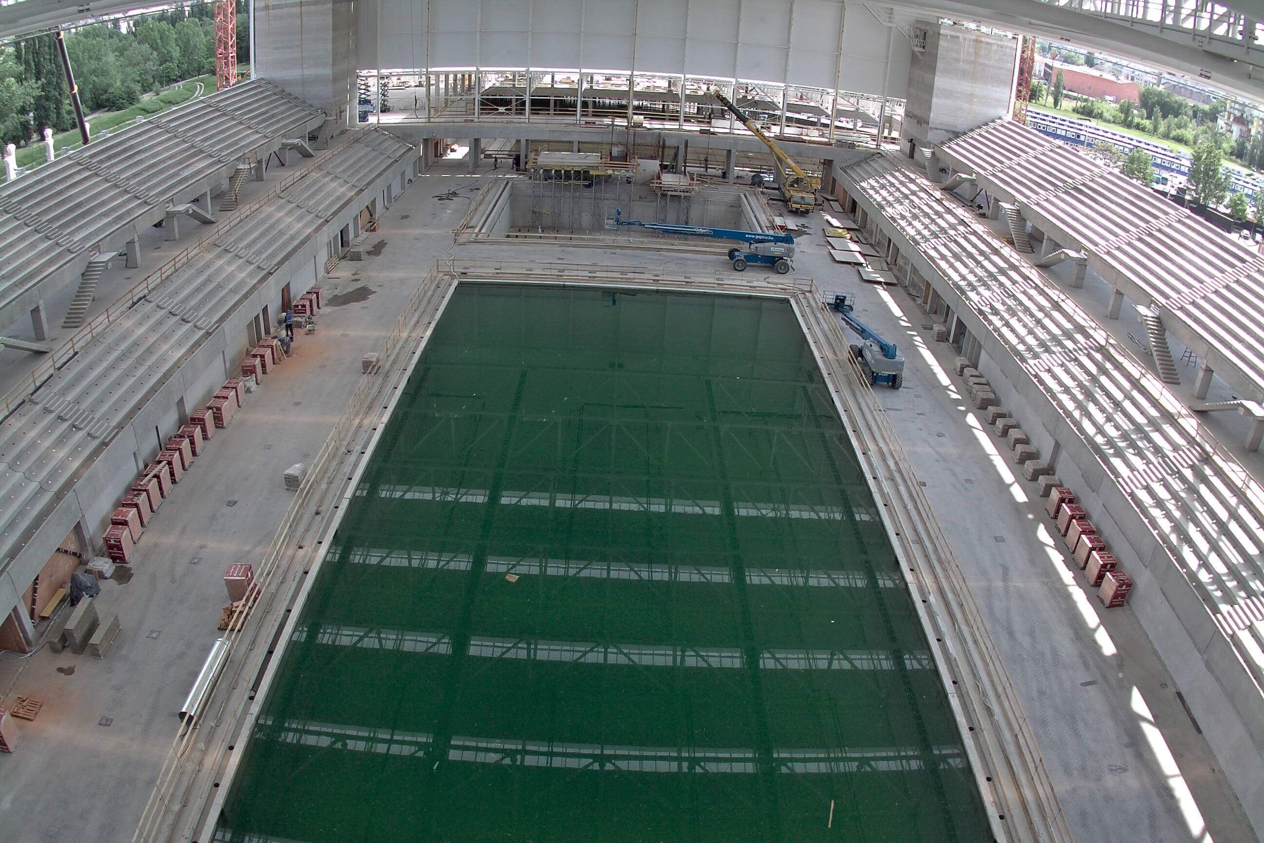 „A legnehezebb feladat nem a kivitelezés volt, hanem a tervezés” – kezdte beszámolóját Scheer Sándor. „Az alapkoncepción kívül ugyanis nem állt semmi a rendelkezésünkre, és egy szűk, nem körbejárható területre kellett egy minden igényt kielégítő uszodát megtervezni, úgy hogy fel tudjuk építeni ilyen rövid idő alatt. Az igazi kihívás tehát az építési megoldások kitalálása volt. Ha megvan a forgatókönyv, és már csak kivitelezni kell, akkor mi nyugodtak vagyunk, mert ahhoz értünk a legjobban.”