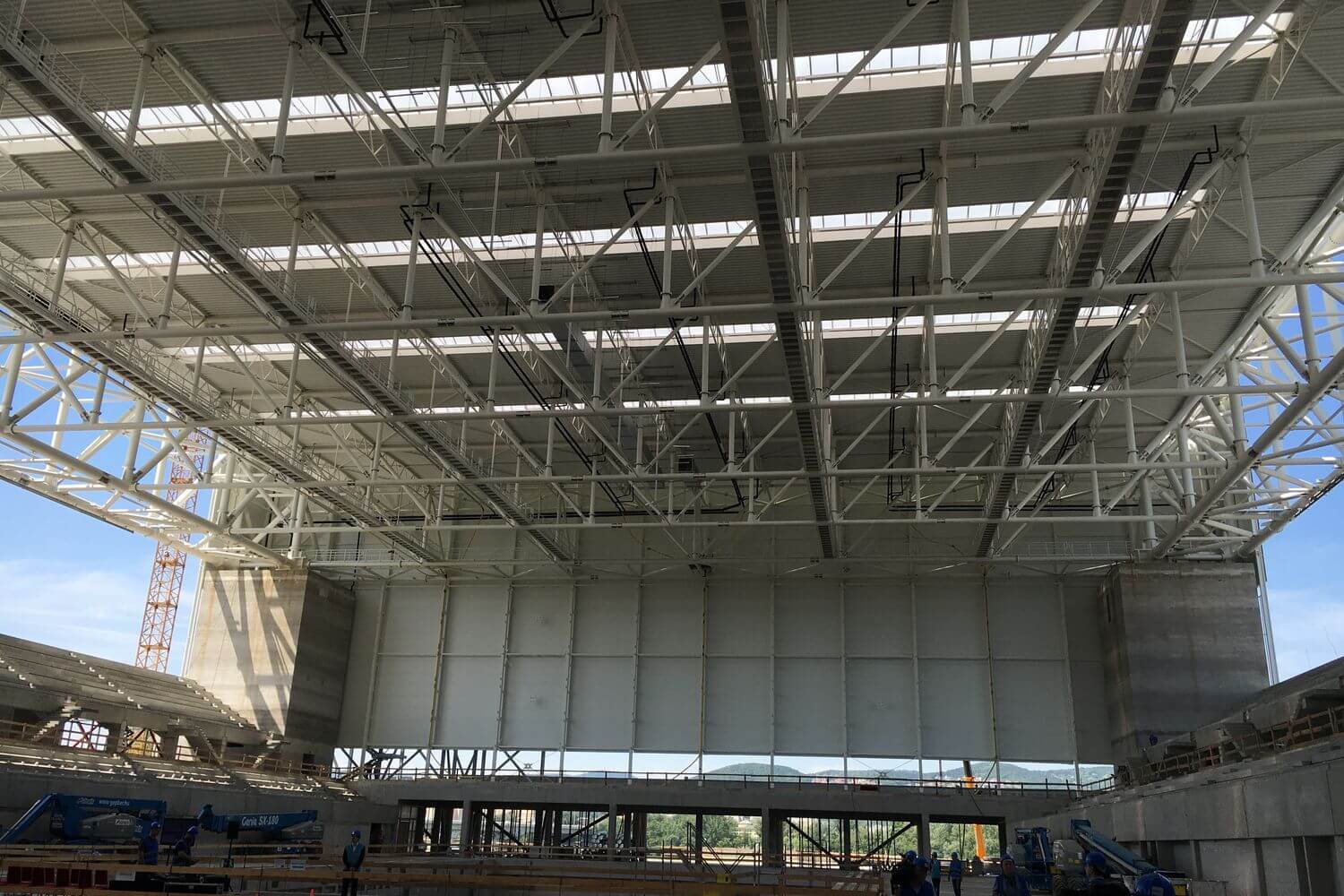 Az is nehézséget okozott, hogy a tetőszerkezet előbb került fel, és csak utána kerültek be a lelátó elemei: „Ezek alig daruzható, nem könnyen befűzhető elemek.”