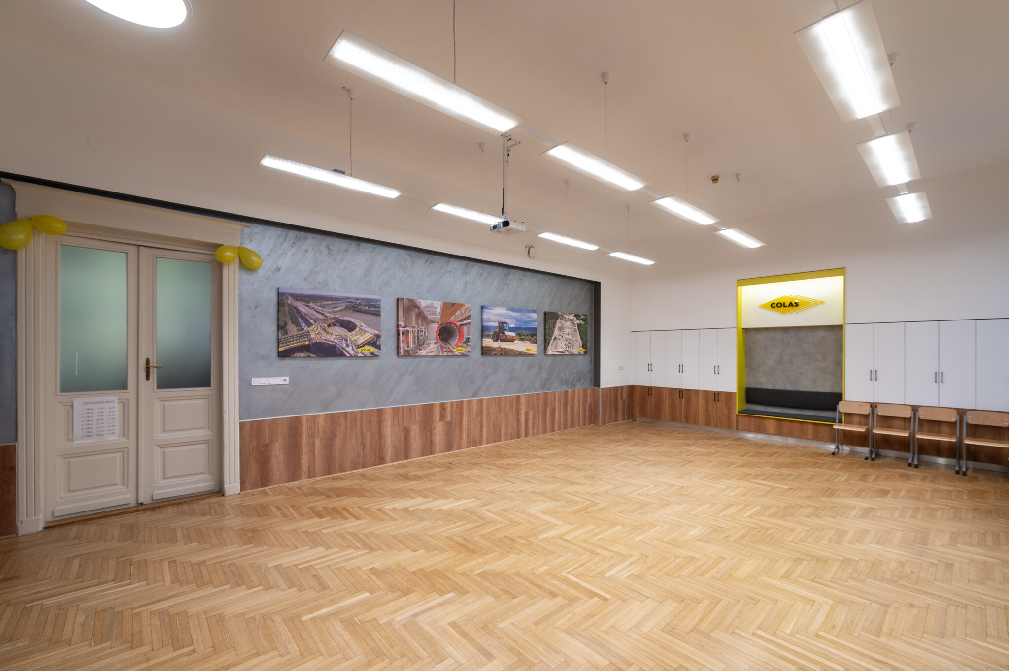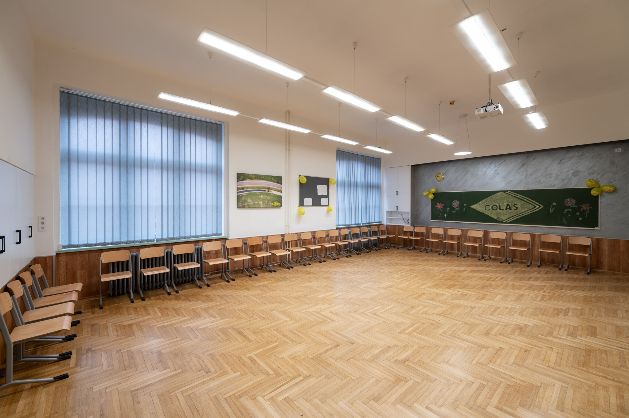 A megújult tanteremben felcsiszolták és újralakkozták a parkettát, a falakat kifestették, az oldalfalak dekorációs motívumokat kaptak. Kicserélték a nyílásszárókat, melyek színükben és anyagukban is illeszkednek az épület műemlék jellegéhez. Az ablakokat szalagfüggönnyel is felszerelték, a terem bejárati ajtaján pedig a korábbi rácsos üveget savmart üvegre váltották.