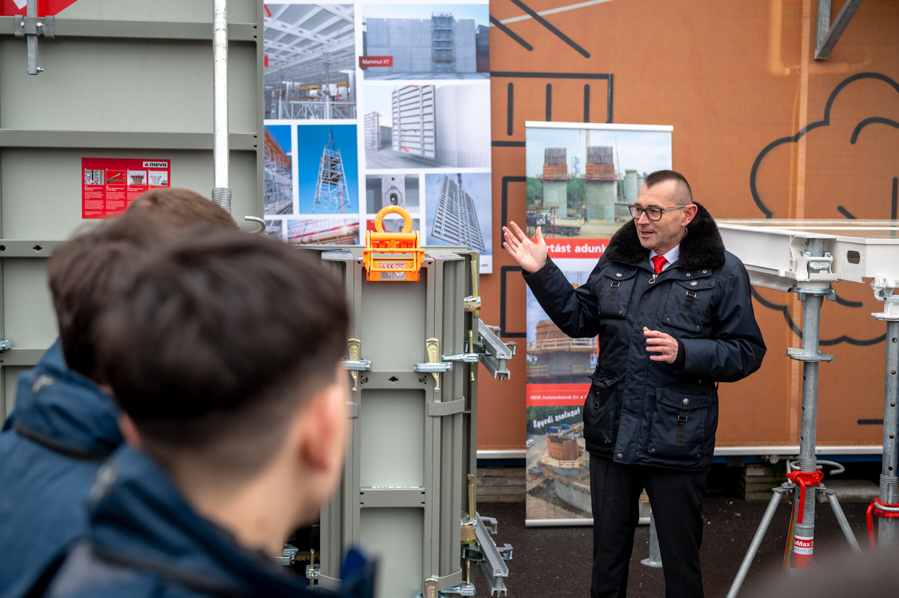 Könnyen megeshet, hogy legfrissebb tudást a fiataloknak kell majd az építkezésekre vinnie. Különösen igaz ez a látszóbeton felületekre, amelyek elkészítéséhez a MEVA zsaluk műanyag héja nagy segítséget jelent, hiszen ezek kivitelezése külön szakmai kihívás. „Műanyaghéj-javítási, polírozási metódusunk – tette hozzá Oberrecht Kálmán – kiemelkedik a piacon, amit örömmel mutatunk meg a diákoknak.”