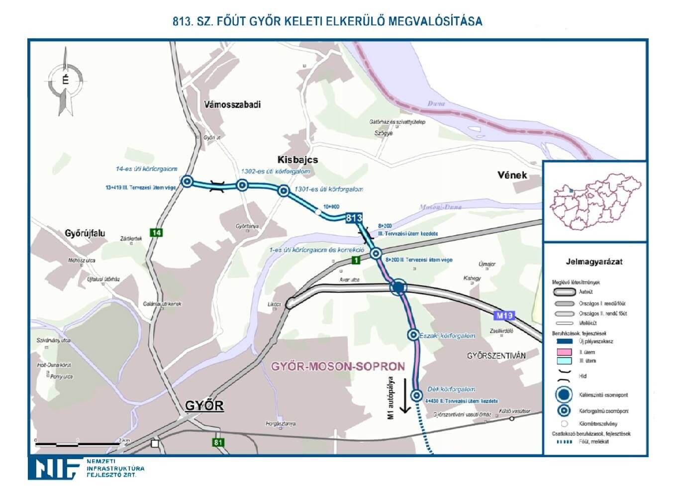 Áprilisban kezdődtek a munkálatok a Győrt keletről elkerülő 813-as út második, 3,8 kilométeres szakaszán. A kétsávos, másodrendű főút az M1-es autópályát köti majd össze a szlovákiai Nagymegyer felé vezető 14-es főúttal.