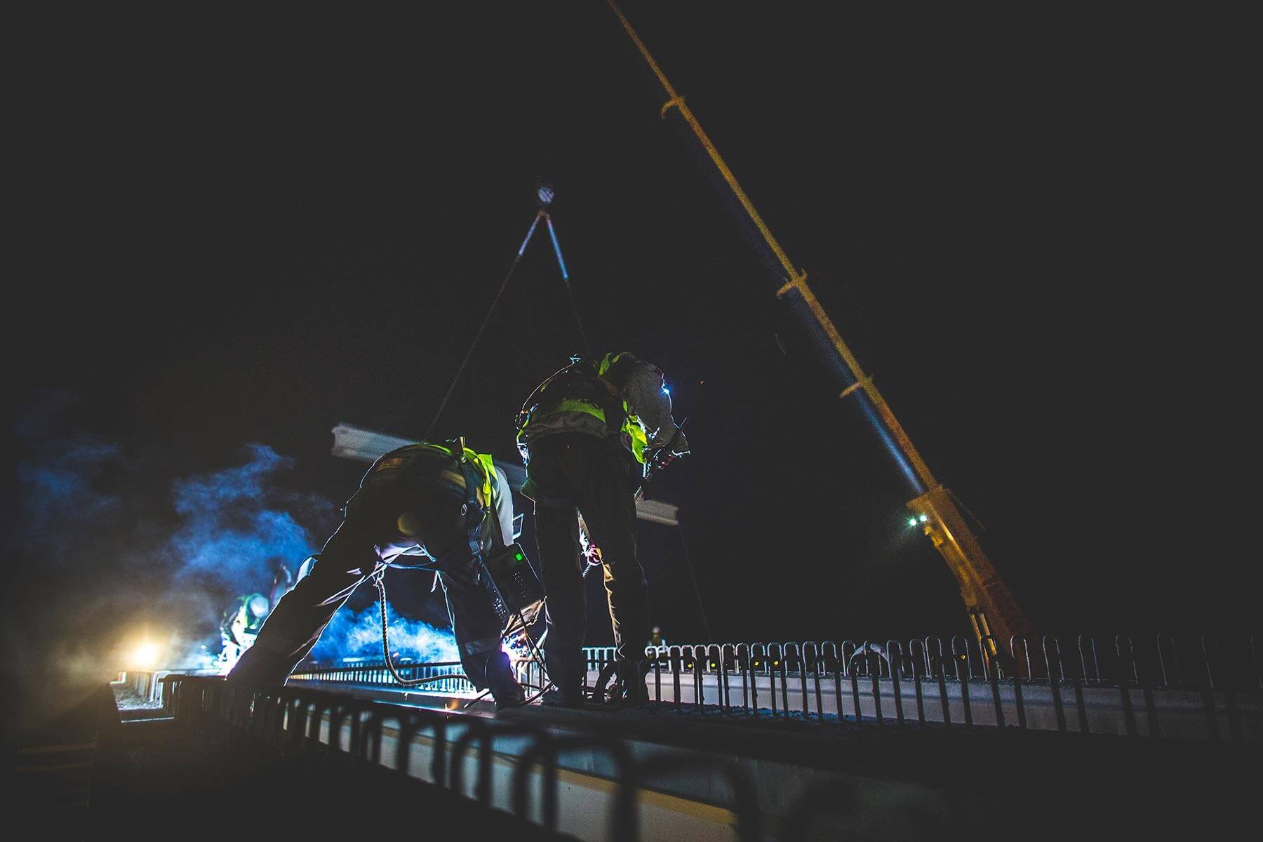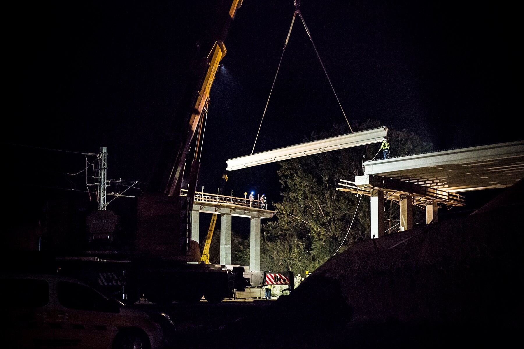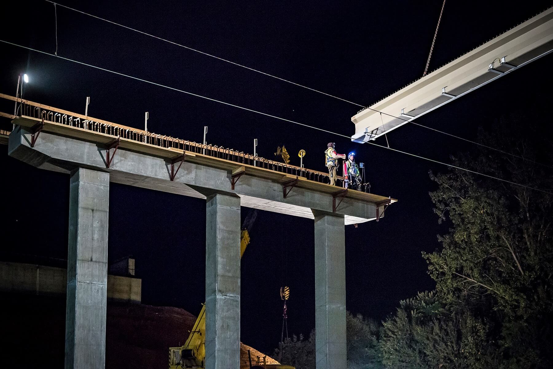 A NIF Facebook-oldala szerint a háromnyílású hídra mindössze 2 nap alatt helyezték fel a gerendákat. A 400 tonnás autódaruval végzett munkálatok éjszaka is zajlottak a 8-as számú vasútvonal felett.