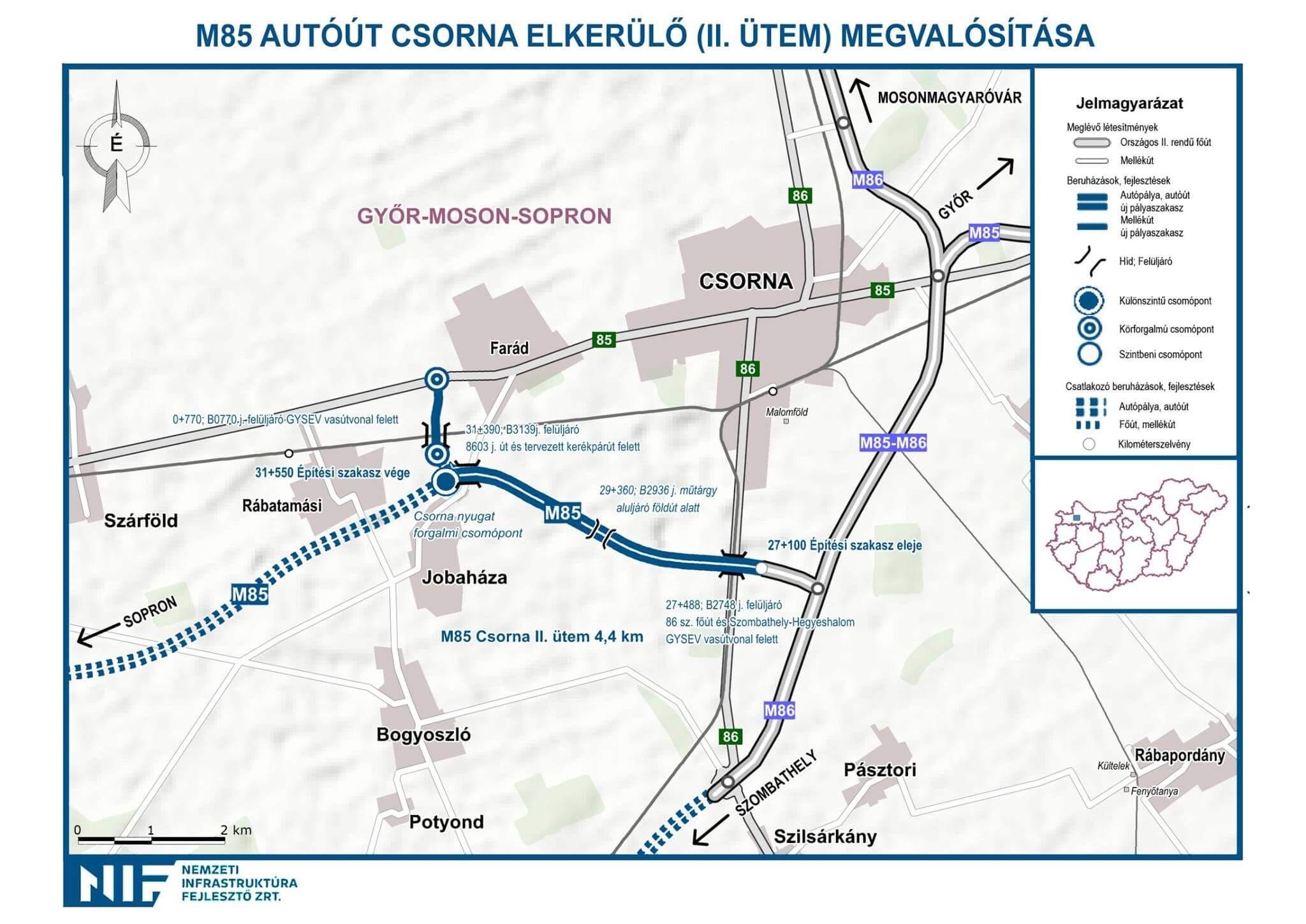 A csornai elkerülőt két szakaszban kivitelezik. A 12,5 kilométer hosszú első szakaszt tavaly szeptember 9-én nyitották meg, ezzel megvalósult a város észak-dél irányú elkerülése. A most épülő második szakaszon a kelet-nyugati elkerülés biztosítására 4,45 kilométer hosszan kétszer két forgalmi sávos gyorsforgalmi autóút épül, valamint a már említett 1,6 kilométeres visszakötés.