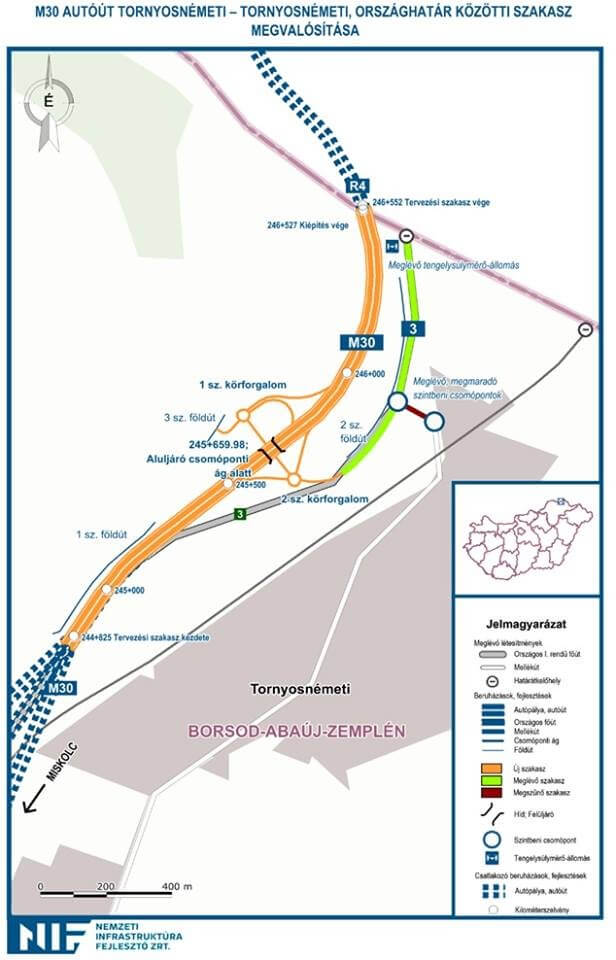 A most épülő 1,7 km hosszú, kétszer kétsávos autóút az országhatáron csatlakozik majd a szlovák R4 gyorsforgalmi úthoz. Az M30-as Miskolc és Tornyosnémeti közötti 60 kilométeres szakasza további beruházásban készül el, a kormány ütemterve szerint legkésőbb 2022 első negyedévéig.