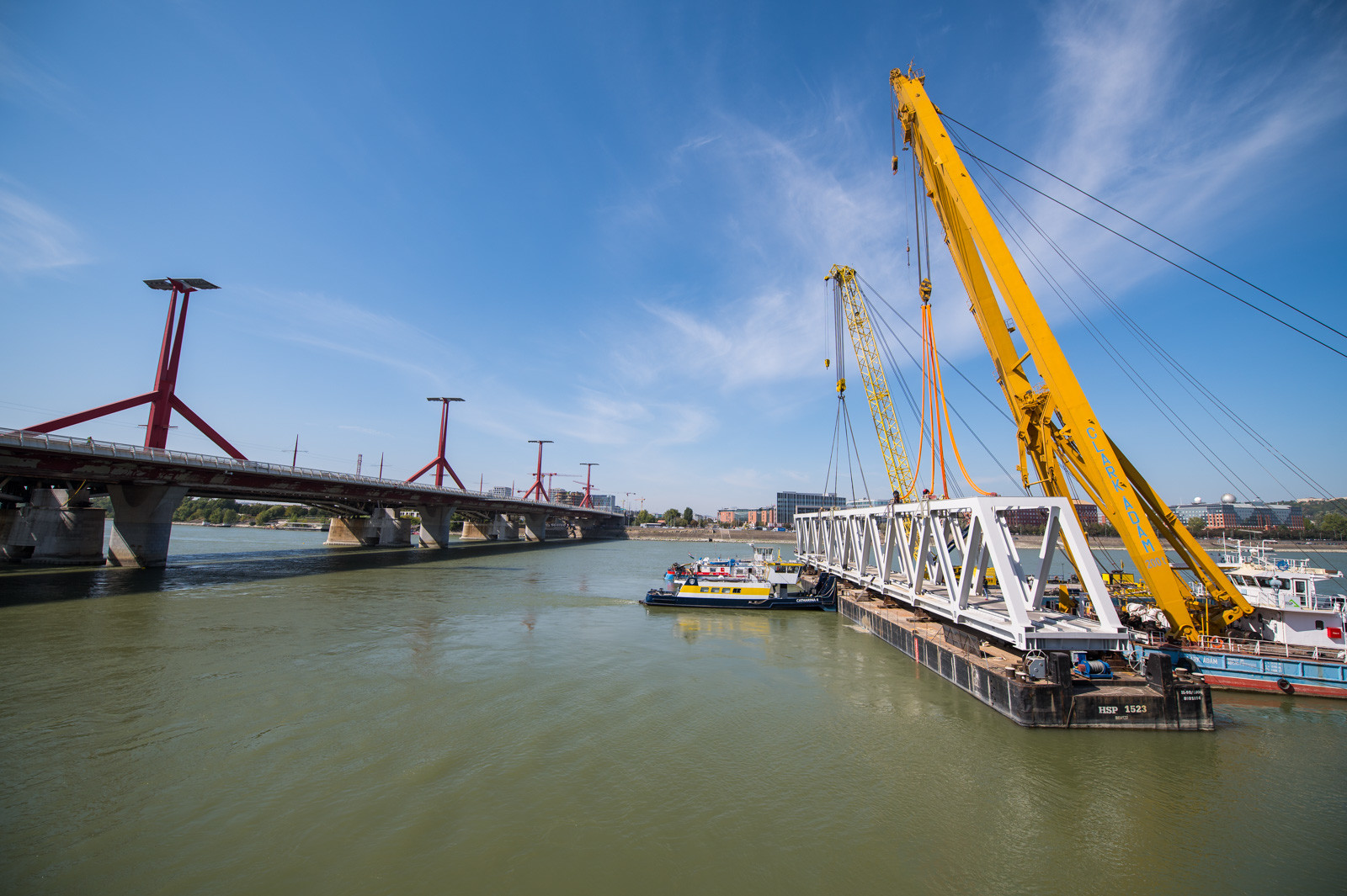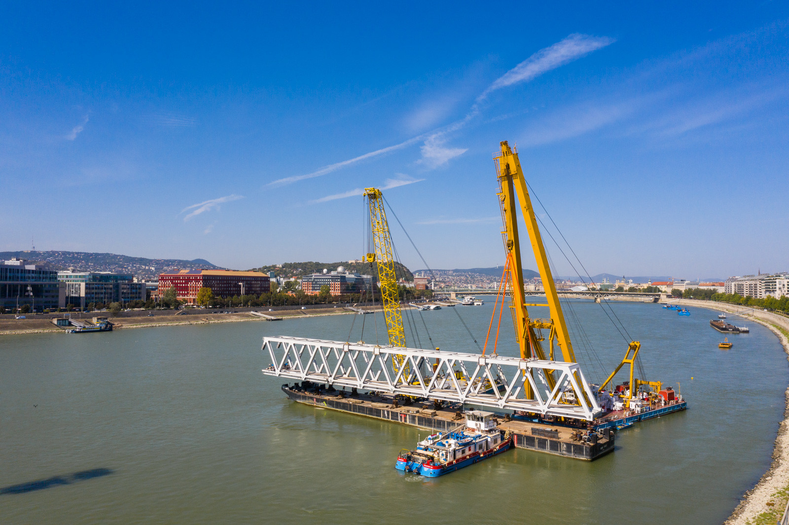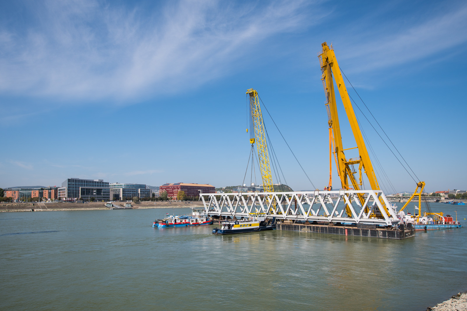 Helyére kerül a Duna Aszfalt kivitelezésében megújuló Déli összekötő híd első eleme. A rendkívüli körülmények miatt a hídelemeket alulról emelik be egy speciális emelőművel.
