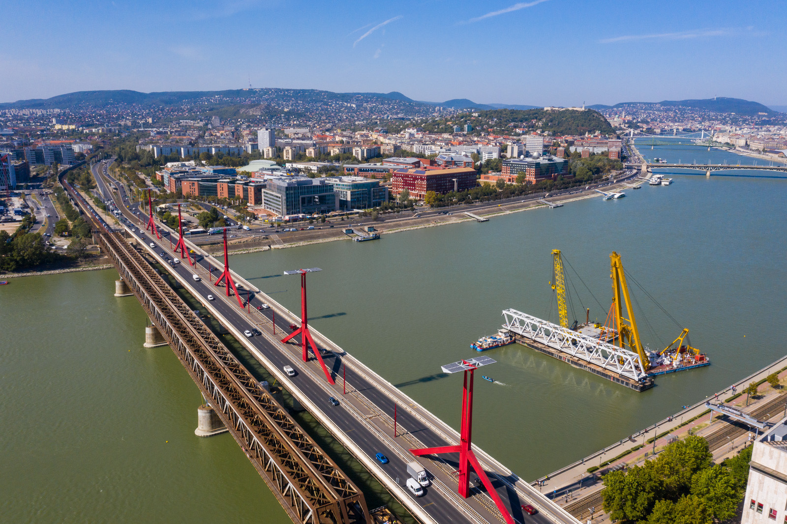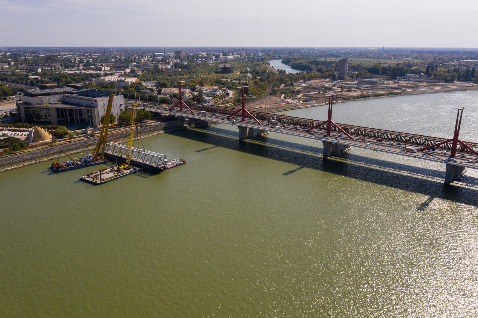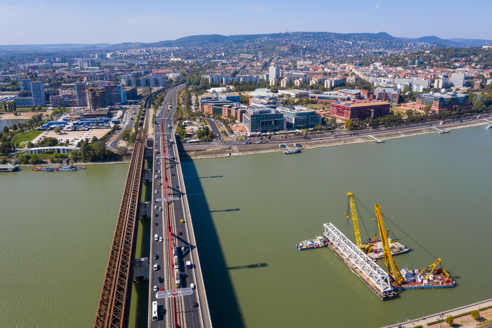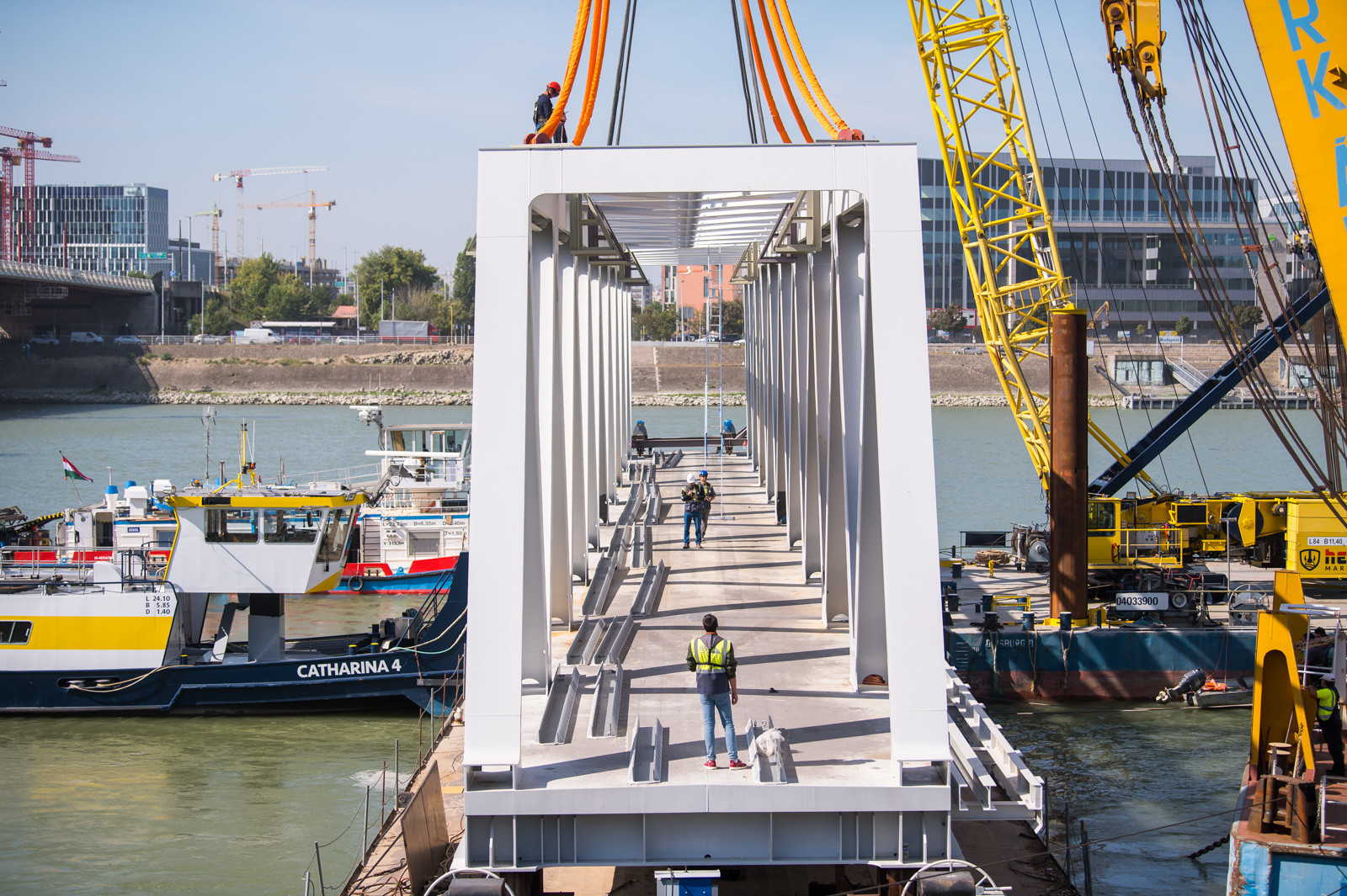 Helyére kerül a Duna Aszfalt kivitelezésében megújuló Déli összekötő híd első eleme. A rendkívüli körülmények miatt a hídelemeket alulról emelik be egy speciális emelőművel.