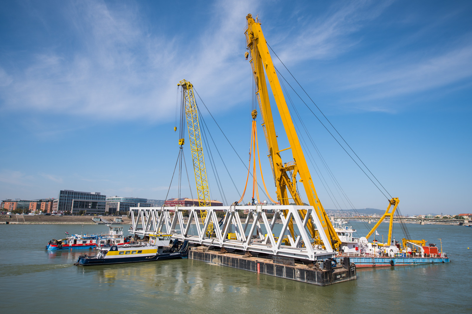 A beruházó NIF beszámolója szerint a hétfői munkálatok leglátványosabb mozzanata, amikor az úszódaruk a hídszerkezetet a rögzítések után átemelik az emelőműre.
