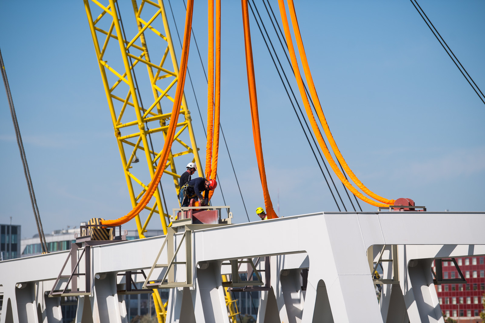 A most elkezdett munkafolyamat az első hídelem beemelését és pozícióba húzását foglalja magába.