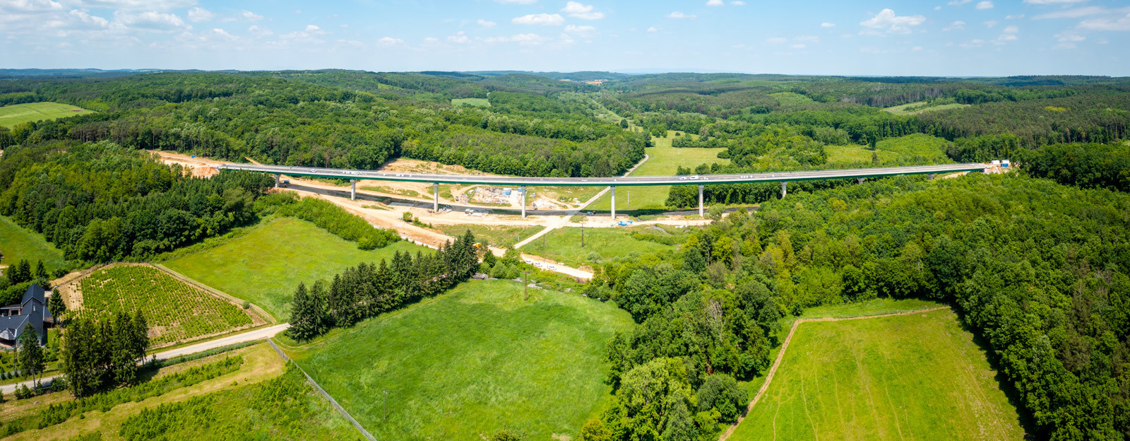 Az impozáns megjelenésű hídszerkezet létjogosultsága abból fakad, hogy a tervezésnél a távlati autópálya paramétereit kellett figyelembe venniük, a magassági vonalvezetés követelményei pedig szükségessé tették, hogy a 24 méter magas völgyet, amelyben a Vörös-patak is húzódik, híddal íveljék át.