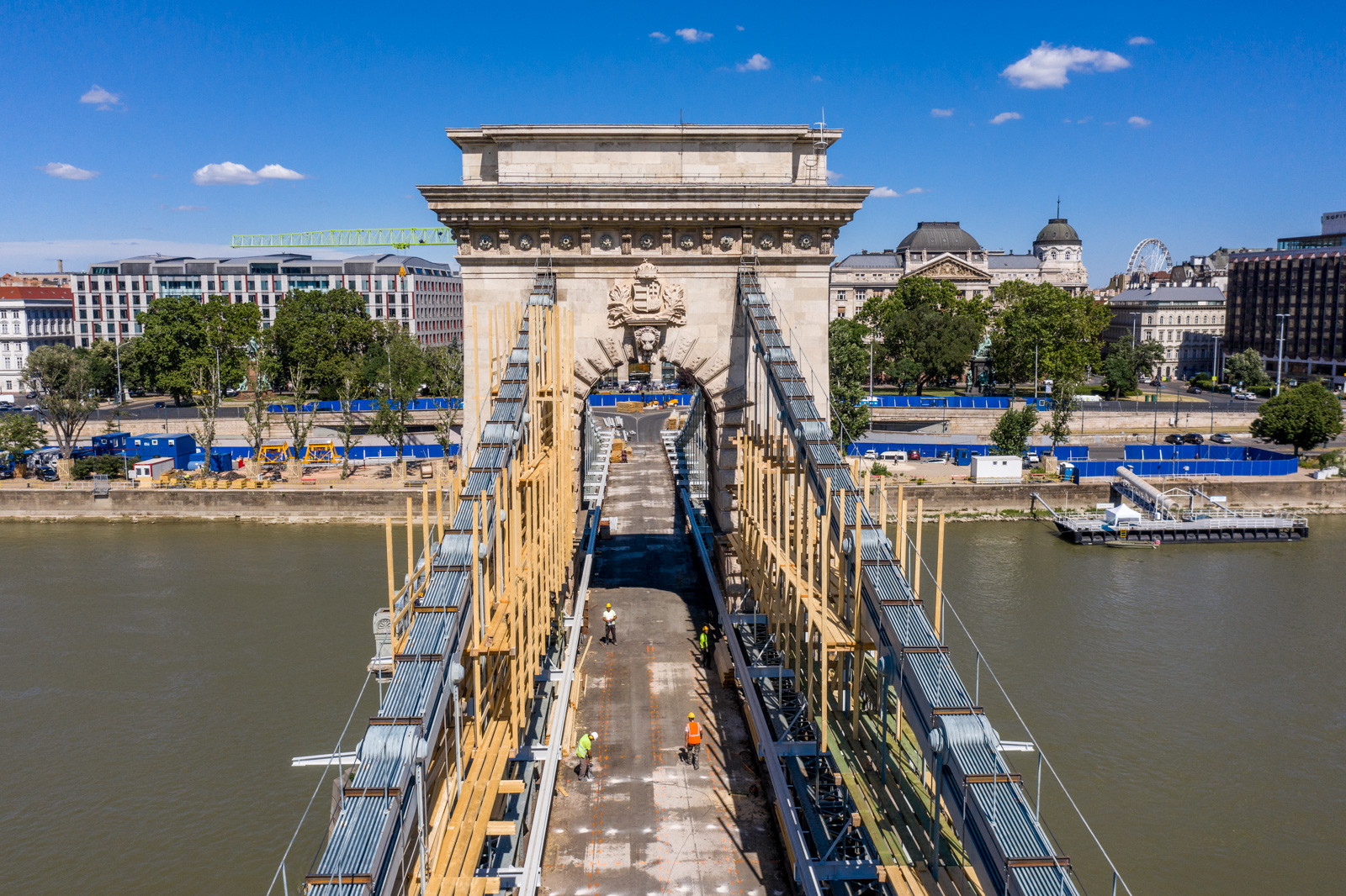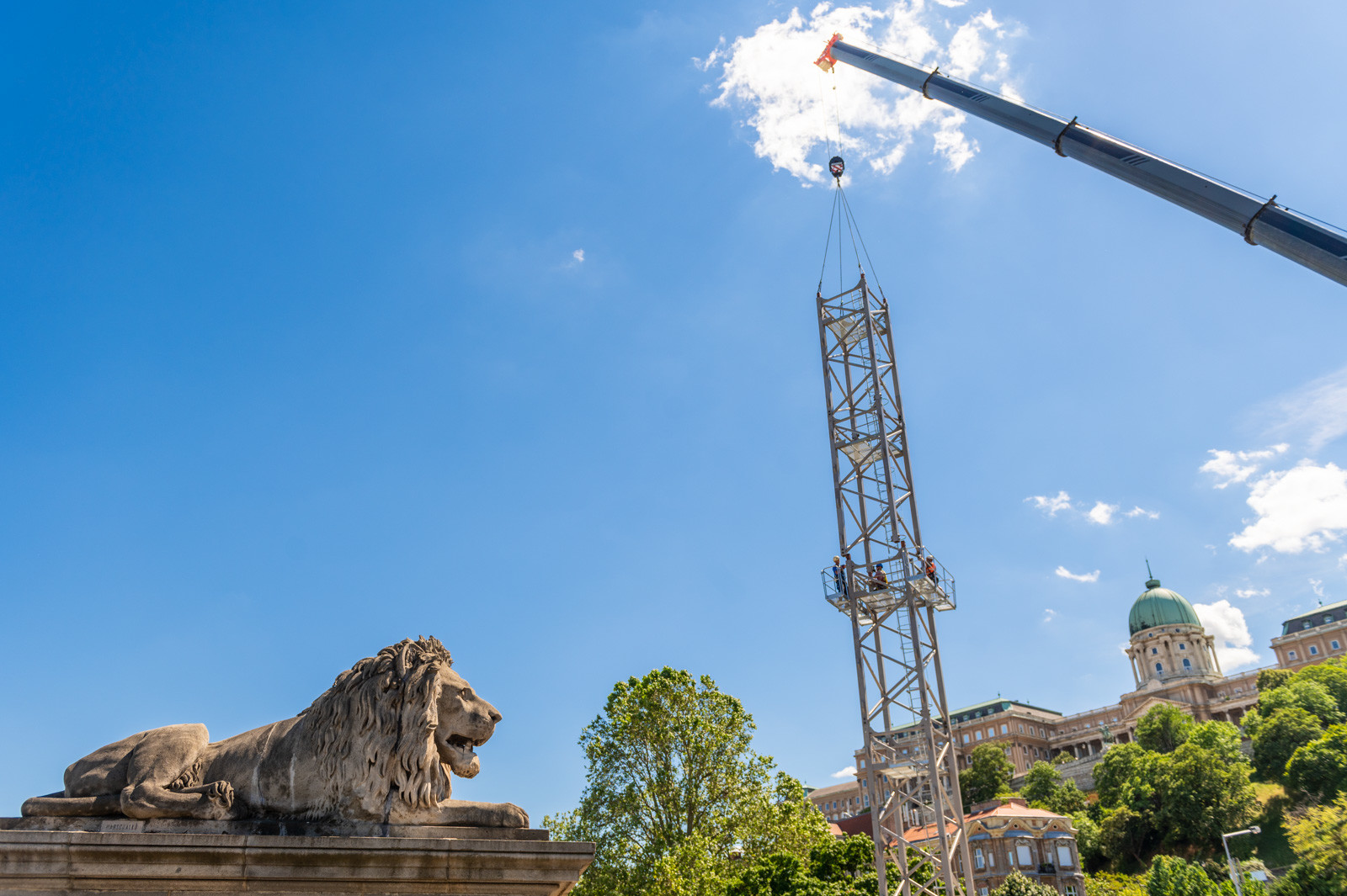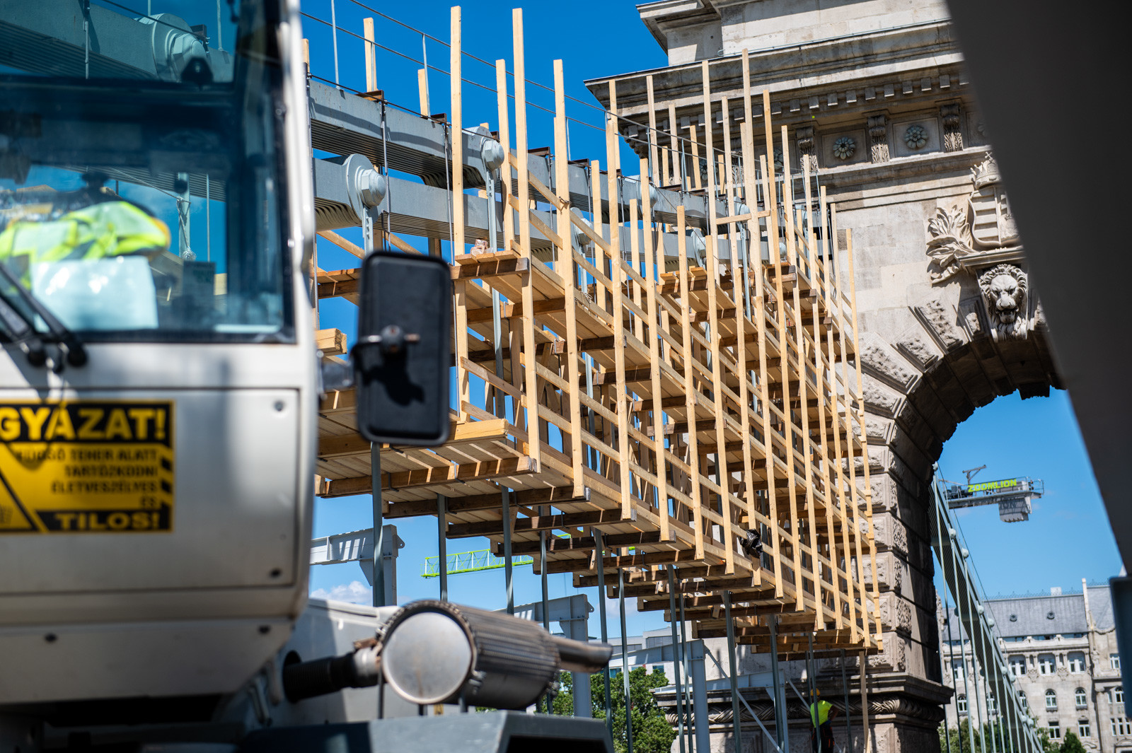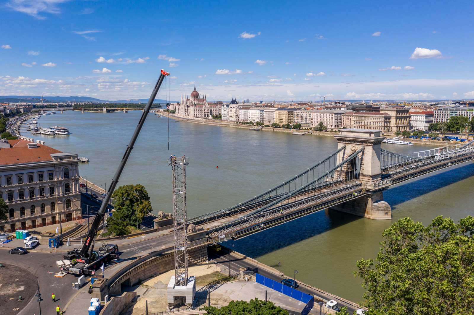 Az A-Híd kivitelezésében felújítást és restaurációt kapó fővárosi híd beruházását két daru segíti.