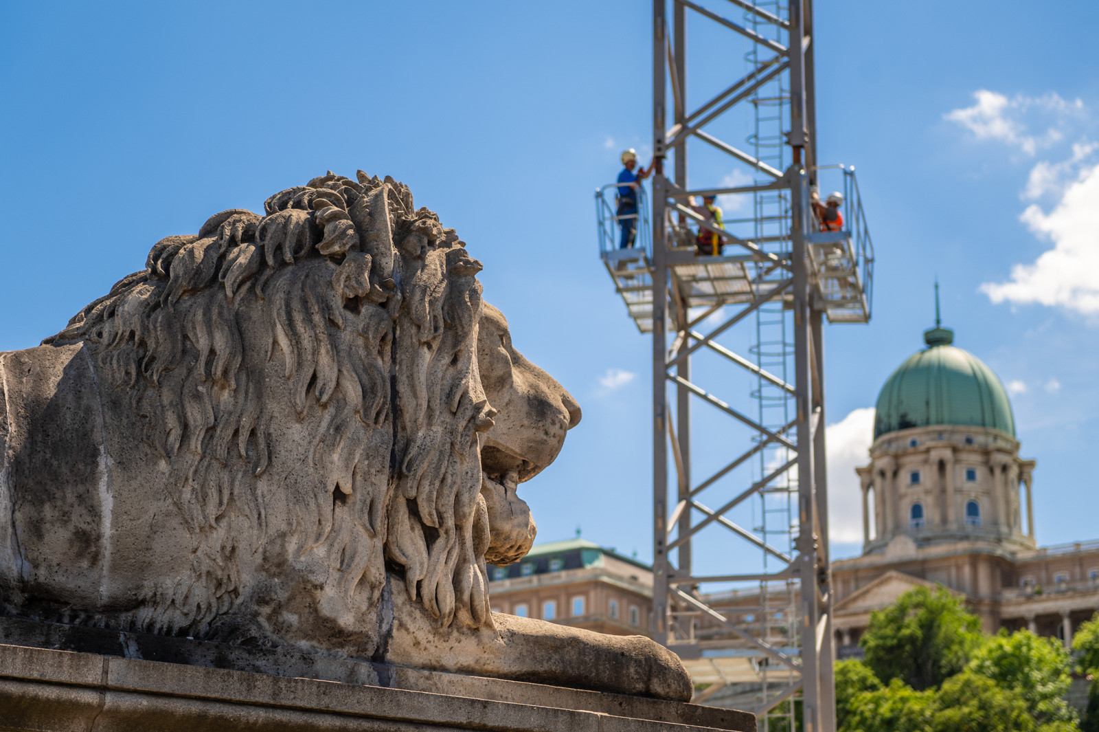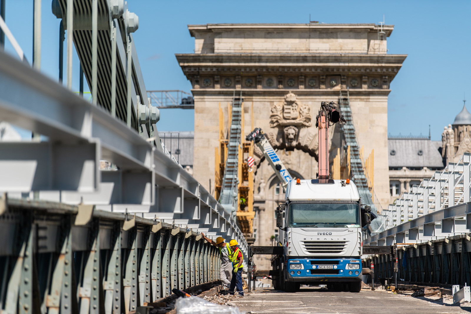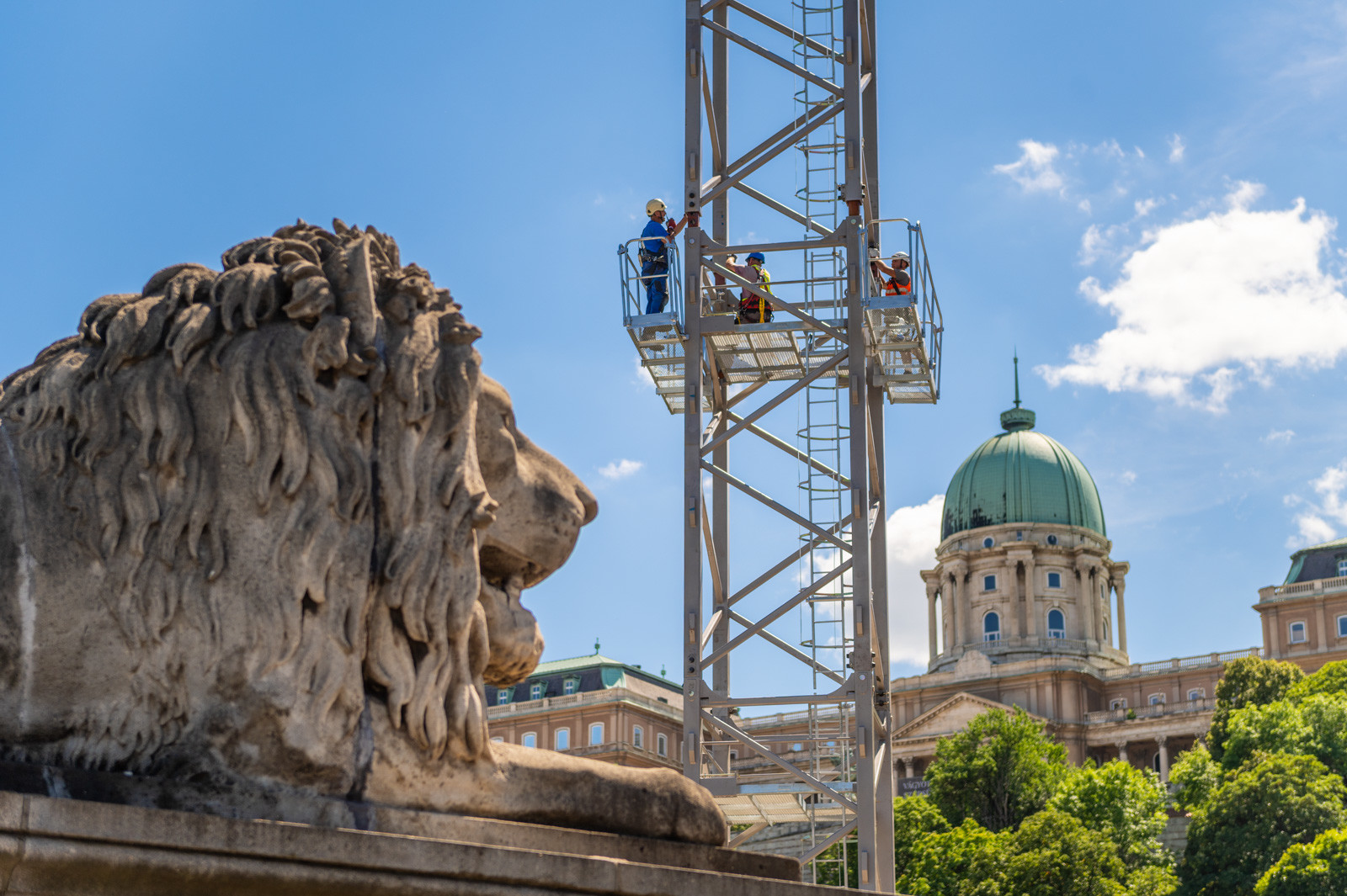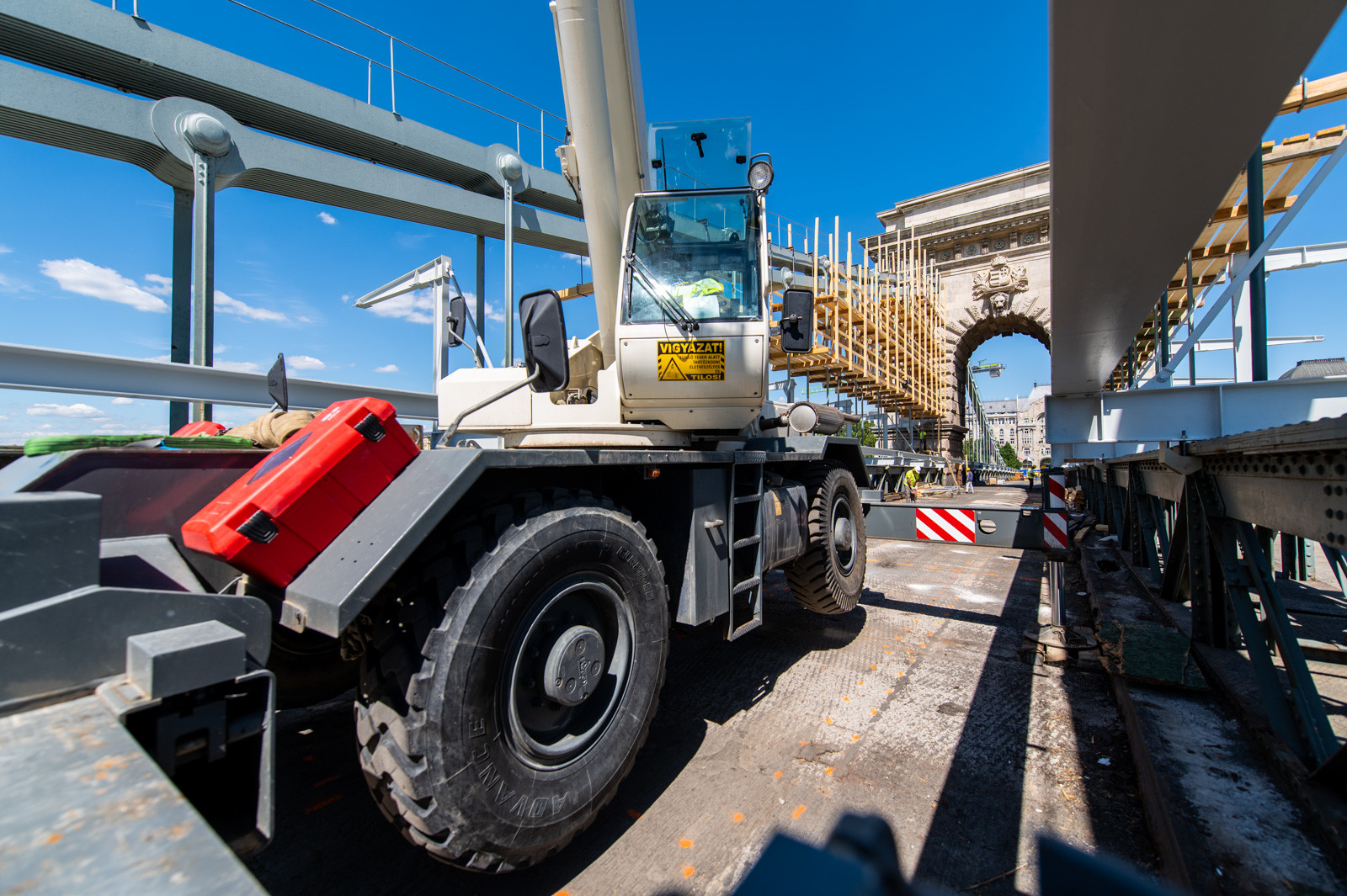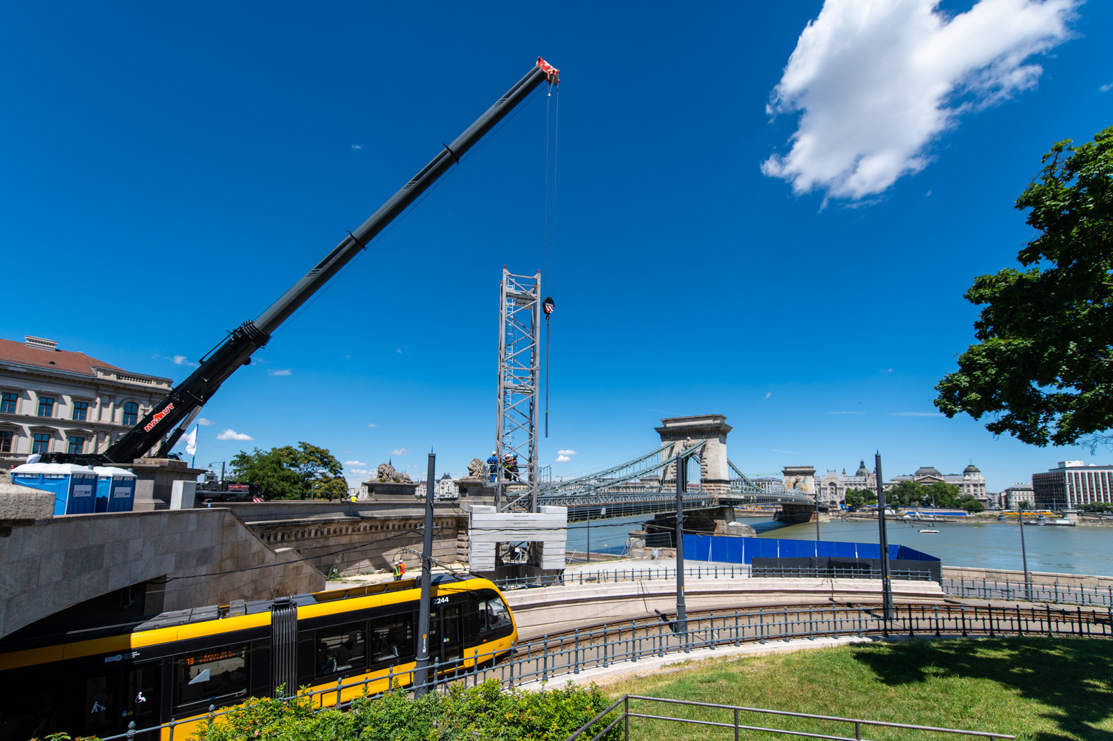 Az A-Híd kivitelezésében felújítást és restaurációt kapó fővárosi híd beruházását két daru segíti.