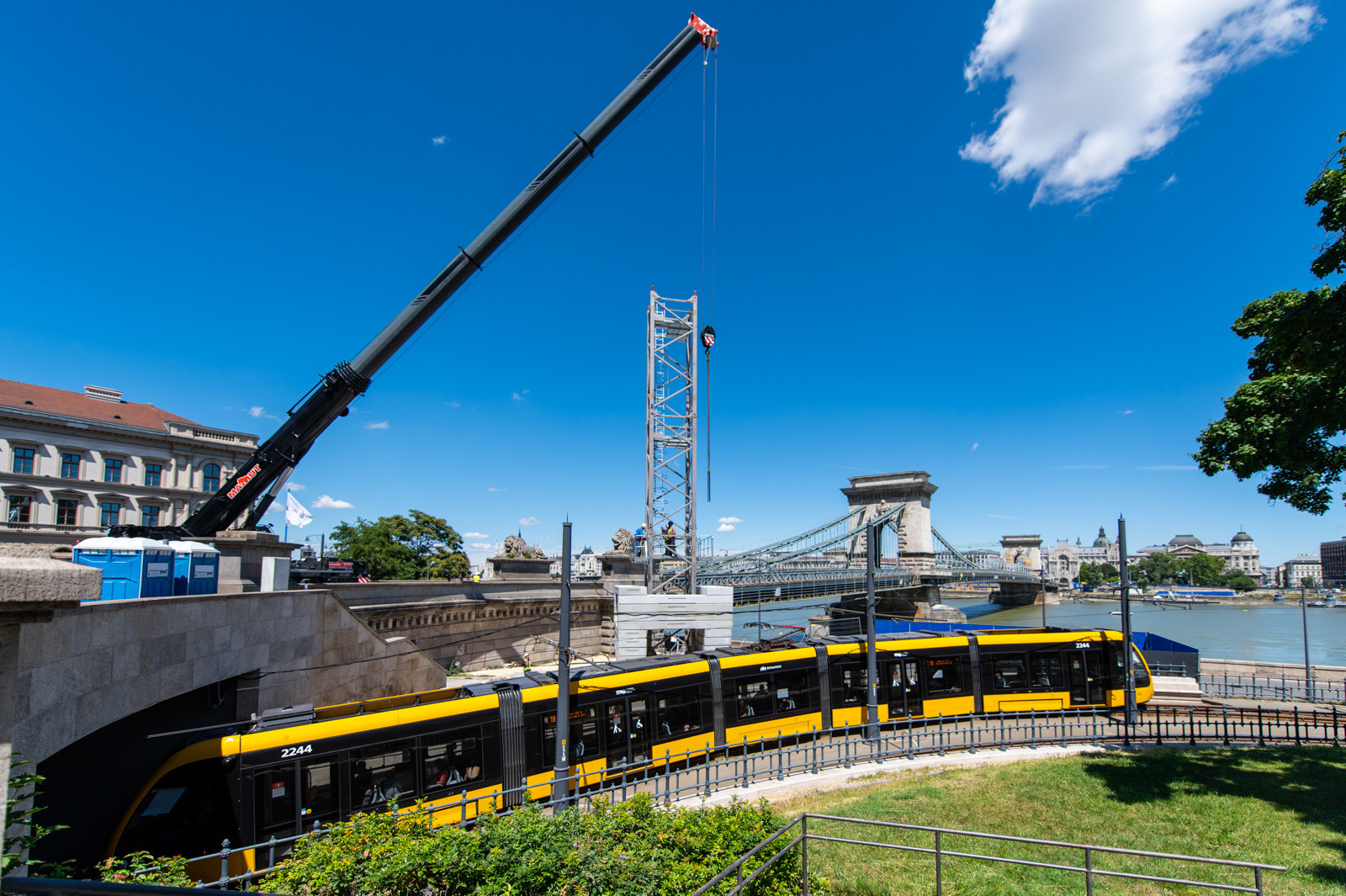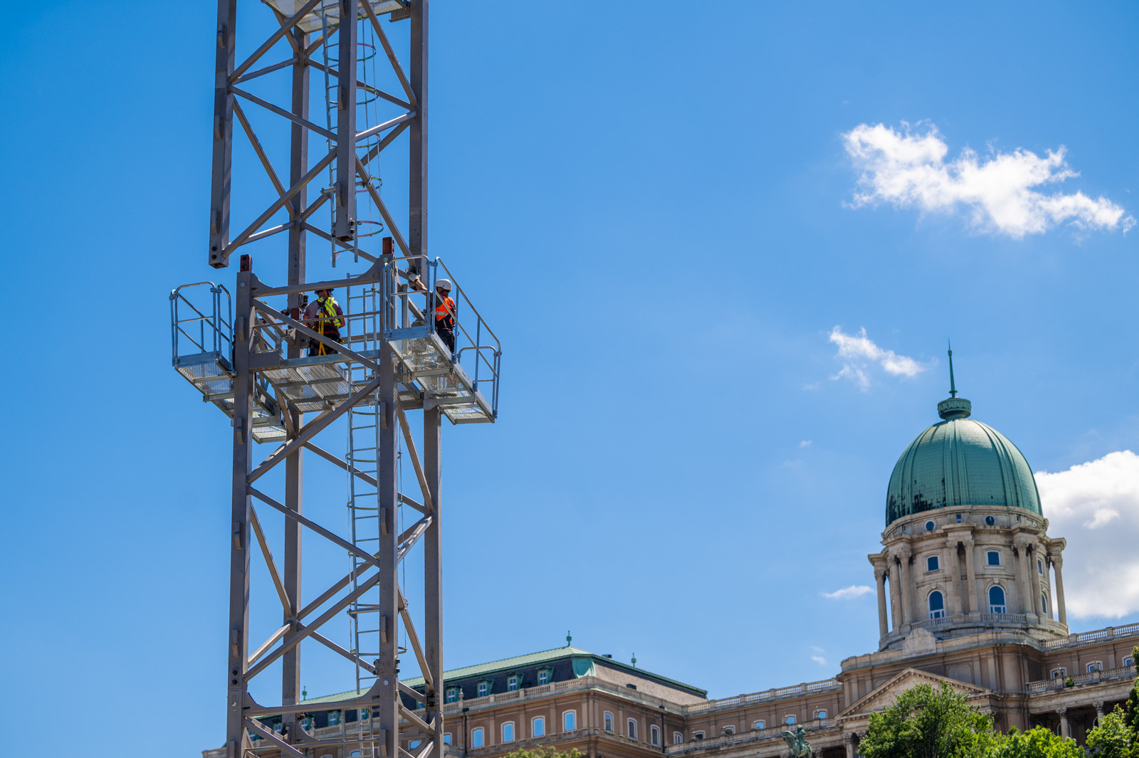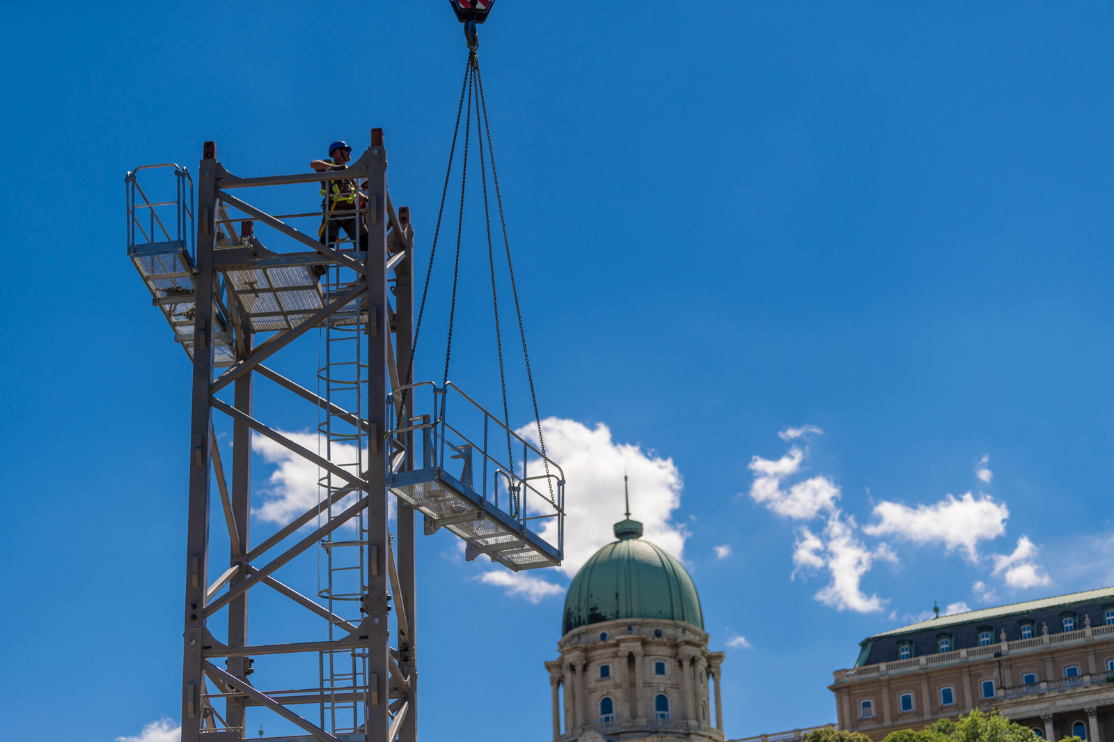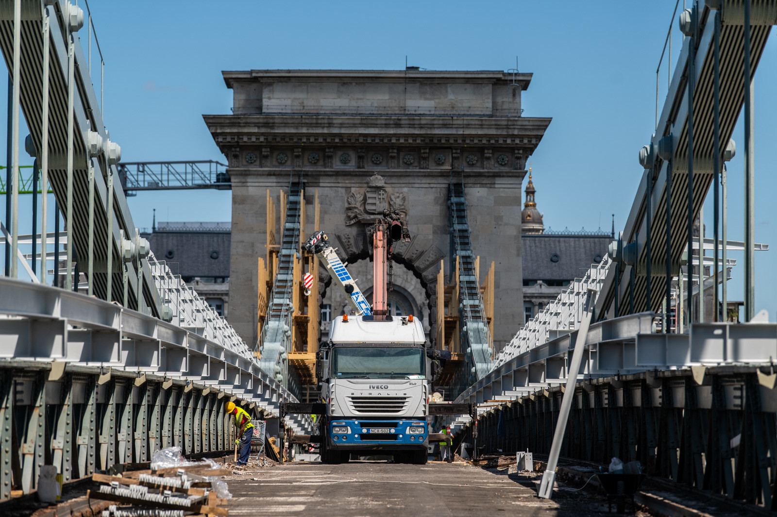 Az A-Híd kivitelezésében felújítást és restaurációt kapó fővárosi híd beruházását két daru segíti.