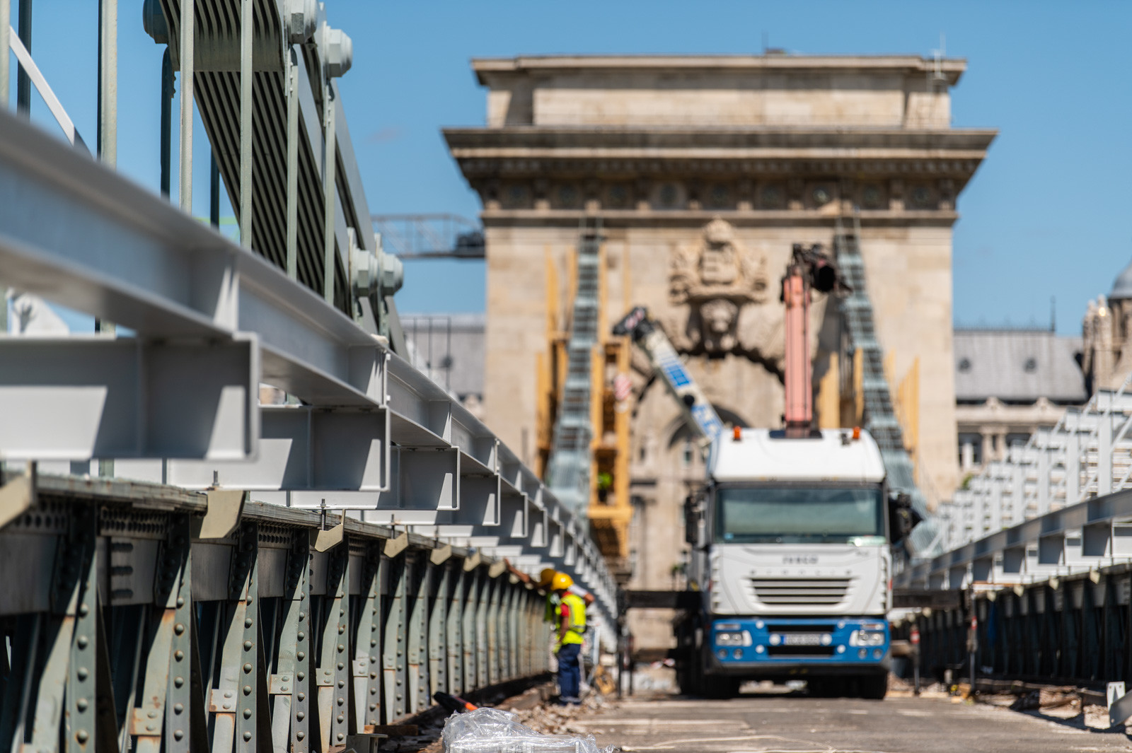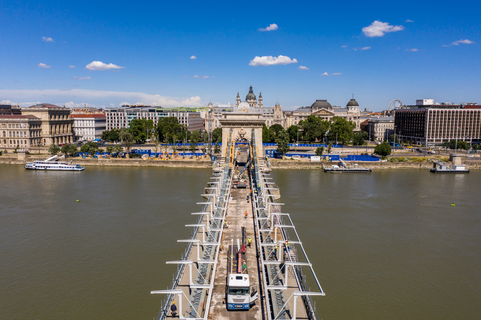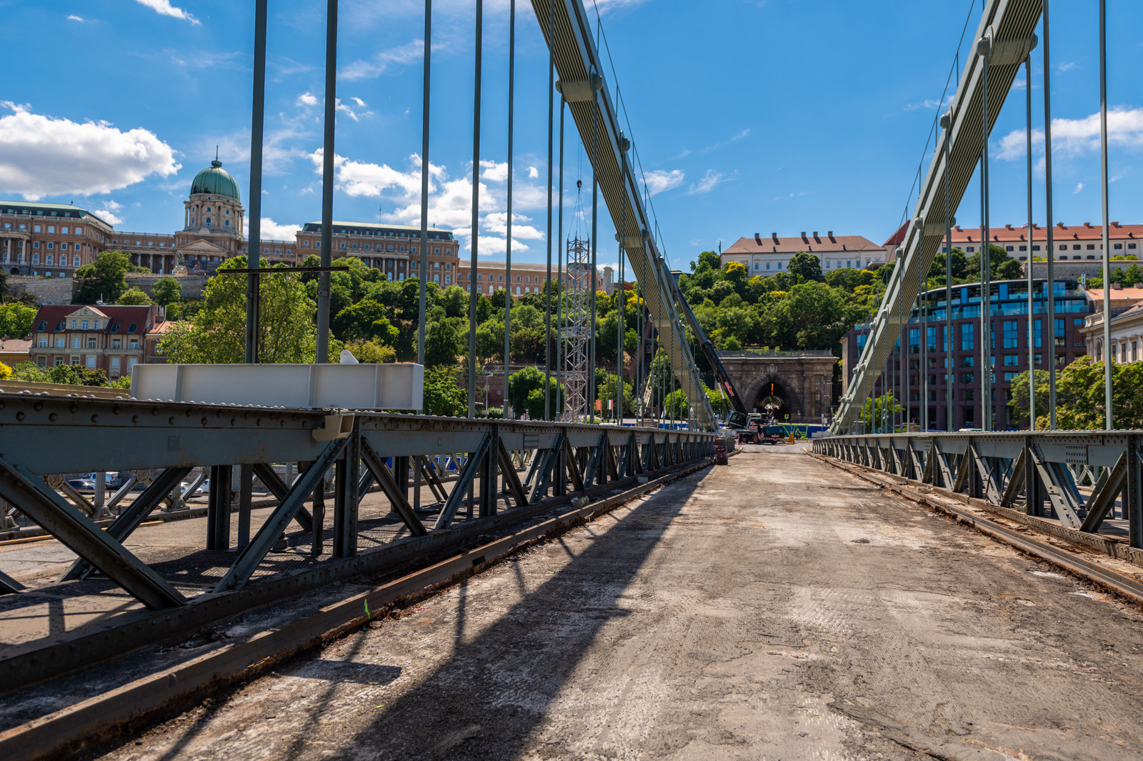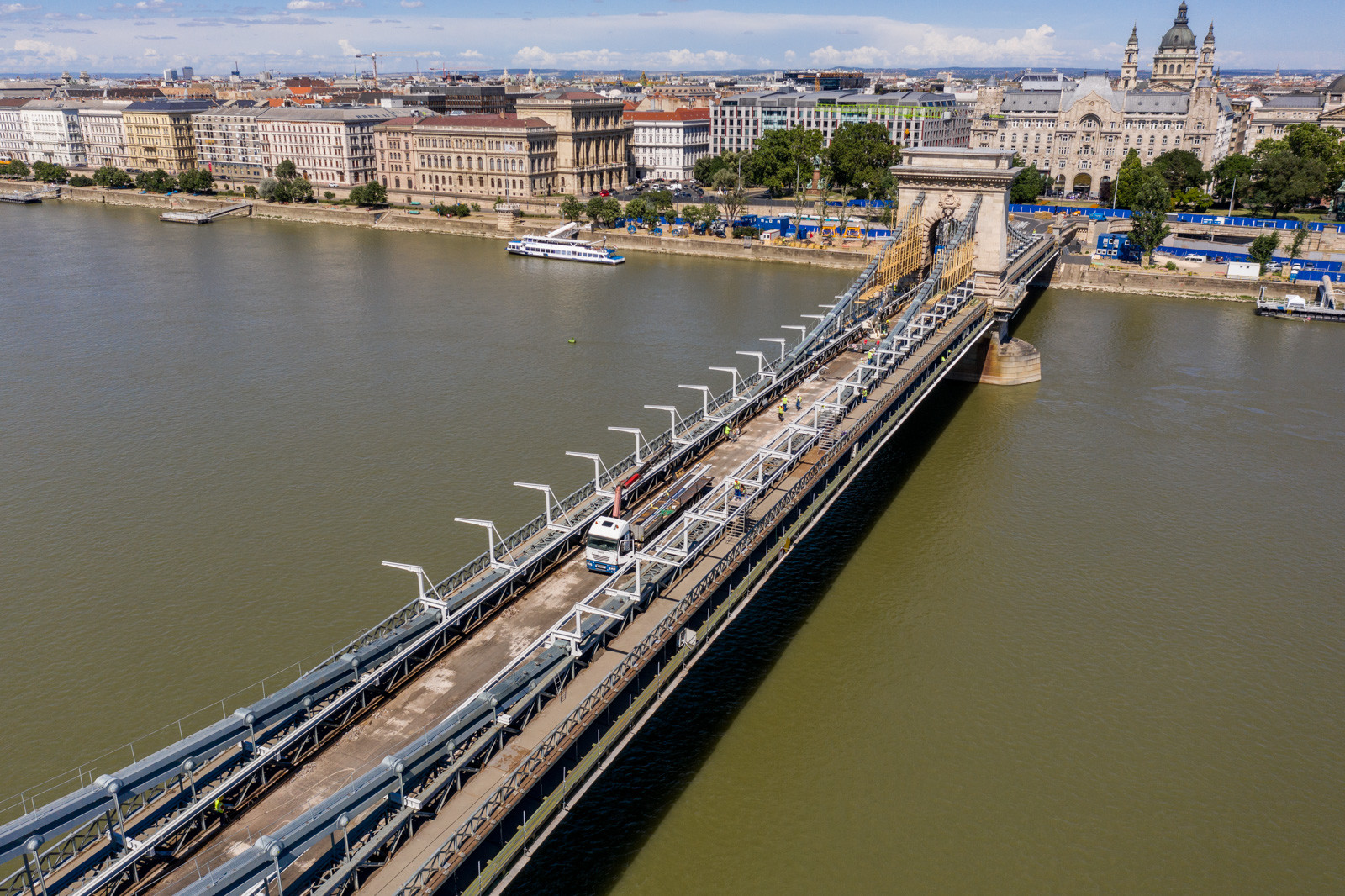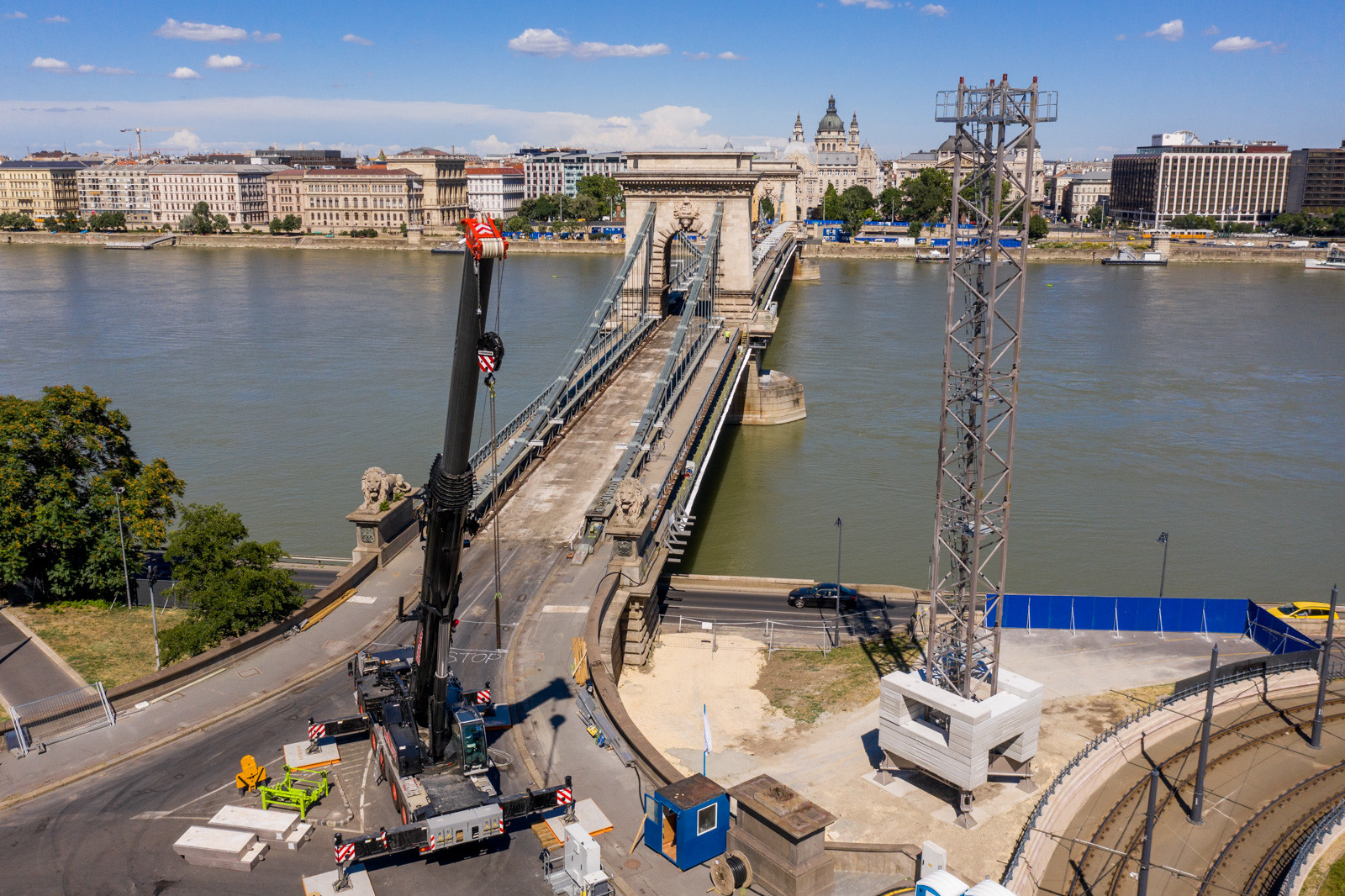 Mindeközben már épül a hídon végigvezető sínpályarendszer, amelyen a Lánchídra telepített két bakdaru közlekedik majd, a középső medernyílásban pedig készül a láncok korrózióvédelméhez szükséges állványzat is. Megkezdődött továbbá még a járdaszegélyek bontása is.