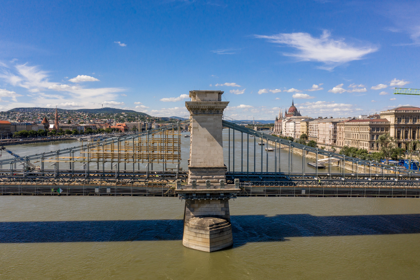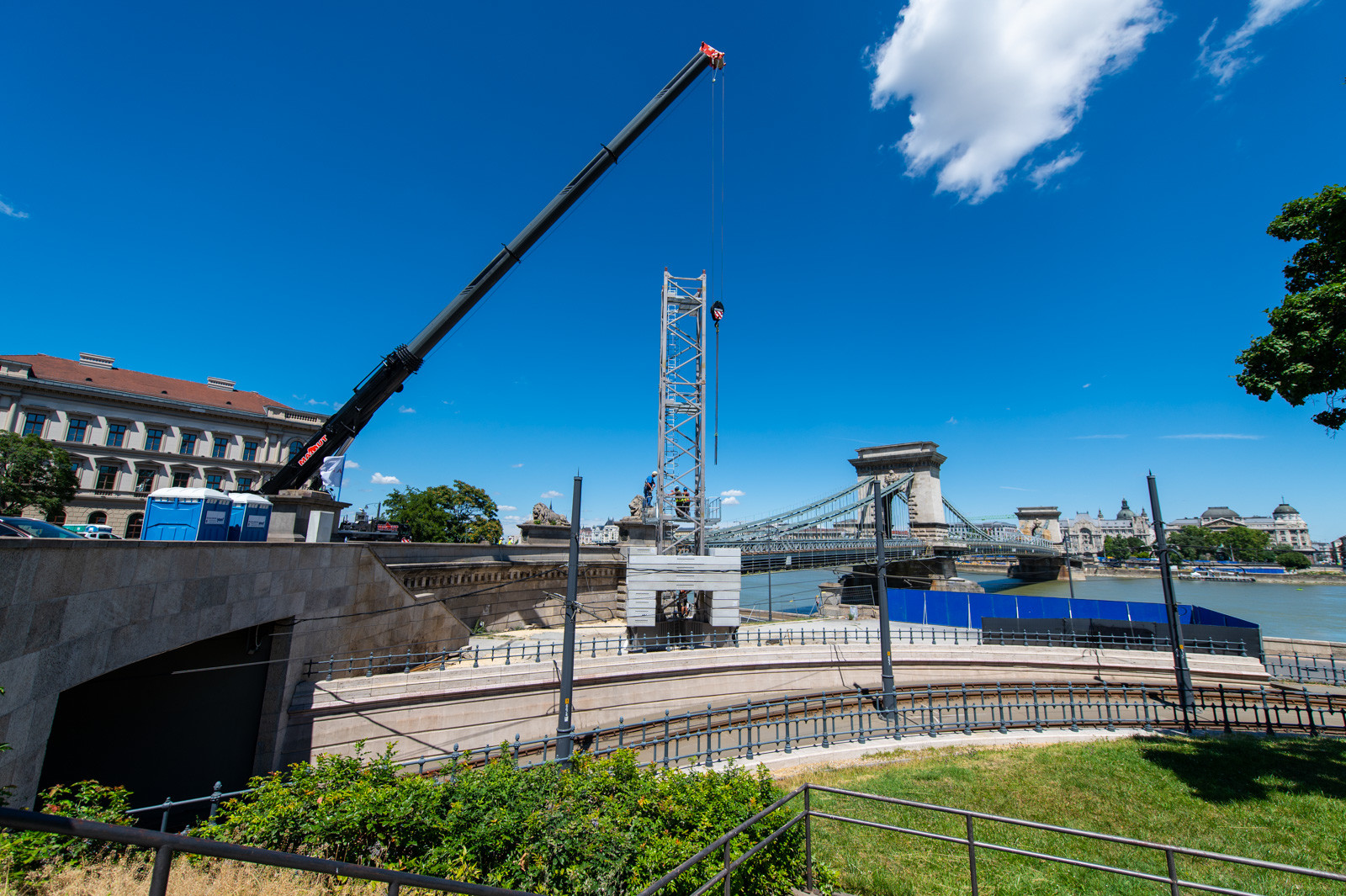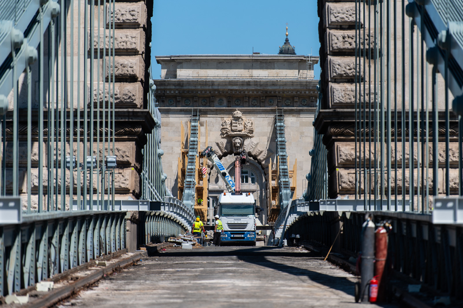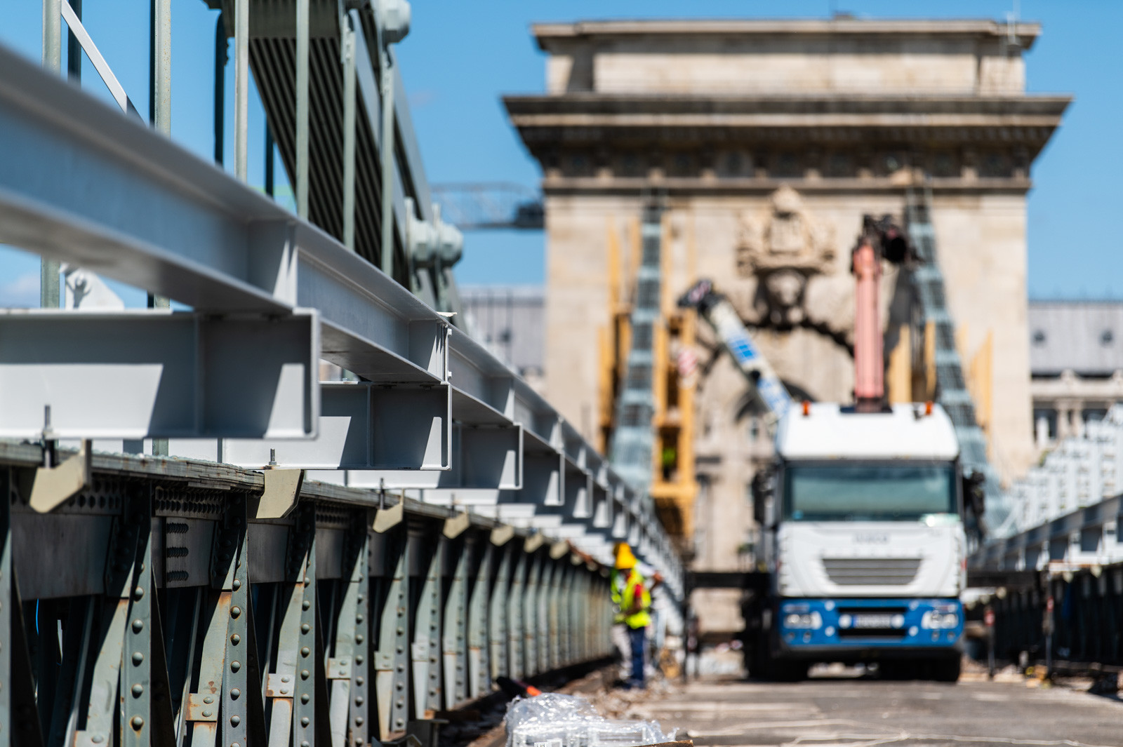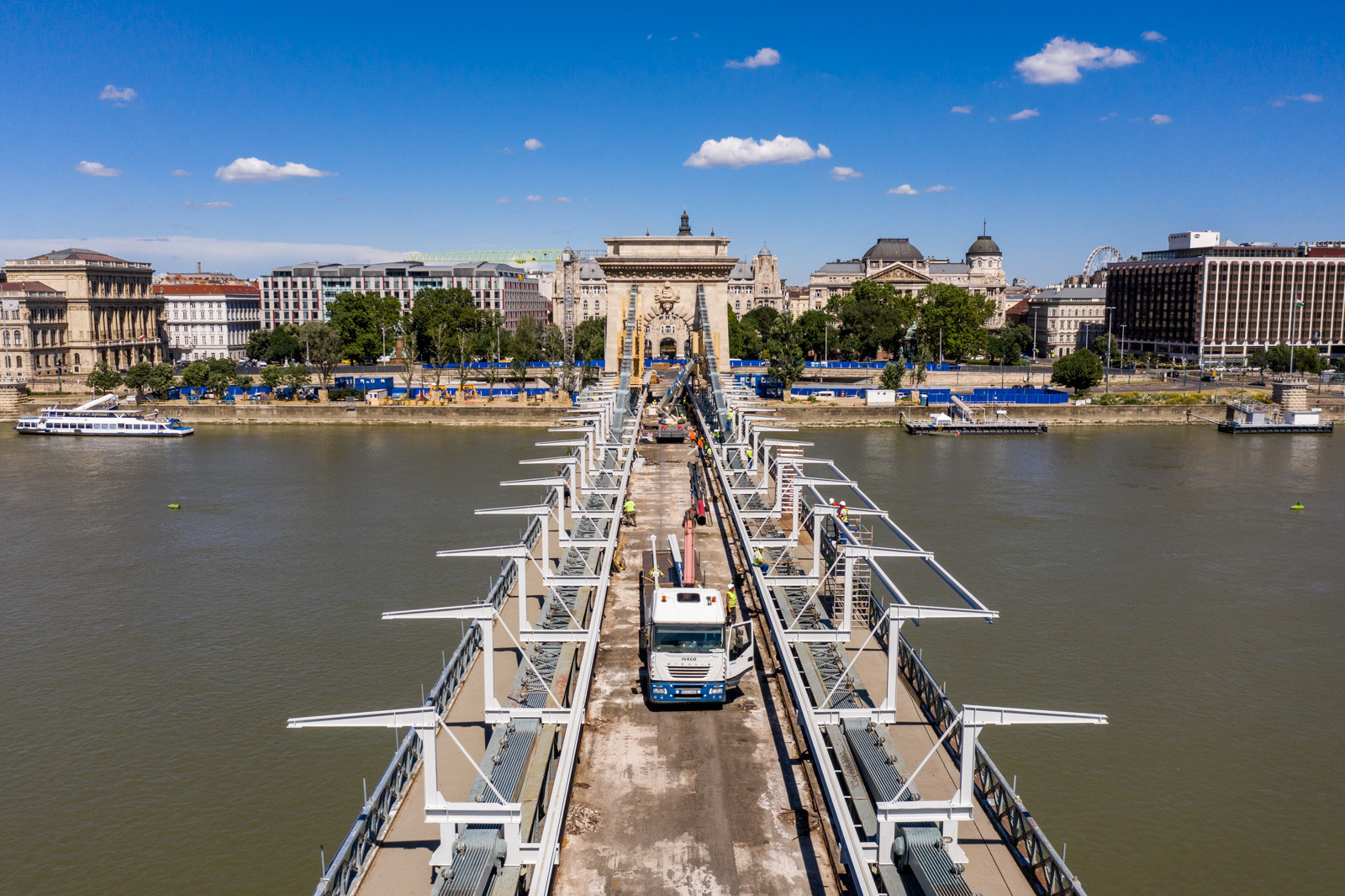 Mindeközben már épül a hídon végigvezető sínpályarendszer, amelyen a Lánchídra telepített két bakdaru közlekedik majd, a középső medernyílásban pedig készül a láncok korrózióvédelméhez szükséges állványzat is. Megkezdődött továbbá még a járdaszegélyek bontása is.