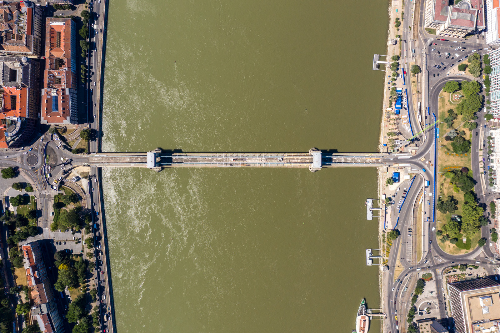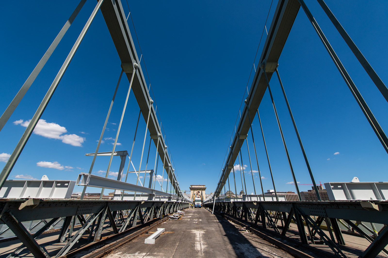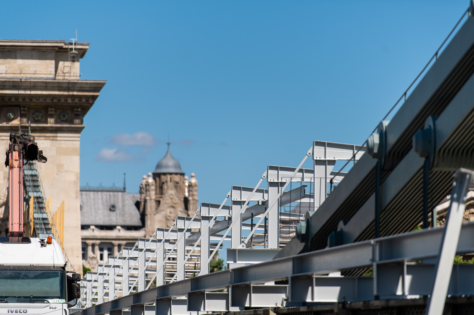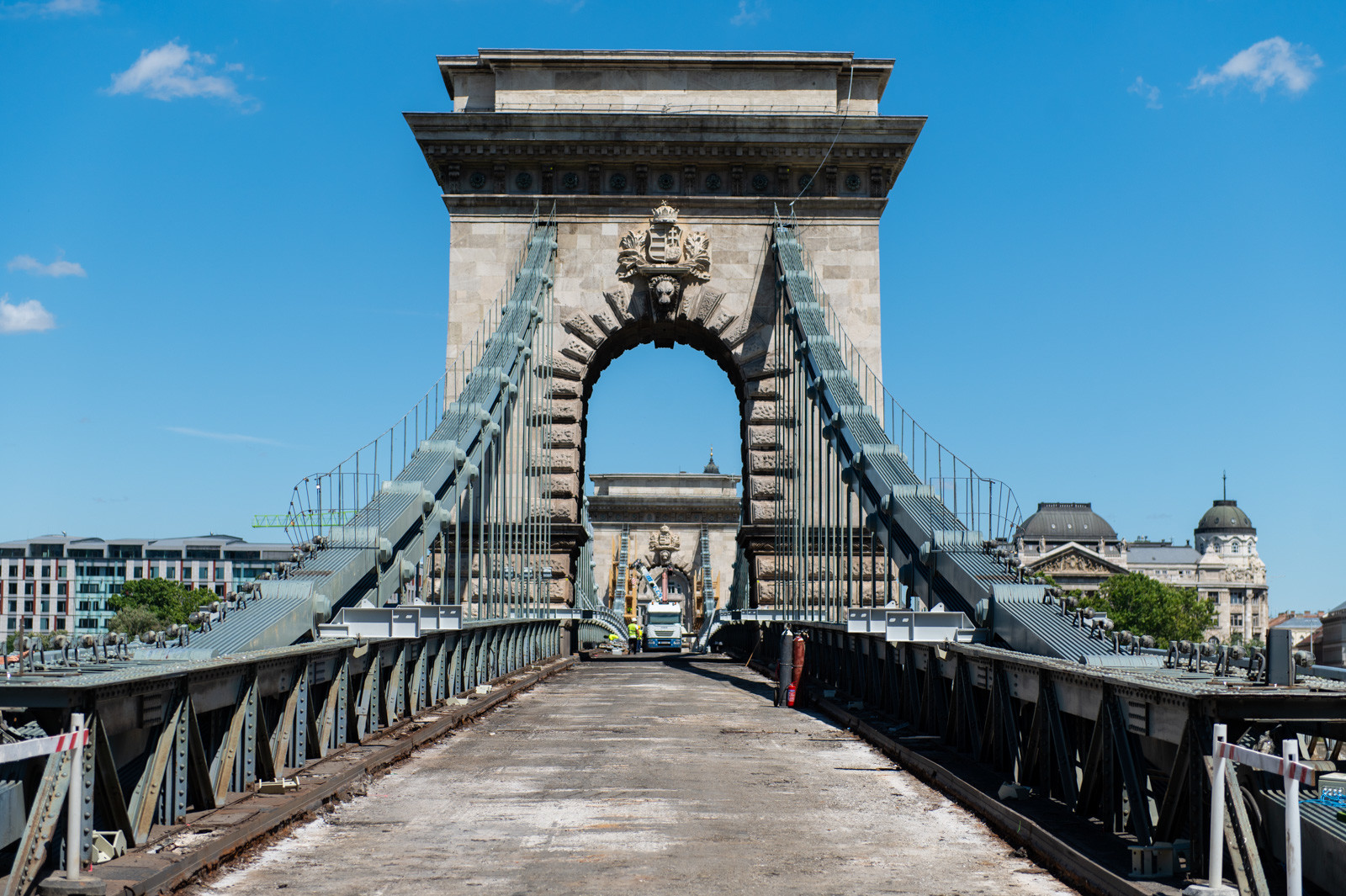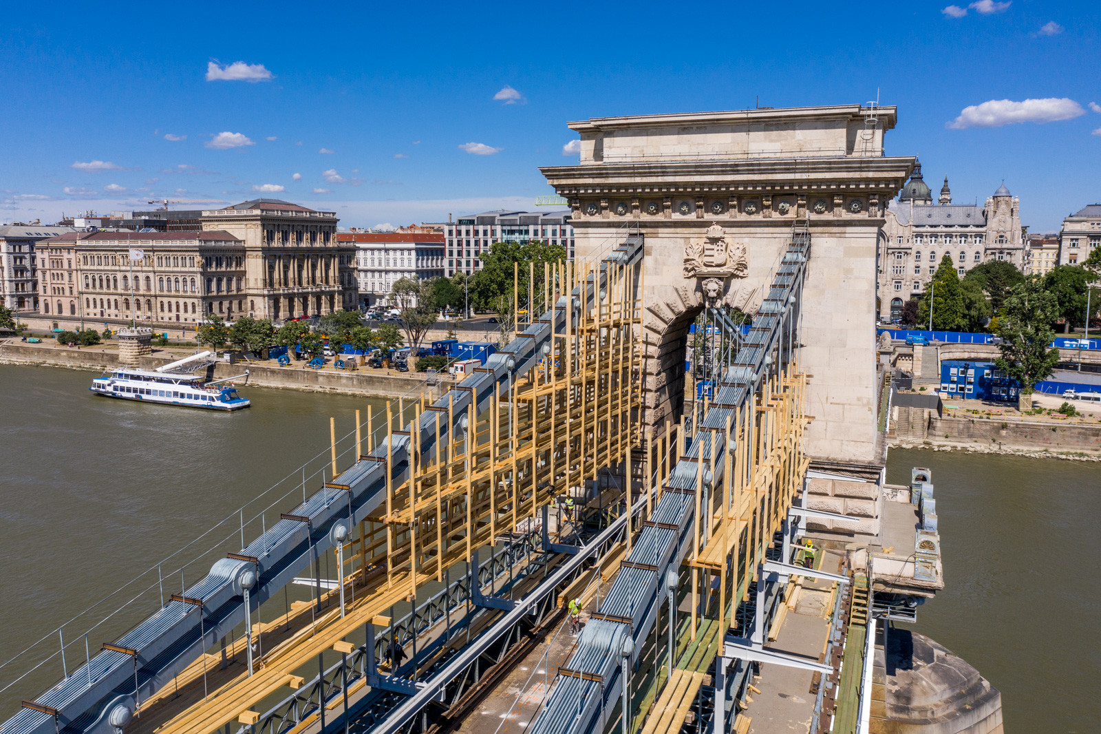 Mindeközben már épül a hídon végigvezető sínpályarendszer, amelyen a Lánchídra telepített két bakdaru közlekedik majd, a középső medernyílásban pedig készül a láncok korrózióvédelméhez szükséges állványzat is. Megkezdődött továbbá még a járdaszegélyek bontása is.