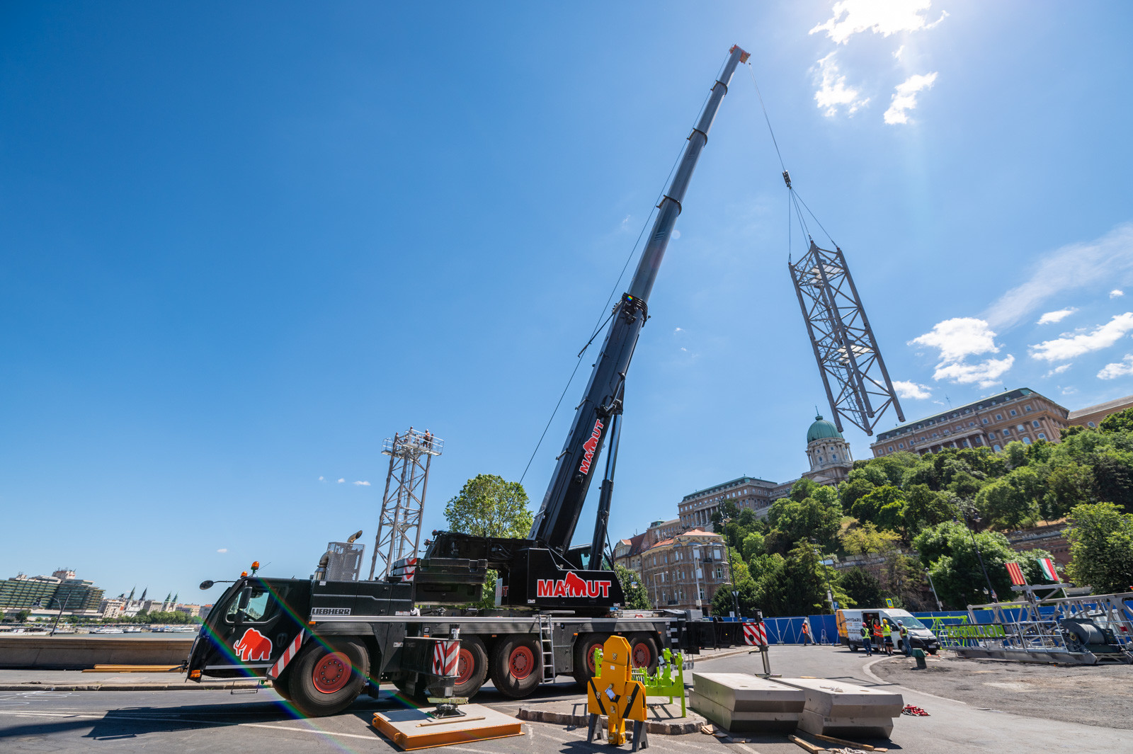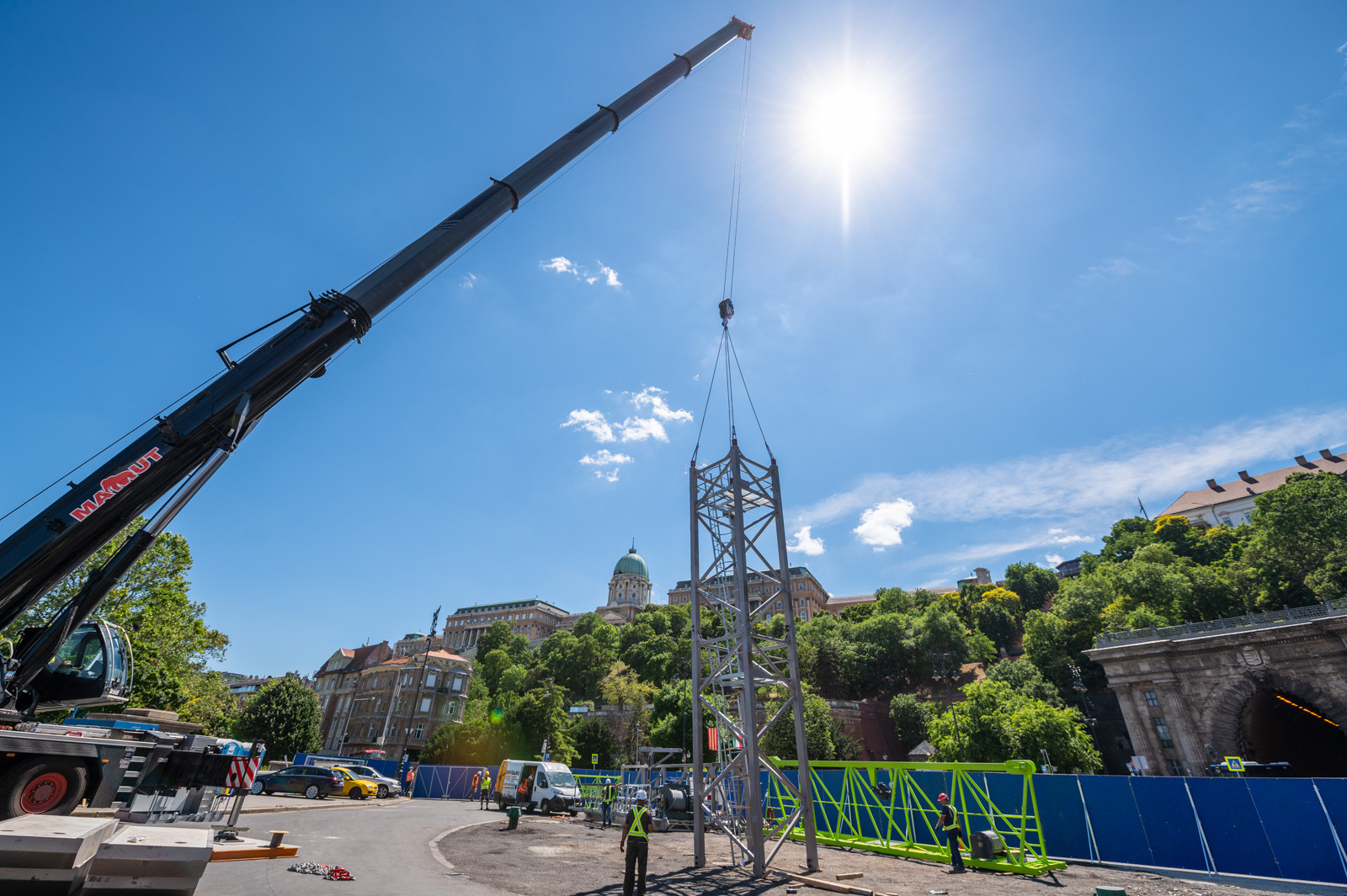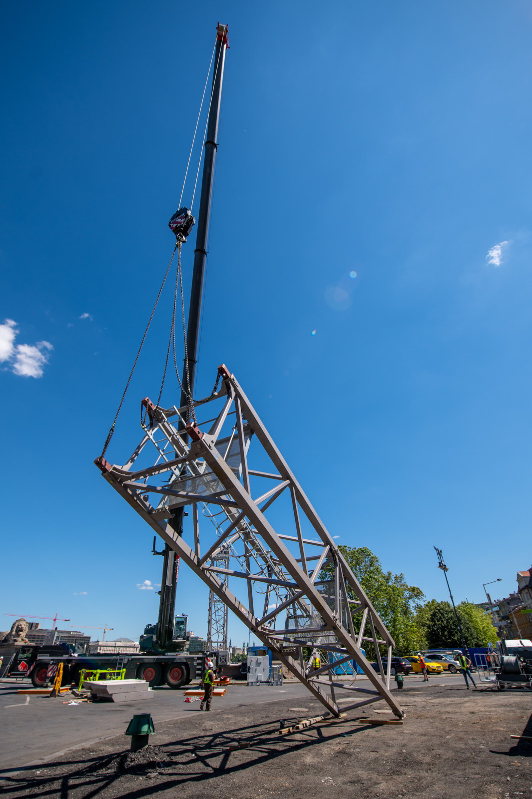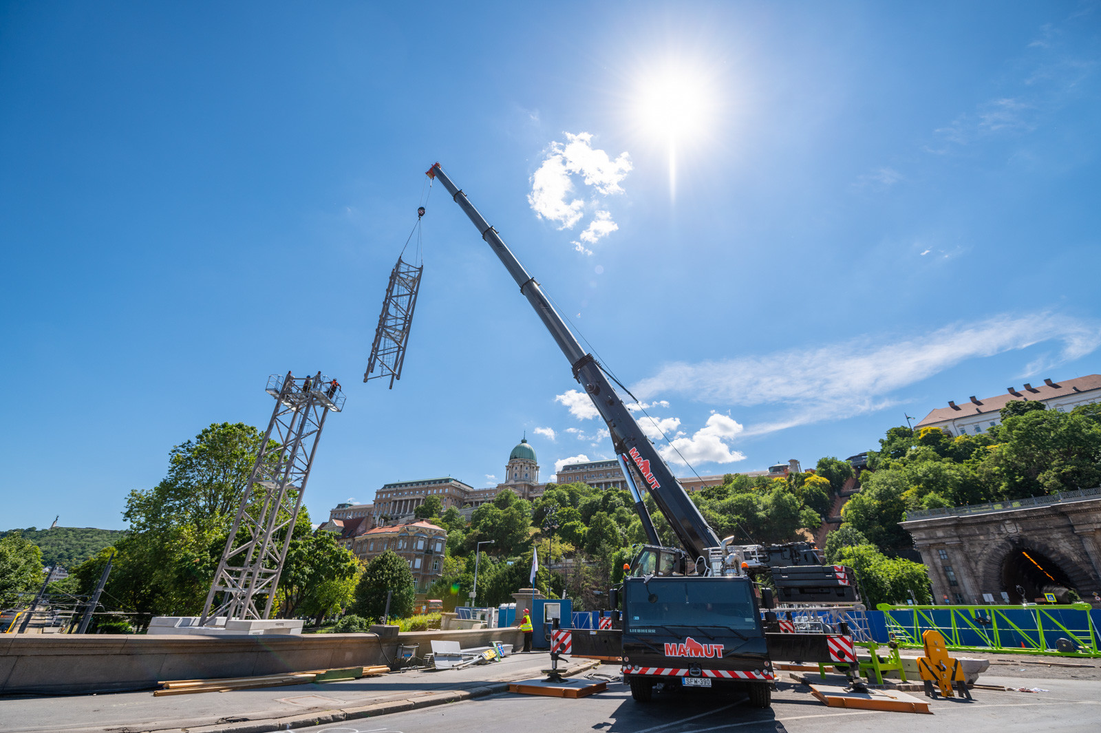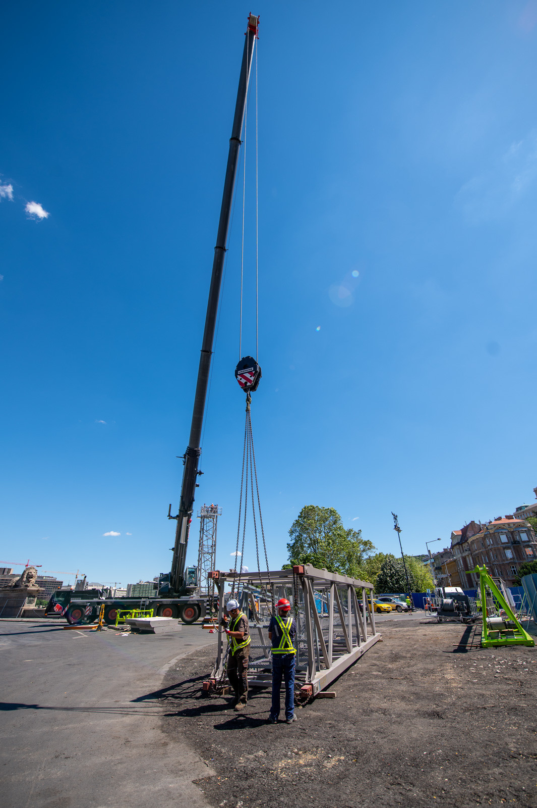 Most ennek a darunak a párját építik fel a budai parton: a 12 tonnás teherbírású gépezetet két napig tart felépíteni, fotósunk azonban már ma délután, a komplex folyamat első napján a helyszínen jártak. Most a torony daru részét állították fel, melynek végső horogmagassága 29,95 méter és a gémje (melyet pénteken szerelnek fel) 45 méterre fog kinyúlni. Mint a pesti daru esetében, most is cölöpözéssel állapították meg a talaj alkalmasságát a szerkezet felállításának megkezdése előtt – derül ki a beruházó Budapesti Közlekedési Központ (BKK) közleményéből.