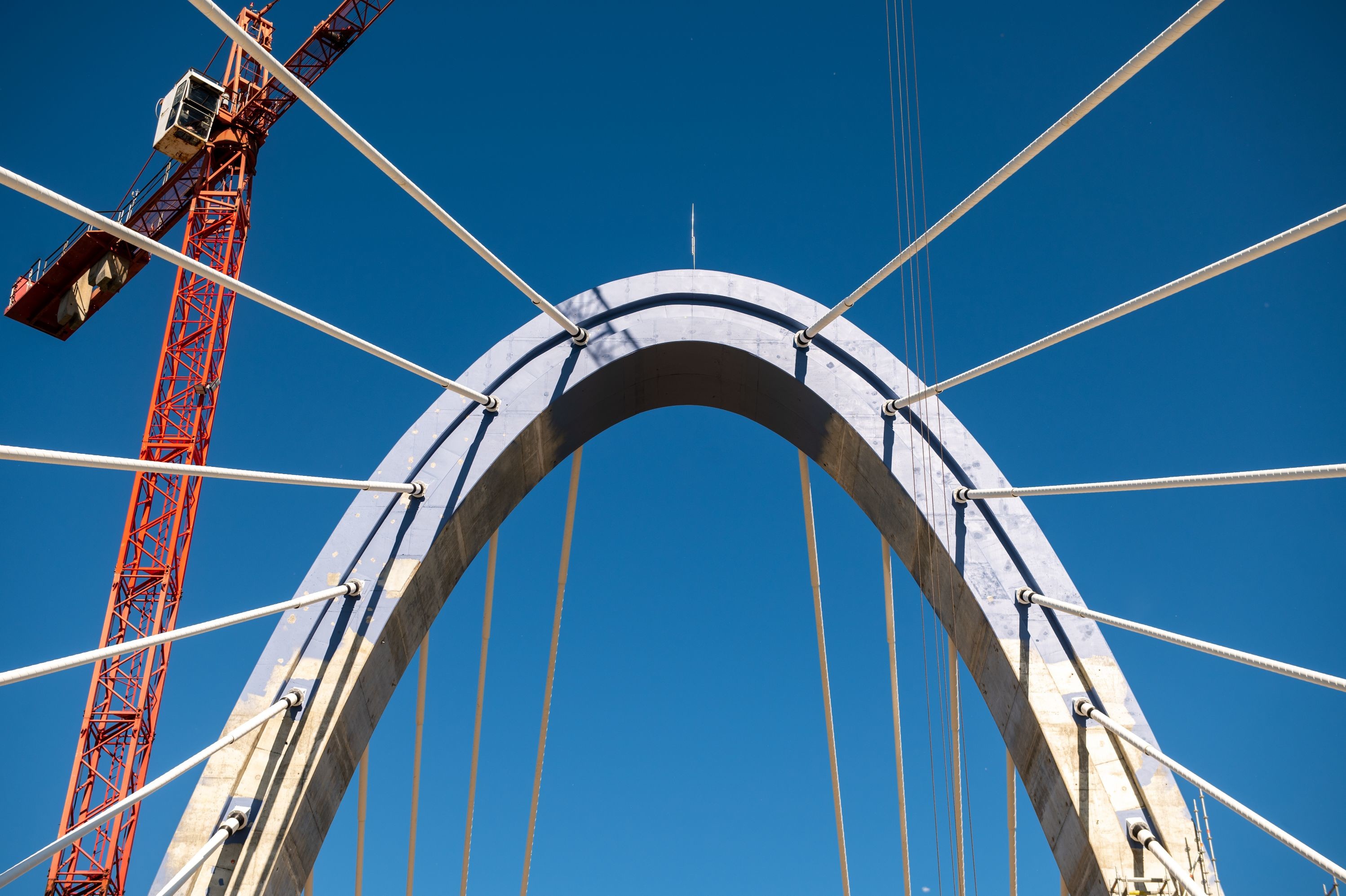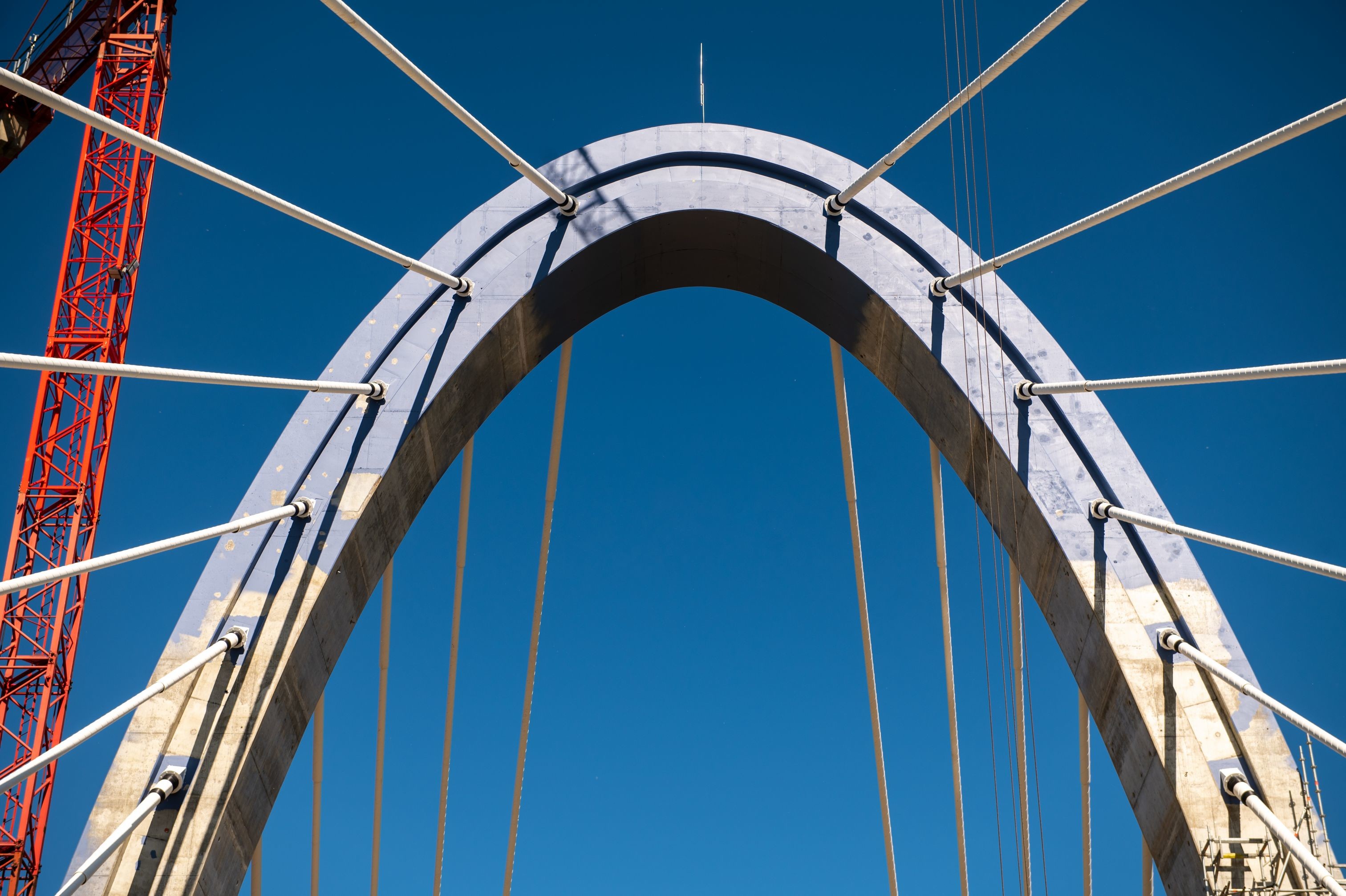 Megkezdték a pilonszárak festését is, ami már előrevetíti a híd végleges megjelenését. A mederhíd pályalemezének építése, illetve a hídszegélyek megépítése után már a befejező szakaszába érkezik a kivitelezés.